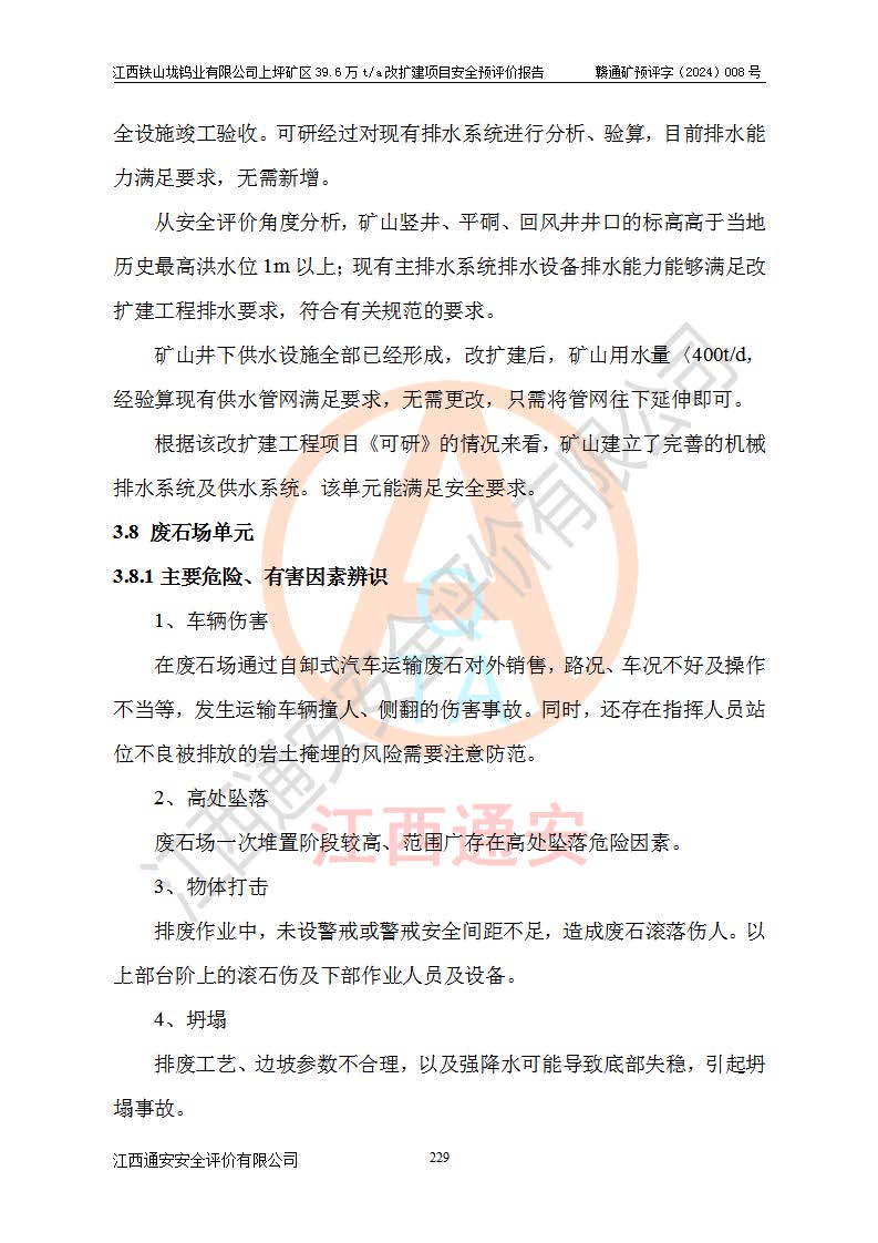 其它 | 江西铁山垅钨业有限公司上坪矿区39.6万t/a改扩建工程存在的主要危险因素有:坍塌、放炮、火药爆炸、**伤害、高处坠落、物体打击、片帮冒顶、触电、机械伤害、火灾、容器爆炸、中毒与窒息、透水、淹溺等。该评价项目中存在的有害因素有:粉尘、噪声与振动、不良作业环境,如高温、采光照明不良对矿山人员的伤害和其他不利的环境因素等。上述主要危险、有害因素在采取本《报告》第4章中及《可研》提出的安全对策措施后,能得到**控制,则江西铁山垅钨业有限公司上坪矿区39.6万t/a改扩建工程符合**有关法律法规、规章、标准和规范要求。 | ||||