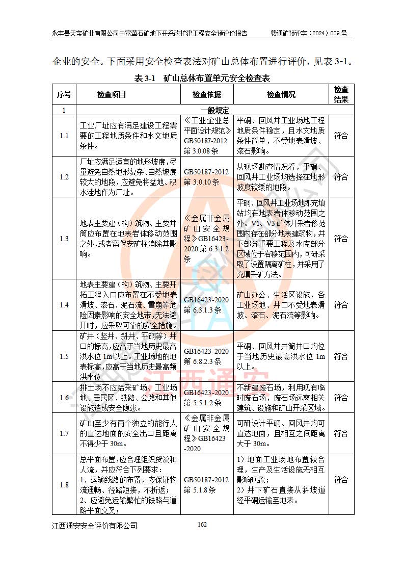 其它 | 永丰县天宝矿业有限公司中富萤石矿地下开采改扩建工程存在的主要危险因素有:坍塌、放炮、火药爆炸、**伤害、高处坠落、物体打击、片帮冒顶、触电、机械伤害、火灾、容器爆炸、中毒与窒息、透水、淹溺等。该评价项目中存在的有害因素有:粉尘、噪声与振动、不良作业环境,如高温、采光照明不良对矿山人员的伤害和其他不利的环境因素等。上述主要危险、有害因素在采取本《报告》第4章中及《可研》、《隐蔽致灾普查治理报告》提出的安全对策措施后,能得到**控制,则永丰县天宝矿业有限公司中富萤石矿地下开采改扩建工程符合**有关法律、法规、规章、标准和规范要求。 | ||||