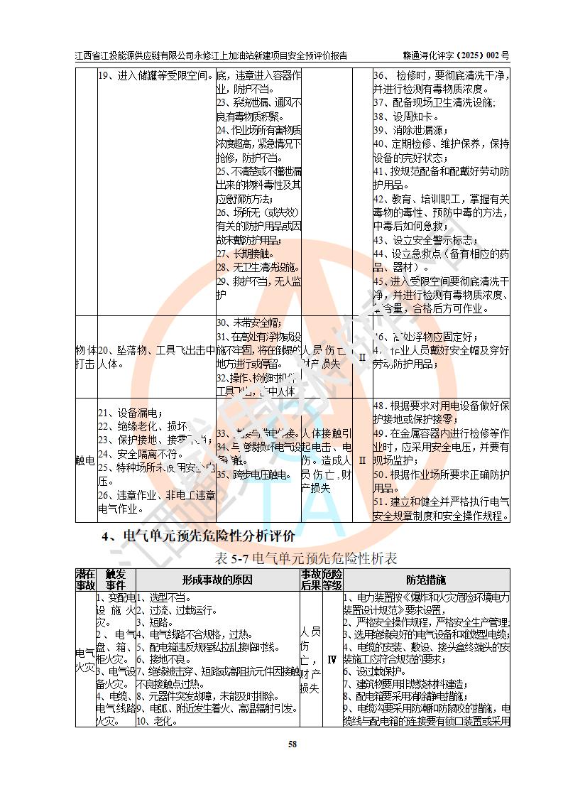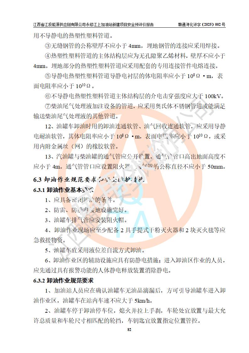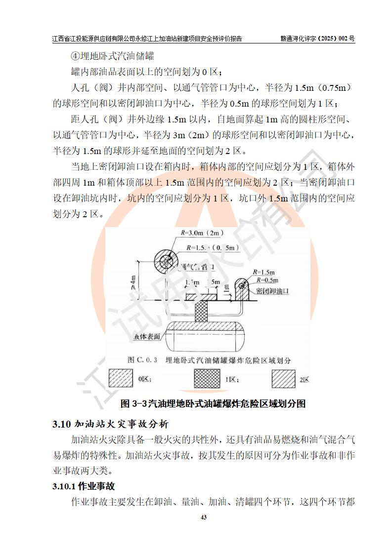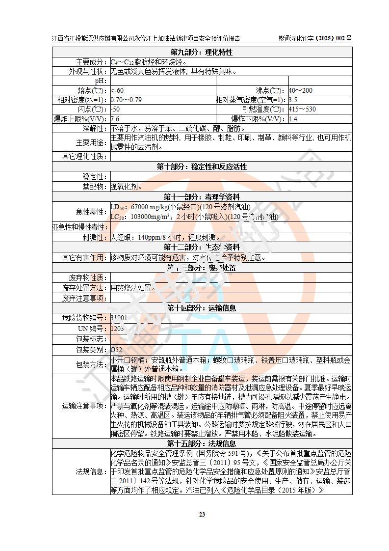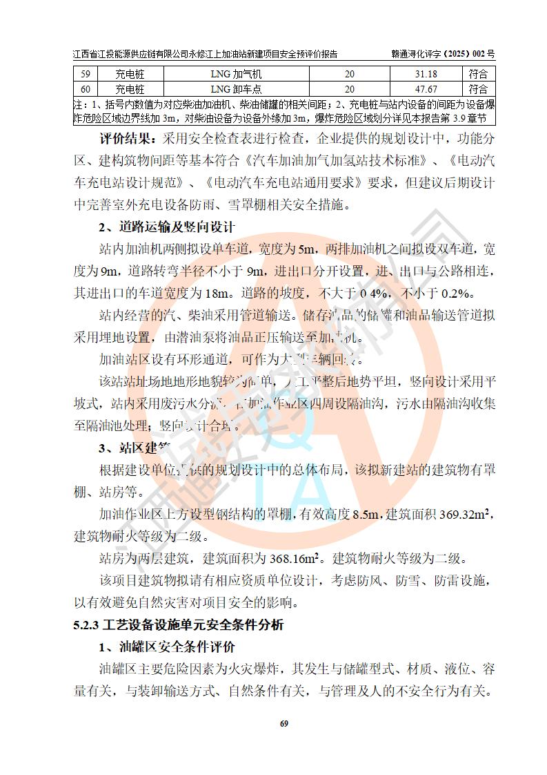 评价结论 | 江西省江投能源供应链有限公司永修江上加油站新建项目的选址、自然条件适宜该项目工程的建设;项目规划设计中的总体布局方案可行,符合有关法规、标准要求;项目选择的工艺过程及设备设施的安全可靠性能达到**法规、标准规定要求;项目存在的危险有害因素可控,在落实项目建设方案及评价报告提出的有关安全对策措施后,其危险有害程度能达到可以接受的程度,项目建设能够实现安全运行的目标。 | |||