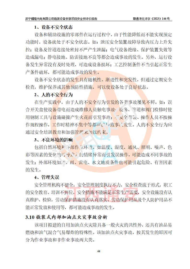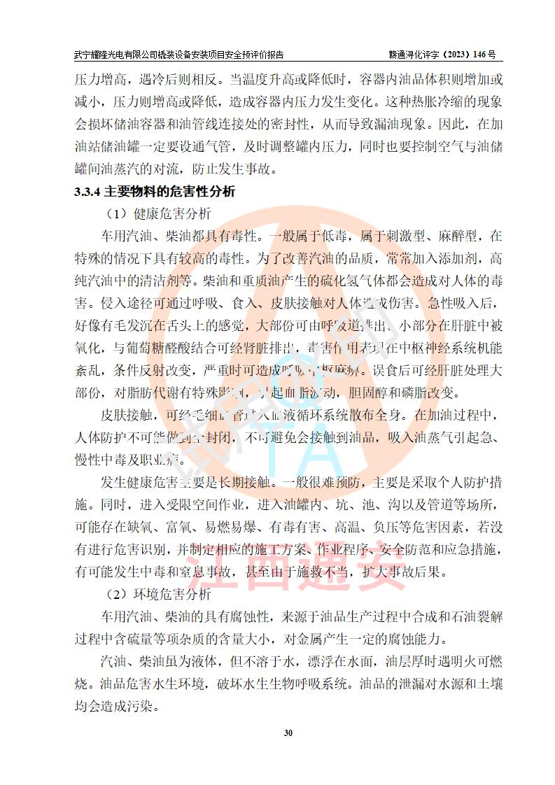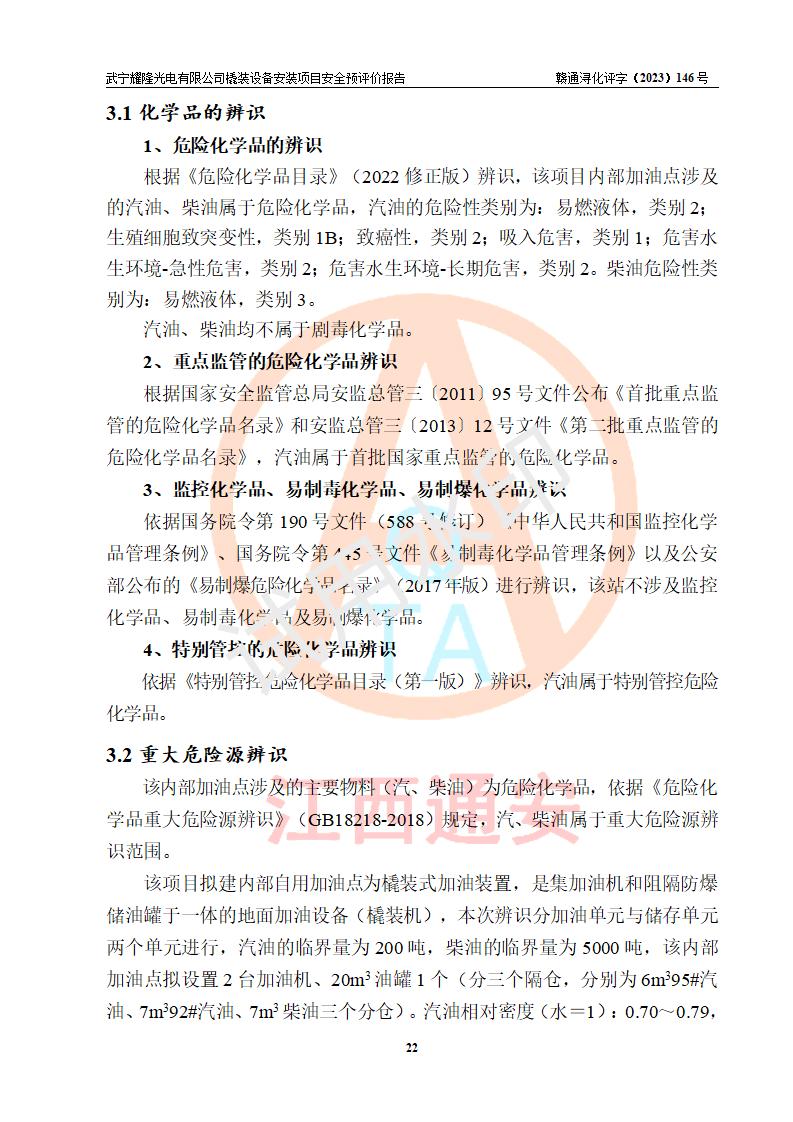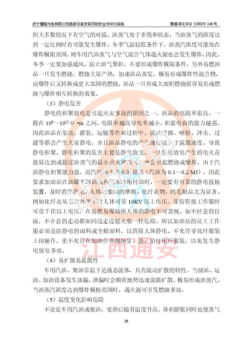 项目简介 | 武宁耀隆光电有限公司,成立于2013年07月04日。公司地址位于江西省九江市武宁县万福工业园。经营范围:节能灯、照明电器、LED照明、灯具配件、销售(以上项目**有专项规定的凭**许可证经营)。 武宁耀隆光电有限公司为了满足公司自用**内部加油的需要,拟在九江市武宁县万福工业园武宁耀隆光电有限公司自有厂区用地红线内的南侧闲置空地新建一处企业自用橇装式加油装置,该企业自用橇装式加油装置拟采用的加油装置为阻隔防爆橇装式加油装置,是集加油机、阻隔防爆储油罐、阻隔防爆油气回收装置和自动灭火器于一体的地面加油设备(橇装机),属于成套装置。该项目阻隔防爆橇装式加油装置拟设置阻隔防爆储罐1个(APT-标准双层防爆罐),总容量为20m3 该项目拟建内部自用加油点涉及的汽油、柴油为易燃液体,属于《危险化学品目录》([2022]第8号公告修改)内危险化学品,汽油还属于**重点监管和特别管控的危险化学品。 该项目拟建内部加油点不涉及剧毒品、监控化学品、易制毒化学品、易制爆化学品。 该加油站点涉及的汽油属于《危险化学品重大危险源辨识》范围内物质,其加油单元与储存单元均未*过规定的临界量,未构成危险化学品重大危险源。 | |||
