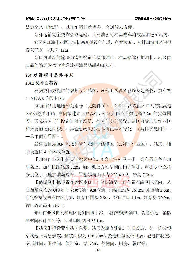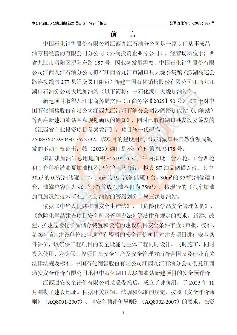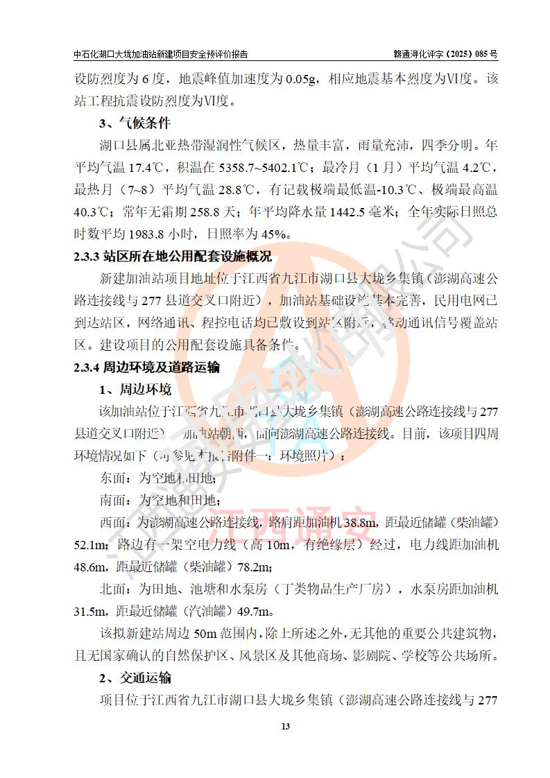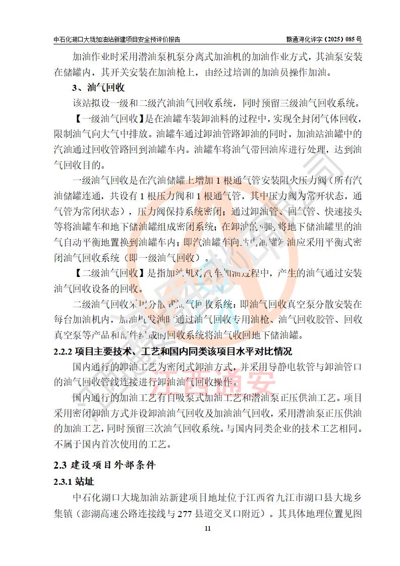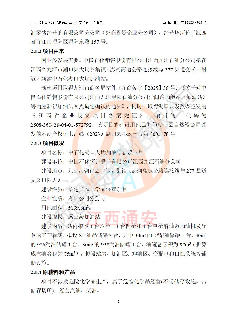 项目简介 | 因业务发展需要,中国石化销售股份有限公司江西九江石油分公司拟在江西省九江市湖口县大垅乡集镇(澎湖高速公路连接线与277县道交叉口附近)新建中国石化销售股份有限公司江西九江湖口石油分公司大垅加油站。 新建项目取得九江市商务局文件(九商务字【2025】50号)《关于对中国石化销售股份有限公司江西九江浔阳石油分公司沙阎路加能站(加油站)等两座新建加油站网点规划确认的通知》,同时已取得湖口县发改委签发的《江西省企业投资项目备案凭证》,项目统一代码为2508-360429-04-01-572792,该项目的建设用地已取得湖口县自然资源局颁发的不动产权证书:赣(2023)湖口县不动产权第0003178号。 拟新建加油站总用地面积为5199.30m2,站内拟设1台六枪、1台四枪和1台单枪潜油泵加油机及配套的工艺管线,拟设SF油品储罐3台,其中30m3的0#柴油储罐1台、30m3的92#汽油储罐1台、30m3的95#汽油储罐1台,油罐总容积为90m3(折算成汽油容积为75m3),按现行的《汽车加油加气加氢站技术标准》对加油站的等级划分,属三级加油站。 | |||