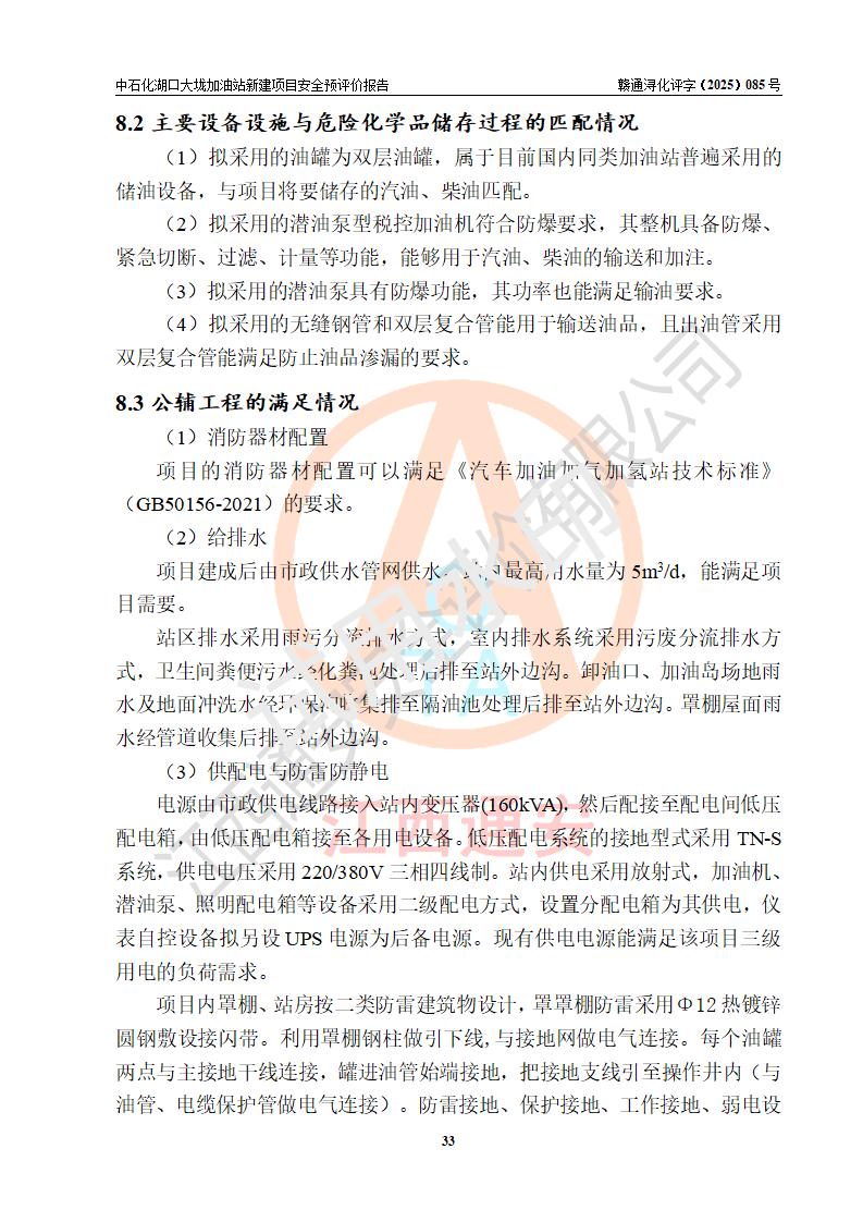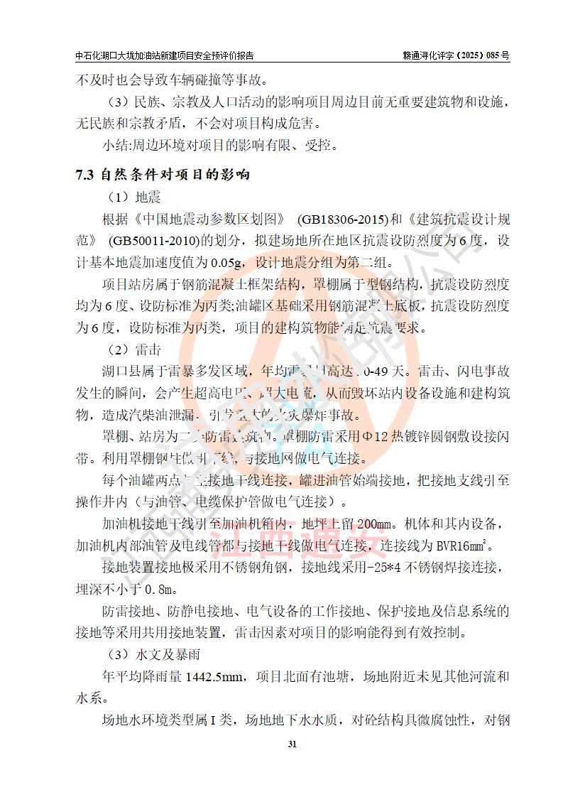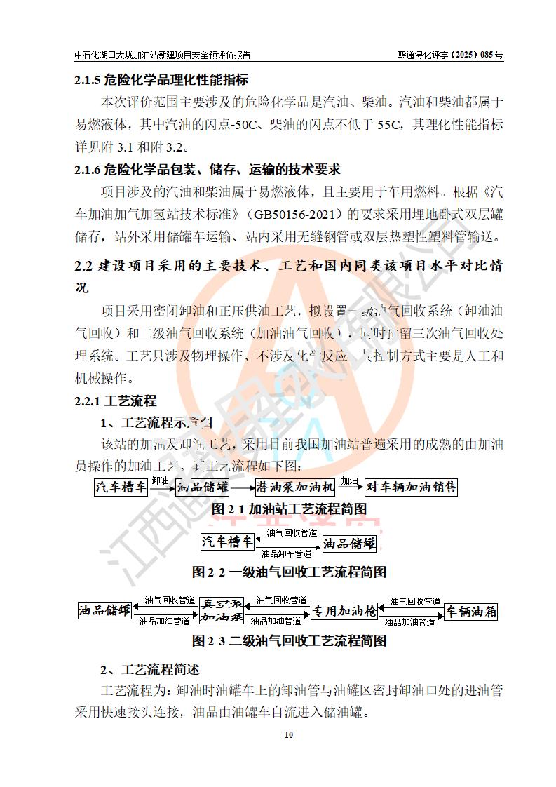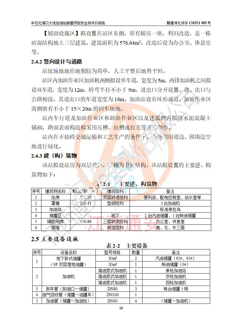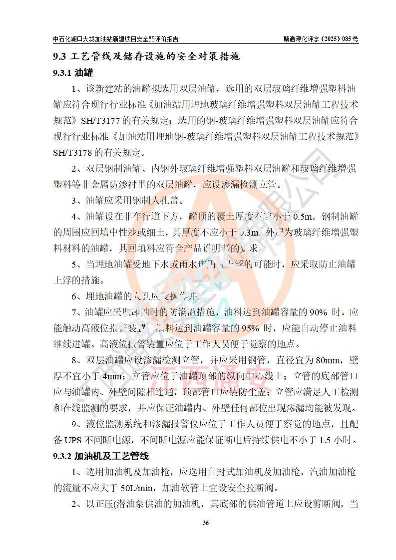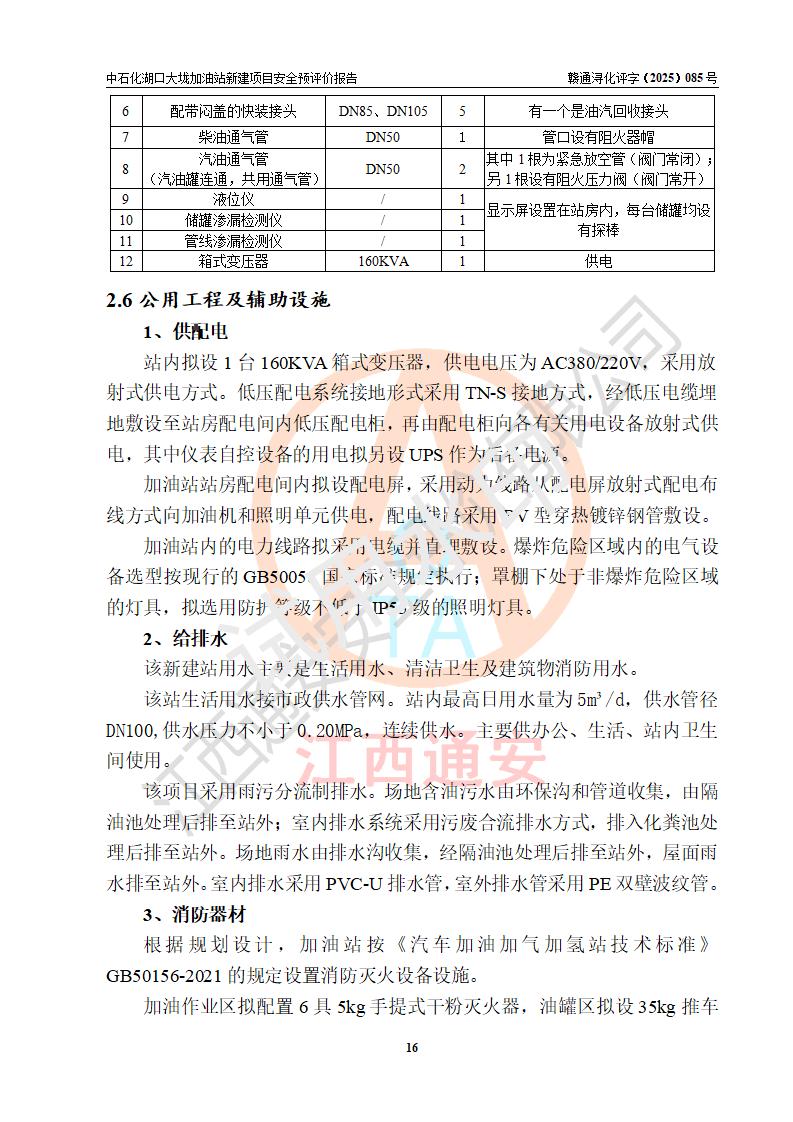 项目简介 | 因业务发展需要,中国石化销售股份有限公司江西九江石油分公司拟在江西省九江市湖口县大垅乡集镇(澎湖高速公路连接线与277县道交叉口附近)新建中国石化销售股份有限公司江西九江湖口石油分公司大垅加油站。 新建项目取得九江市商务局文件(九商务字【2025】50号)《关于对中国石化销售股份有限公司江西九江浔阳石油分公司沙阎路加能站(加油站)等两座新建加油站网点规划确认的通知》,同时已取得湖口县发改委签发的《江西省企业投资项目备案凭证》,项目统一代码为2508-360429-04-01-572792,该项目的建设用地已取得湖口县自然资源局颁发的不动产权证书:赣(2023)湖口县不动产权第0003178号。 拟新建加油站总用地面积为5199.30m2,站内拟设1台六枪、1台四枪和1台单枪潜油泵加油机及配套的工艺管线,拟设SF油品储罐3台,其中30m3的0#柴油储罐1台、30m3的92#汽油储罐1台、30m3的95#汽油储罐1台,油罐总容积为90m3(折算成汽油容积为75m3),按现行的《汽车加油加气加氢站技术标准》对加油站的等级划分,属三级加油站。 | |||