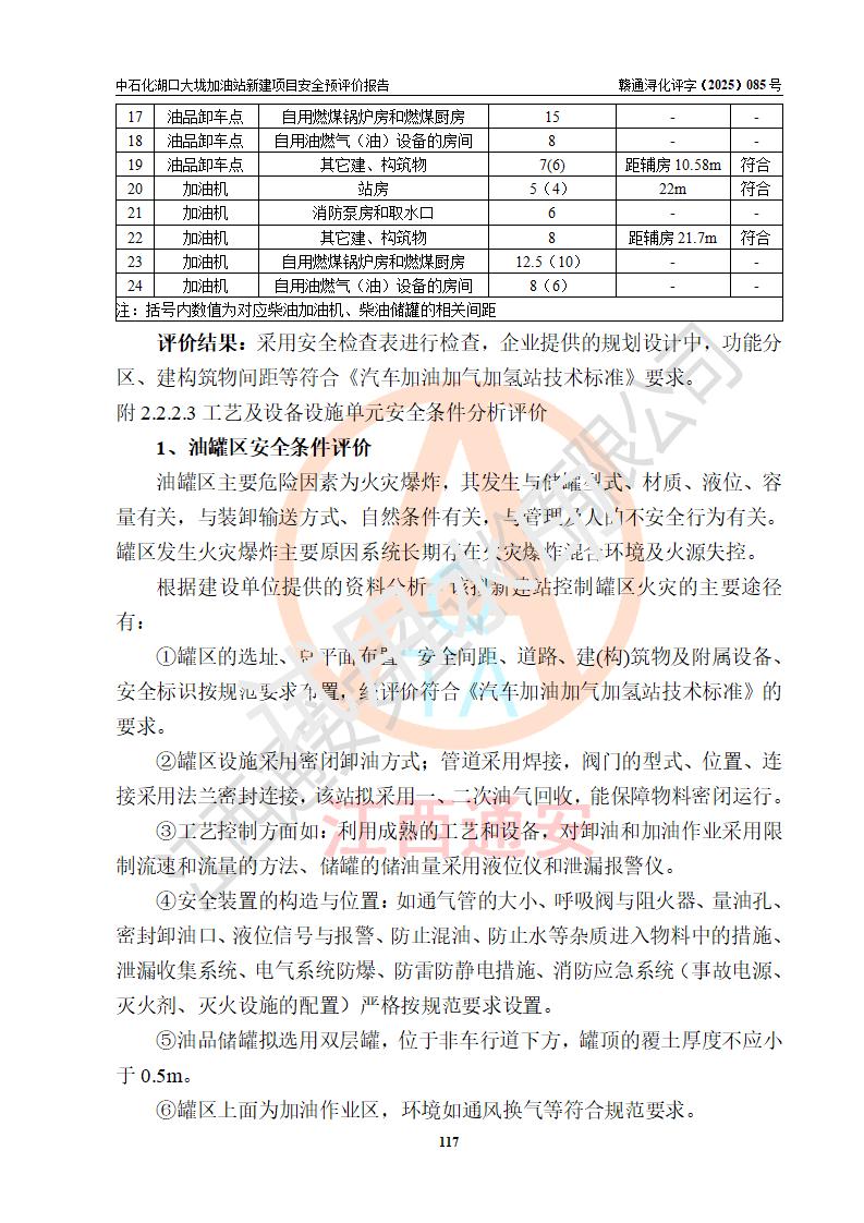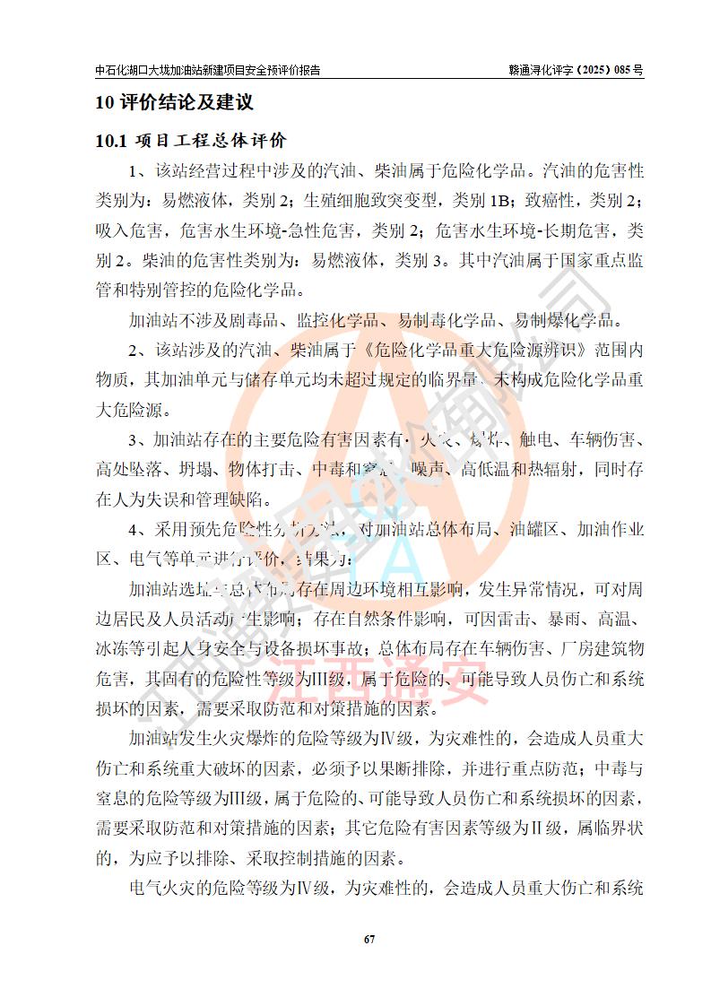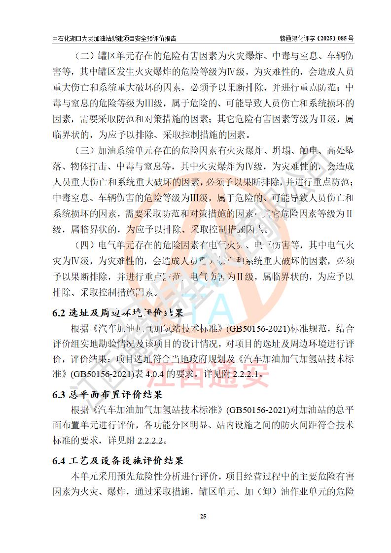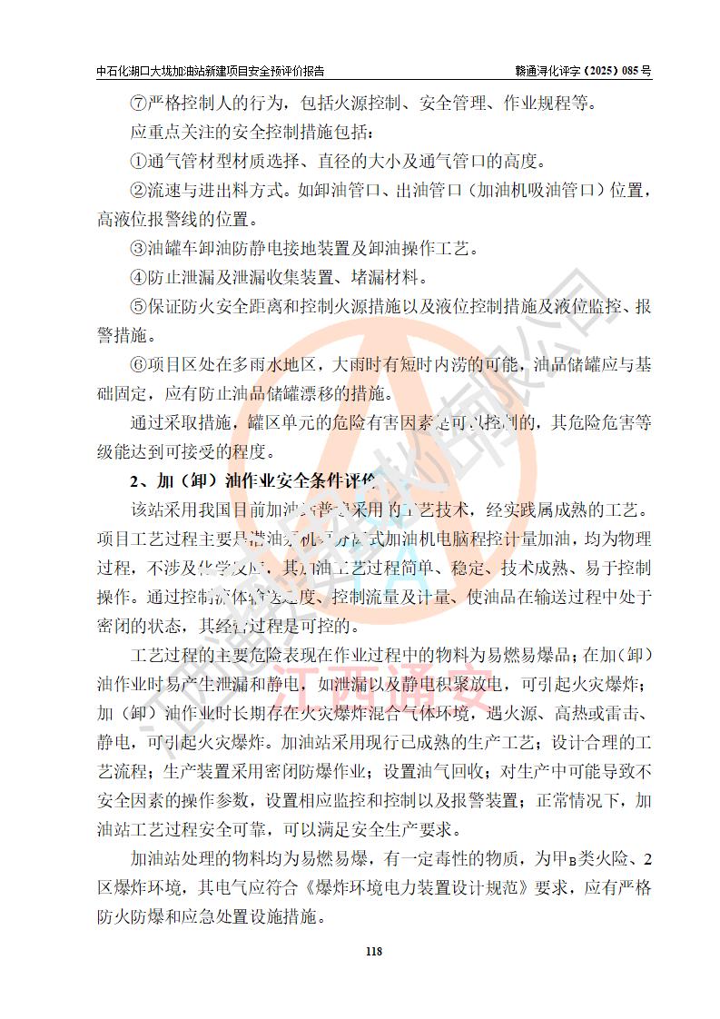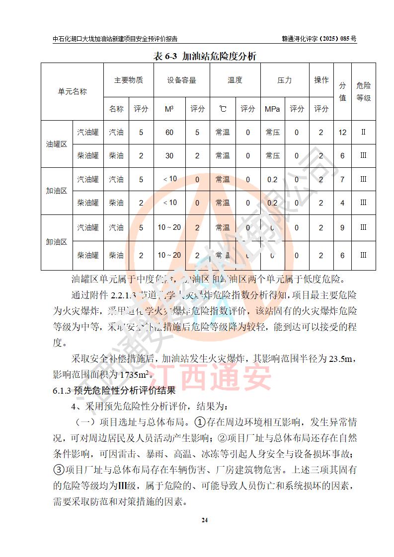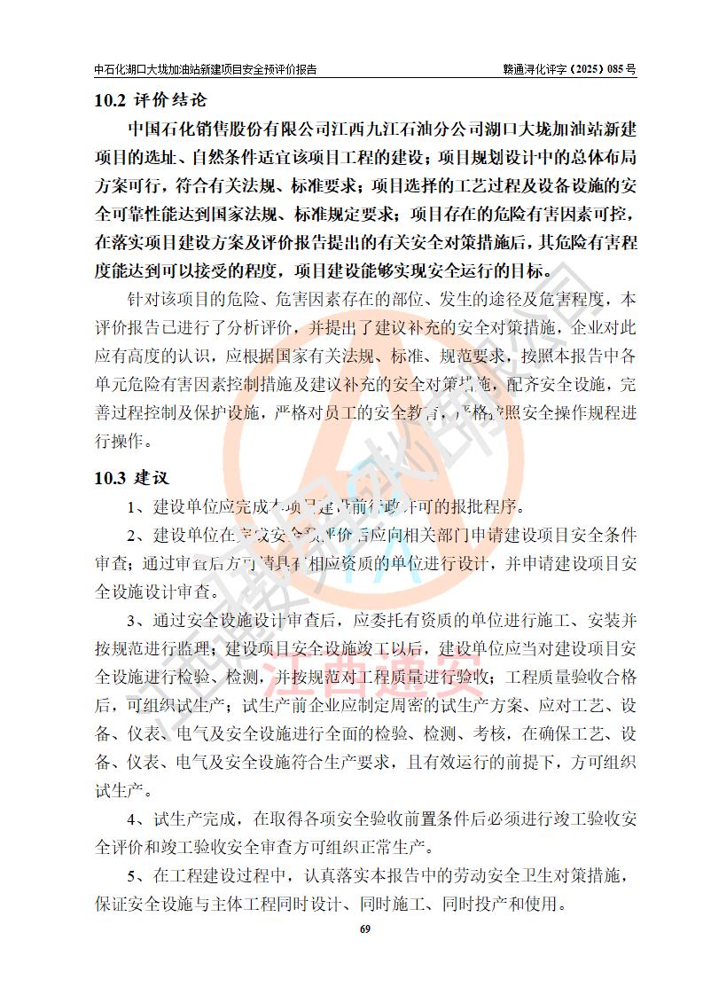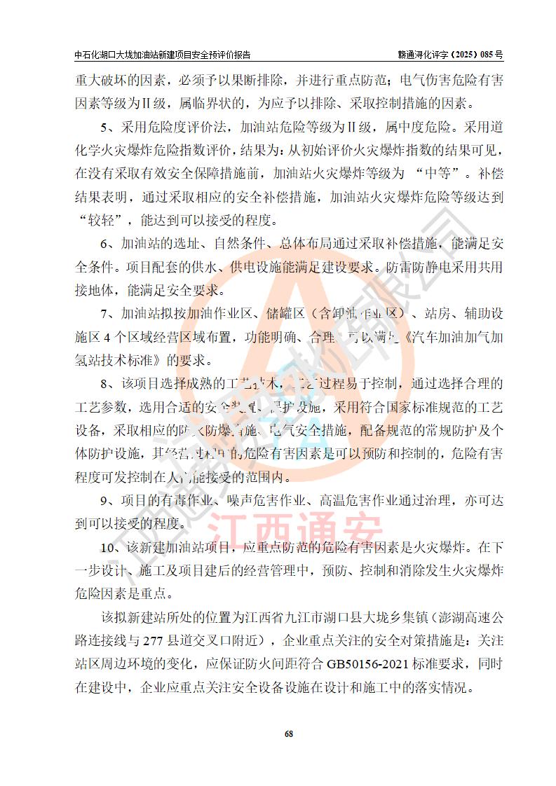 评价结论 | 中国石化销售股份有限公司江西九江石油分公司湖口大垅加油站新建项目的选址、自然条件适宜该项目工程的建设;项目规划设计中的总体布局方案可行,符合有关法规、标准要求;项目选择的工艺过程及设备设施的安全可靠性能达到**法规、标准规定要求;项目存在的危险有害因素可控,在落实项目建设方案及评价报告提出的有关安全对策措施后,其危险有害程度能达到可以接受的程度,项目建设能够实现安全运行的目标。 | |||