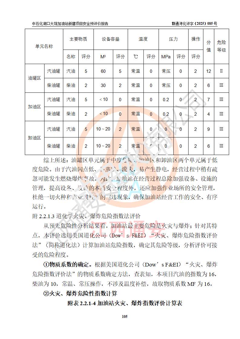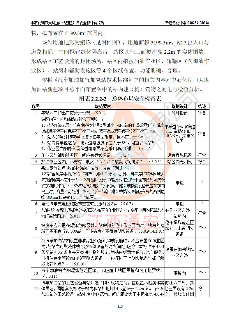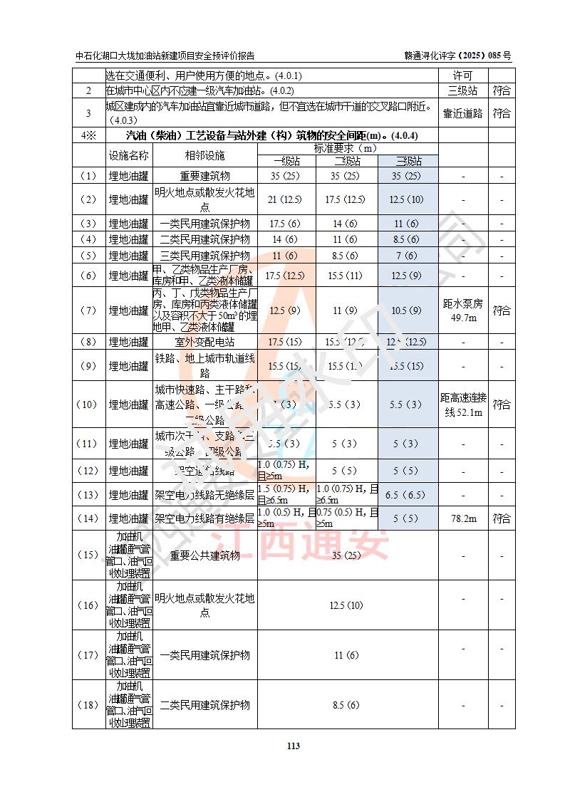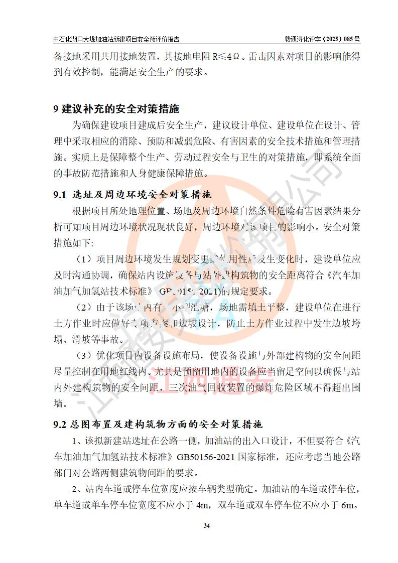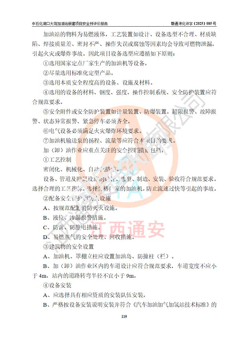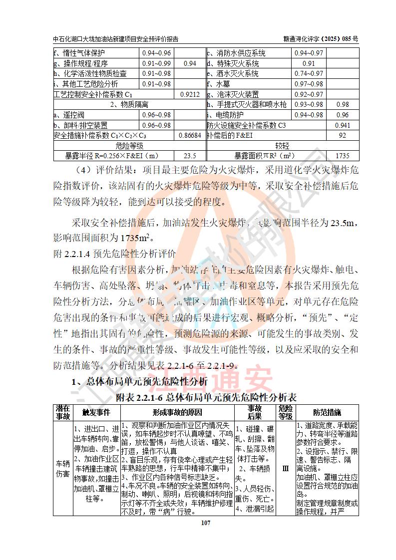 评价结论 | 中国石化销售股份有限公司江西九江石油分公司湖口大垅加油站新建项目的选址、自然条件适宜该项目工程的建设;项目规划设计中的总体布局方案可行,符合有关法规、标准要求;项目选择的工艺过程及设备设施的安全可靠性能达到**法规、标准规定要求;项目存在的危险有害因素可控,在落实项目建设方案及评价报告提出的有关安全对策措施后,其危险有害程度能达到可以接受的程度,项目建设能够实现安全运行的目标。 | |||