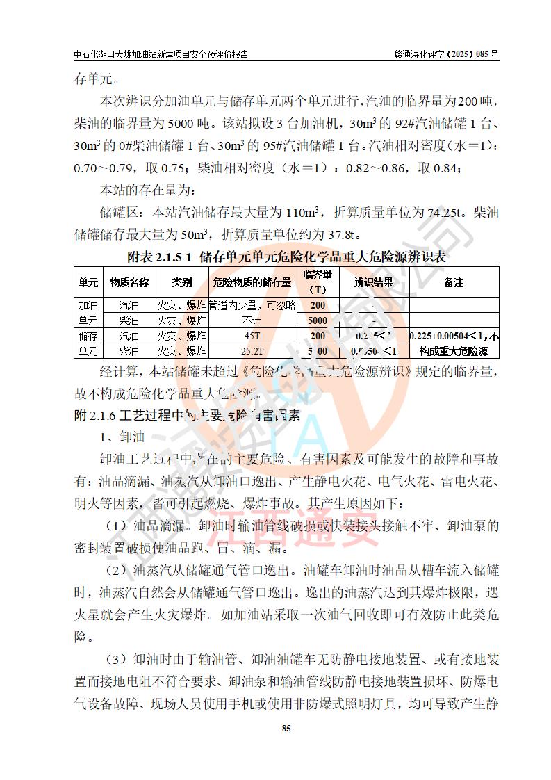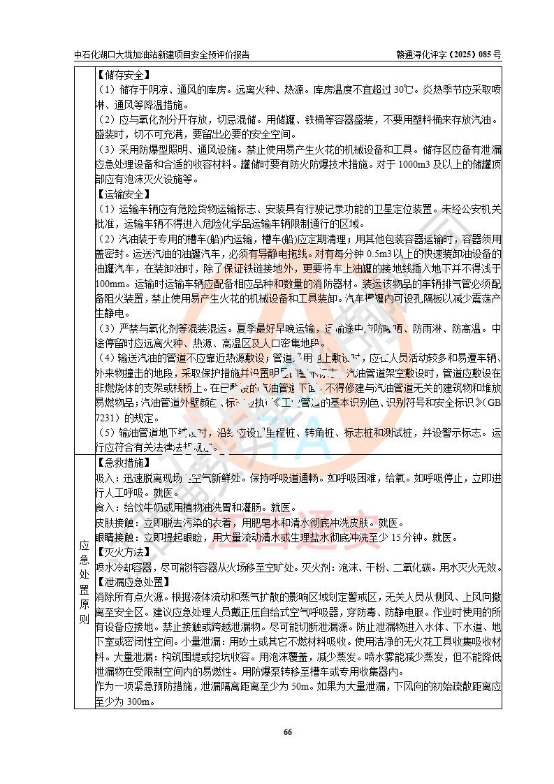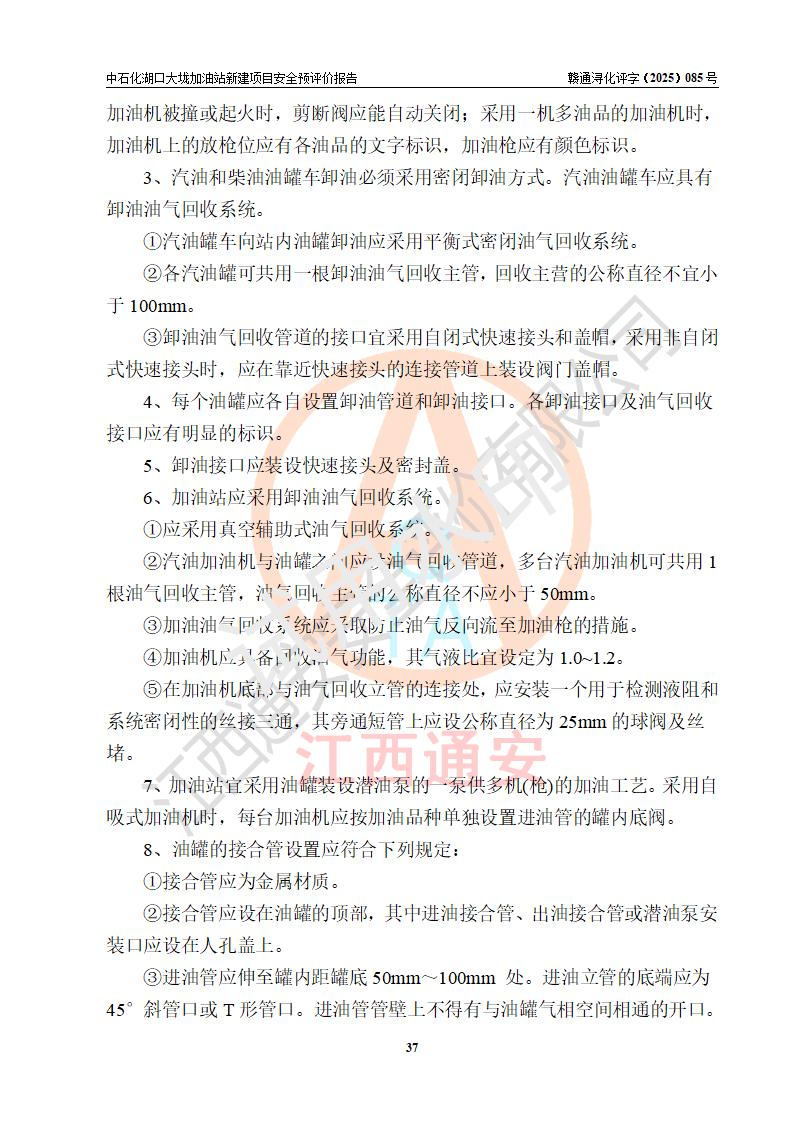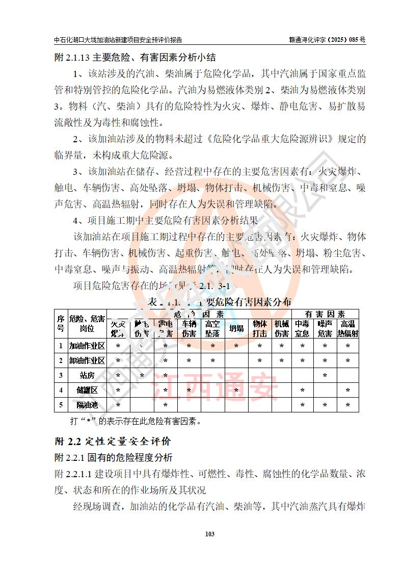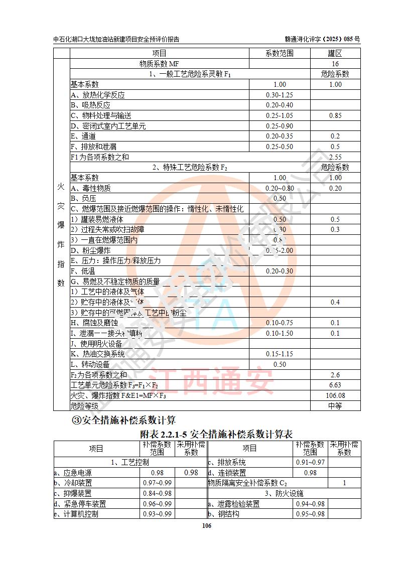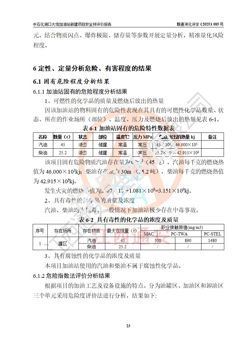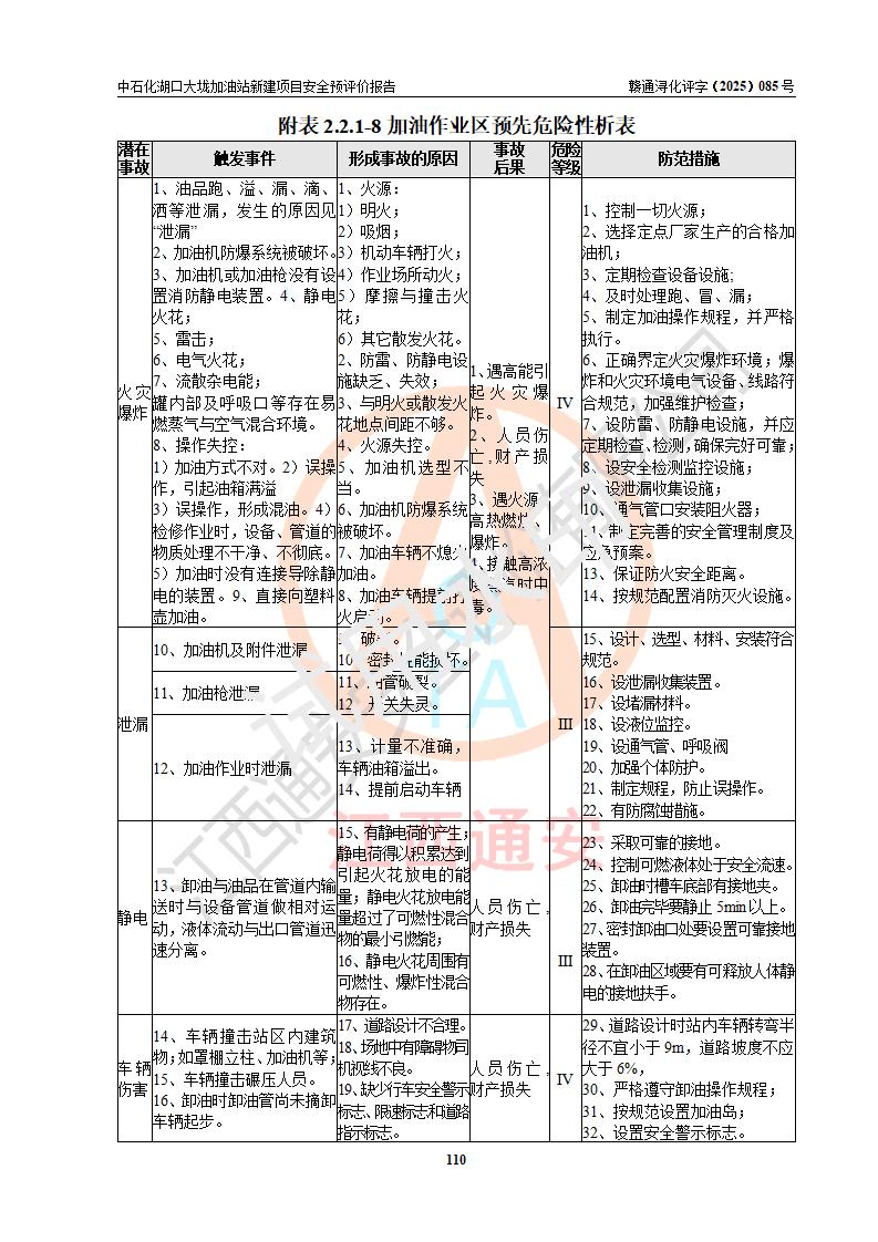 评价结论 | 中国石化销售股份有限公司江西九江石油分公司湖口大垅加油站新建项目的选址、自然条件适宜该项目工程的建设;项目规划设计中的总体布局方案可行,符合有关法规、标准要求;项目选择的工艺过程及设备设施的安全可靠性能达到**法规、标准规定要求;项目存在的危险有害因素可控,在落实项目建设方案及评价报告提出的有关安全对策措施后,其危险有害程度能达到可以接受的程度,项目建设能够实现安全运行的目标。 | |||