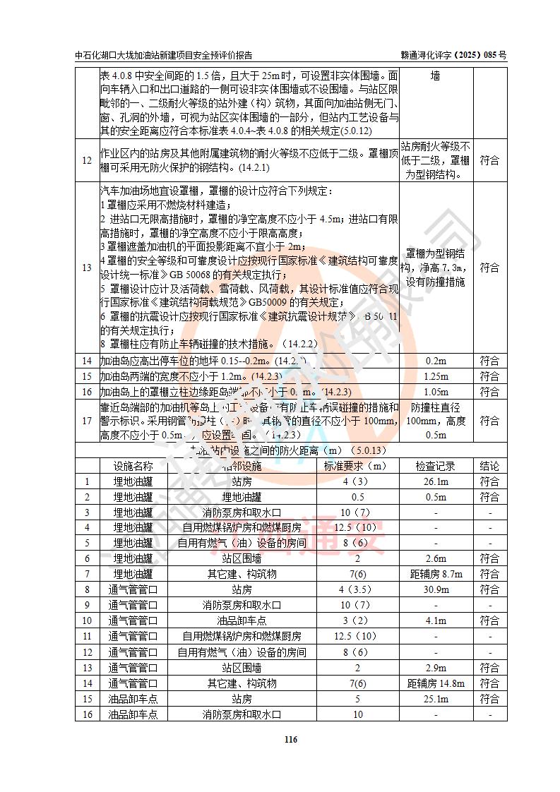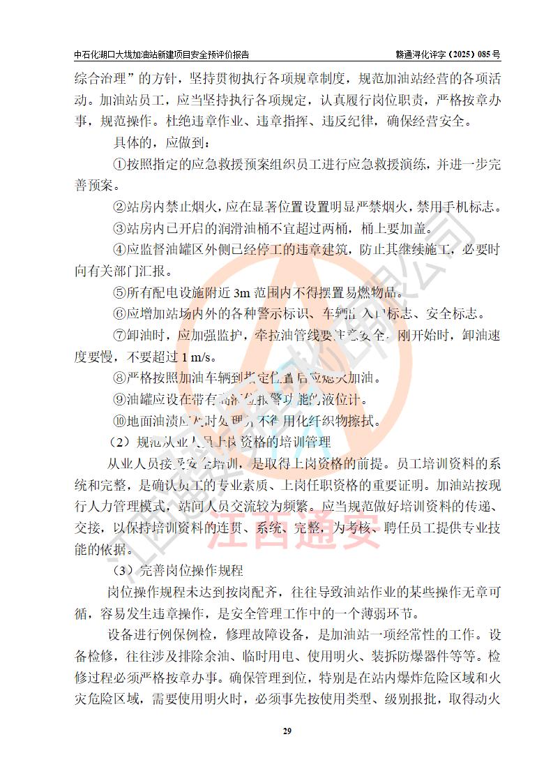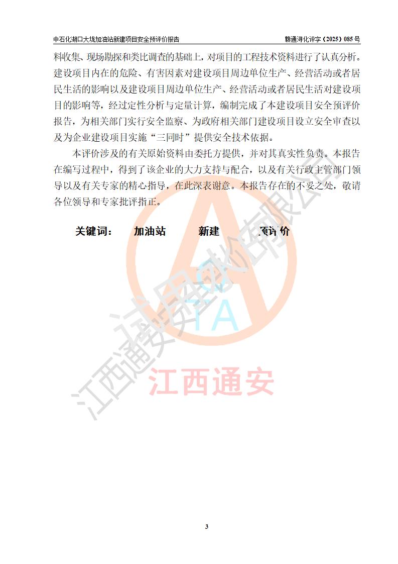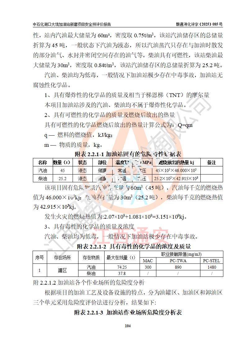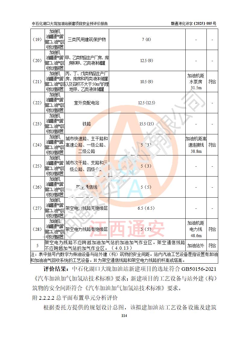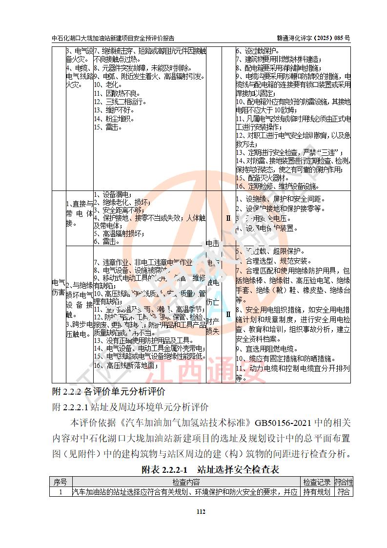 评价结论 | 中国石化销售股份有限公司江西九江石油分公司湖口大垅加油站新建项目的选址、自然条件适宜该项目工程的建设;项目规划设计中的总体布局方案可行,符合有关法规、标准要求;项目选择的工艺过程及设备设施的安全可靠性能达到**法规、标准规定要求;项目存在的危险有害因素可控,在落实项目建设方案及评价报告提出的有关安全对策措施后,其危险有害程度能达到可以接受的程度,项目建设能够实现安全运行的目标。 | |||