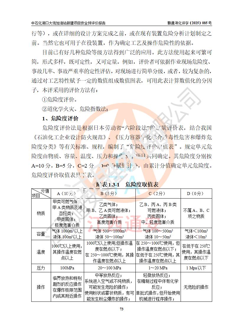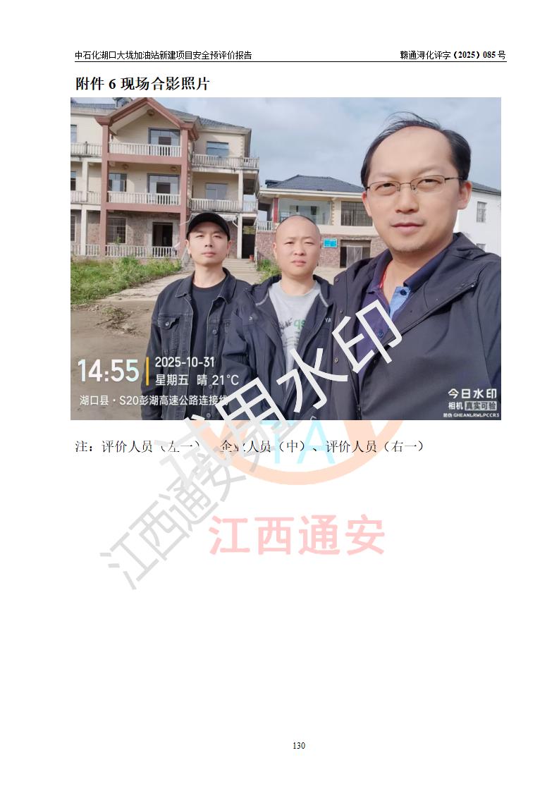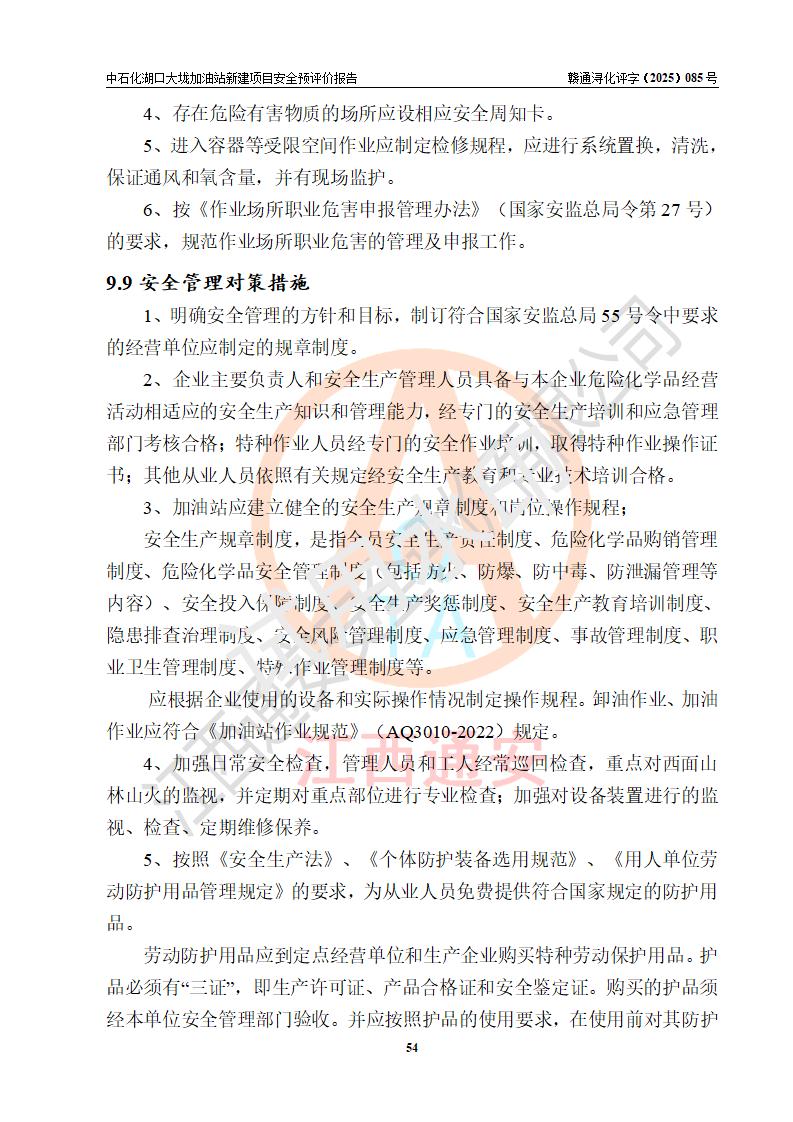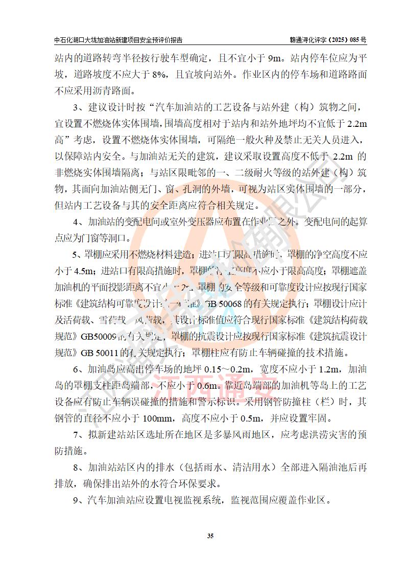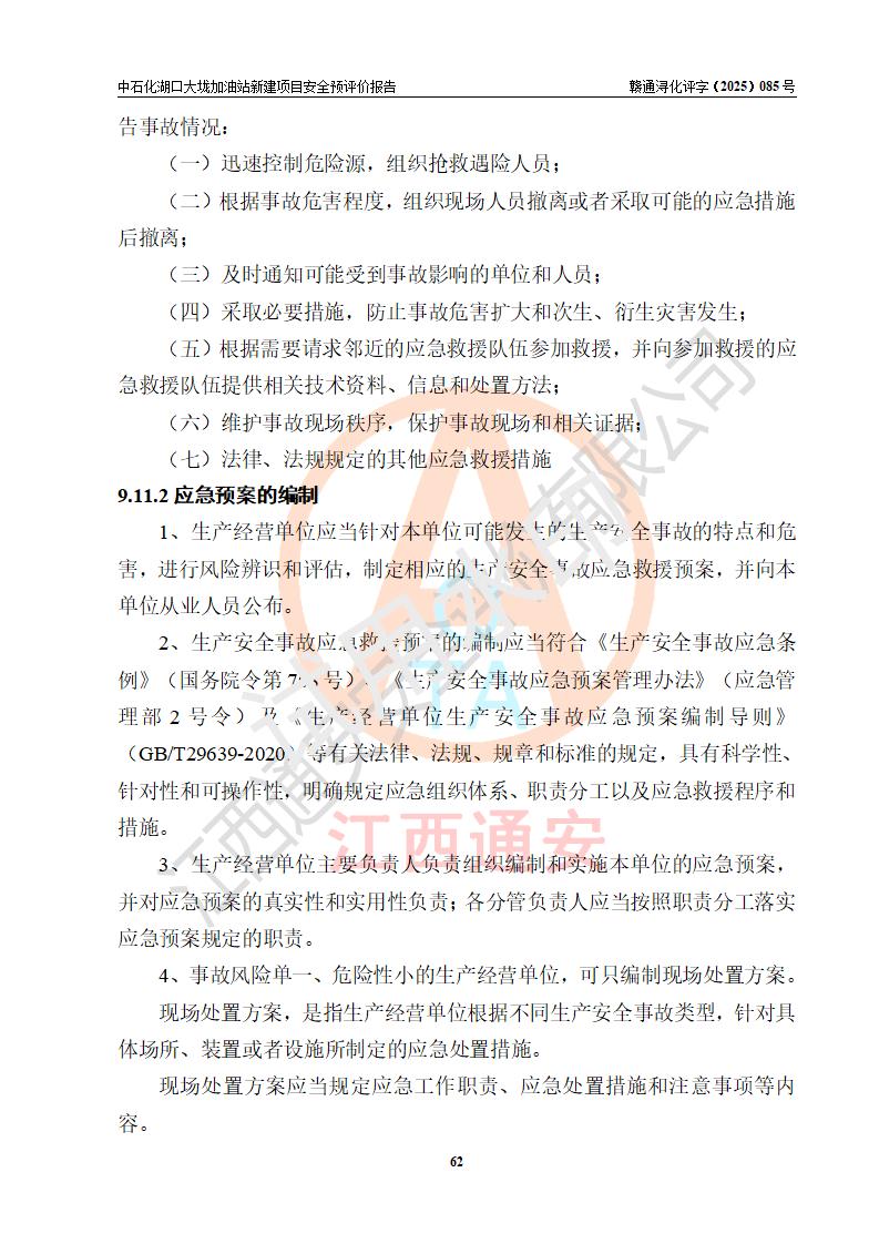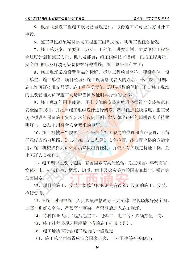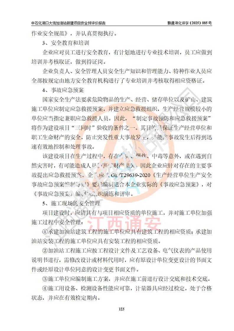 评价结论 | 中国石化销售股份有限公司江西九江石油分公司湖口大垅加油站新建项目的选址、自然条件适宜该项目工程的建设;项目规划设计中的总体布局方案可行,符合有关法规、标准要求;项目选择的工艺过程及设备设施的安全可靠性能达到**法规、标准规定要求;项目存在的危险有害因素可控,在落实项目建设方案及评价报告提出的有关安全对策措施后,其危险有害程度能达到可以接受的程度,项目建设能够实现安全运行的目标。 | |||