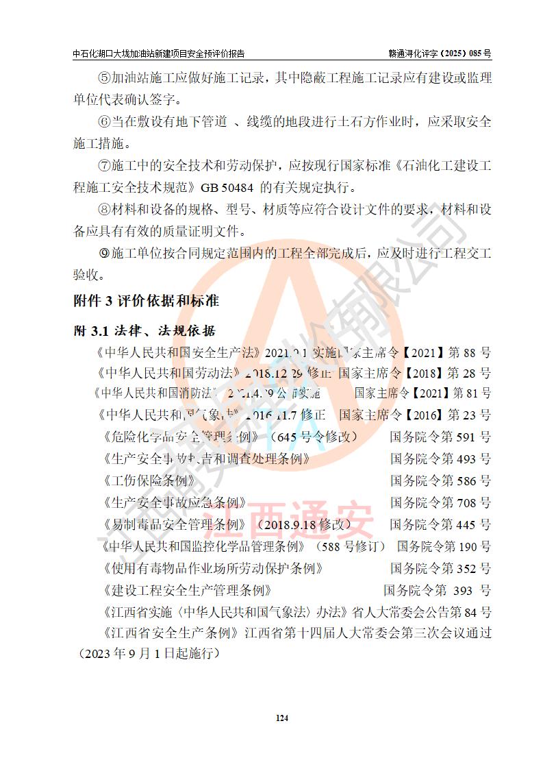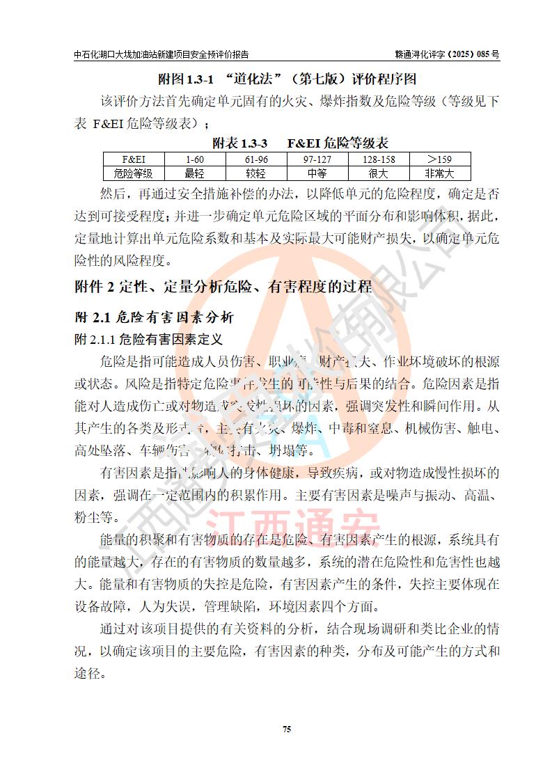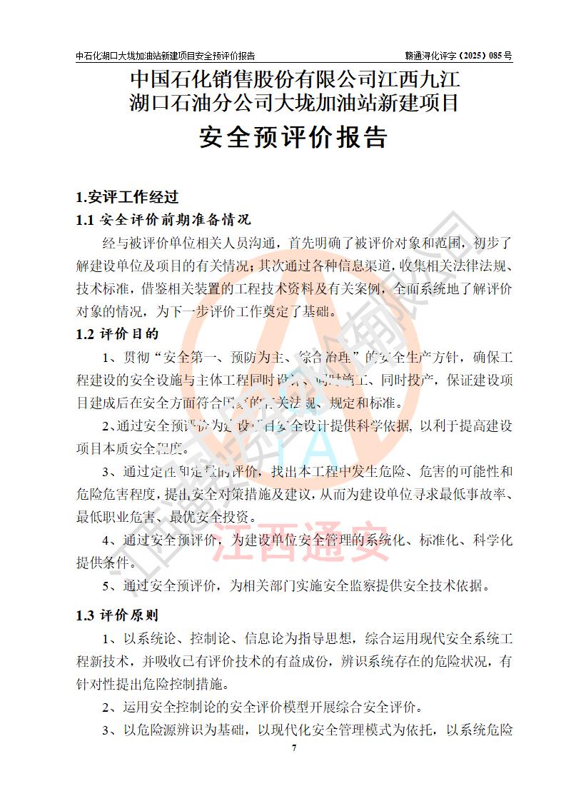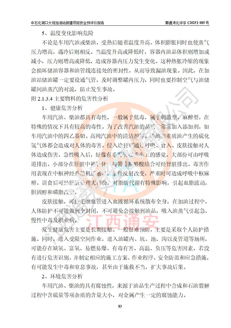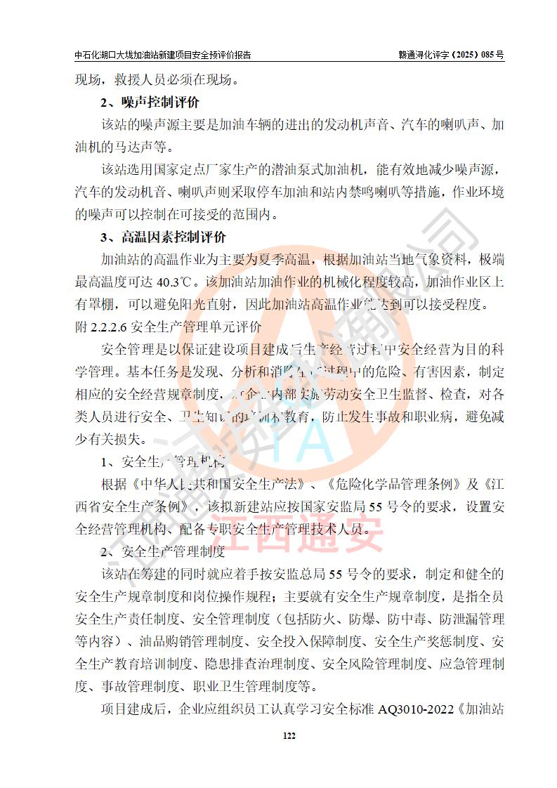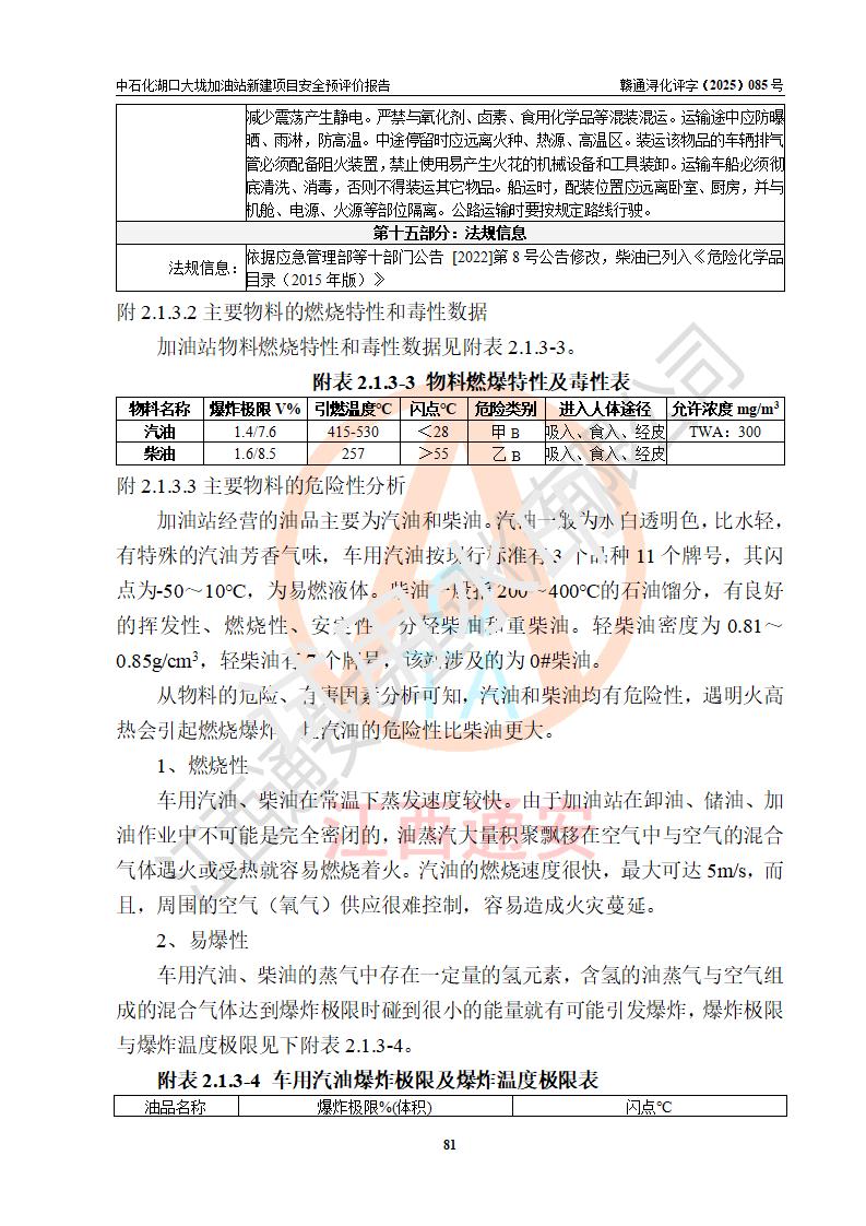 评价结论 | 中国石化销售股份有限公司江西九江石油分公司湖口大垅加油站新建项目的选址、自然条件适宜该项目工程的建设;项目规划设计中的总体布局方案可行,符合有关法规、标准要求;项目选择的工艺过程及设备设施的安全可靠性能达到**法规、标准规定要求;项目存在的危险有害因素可控,在落实项目建设方案及评价报告提出的有关安全对策措施后,其危险有害程度能达到可以接受的程度,项目建设能够实现安全运行的目标。 | |||