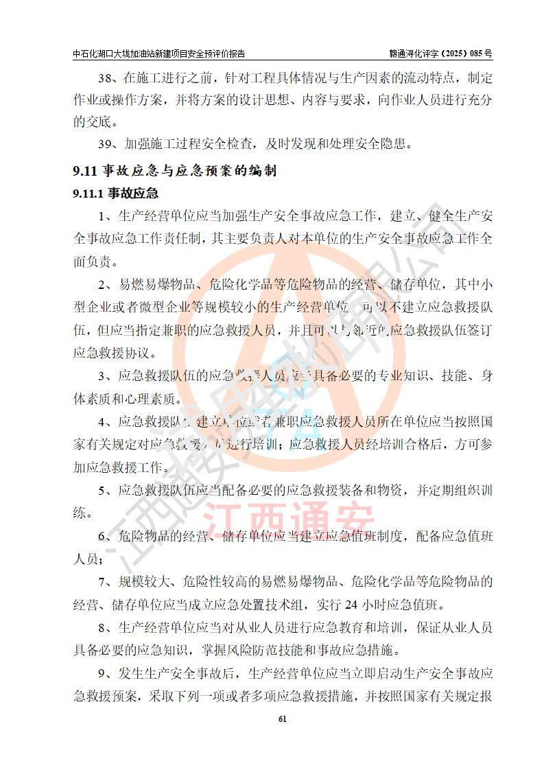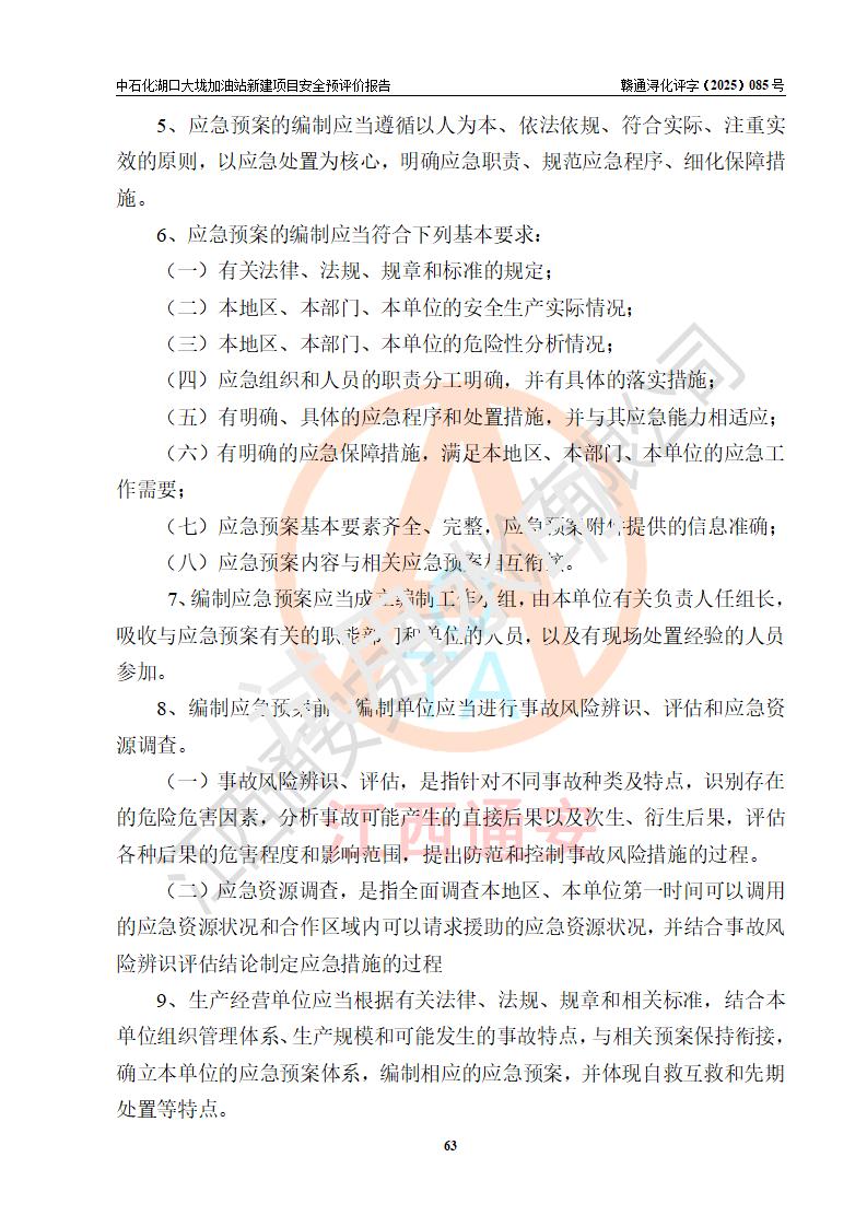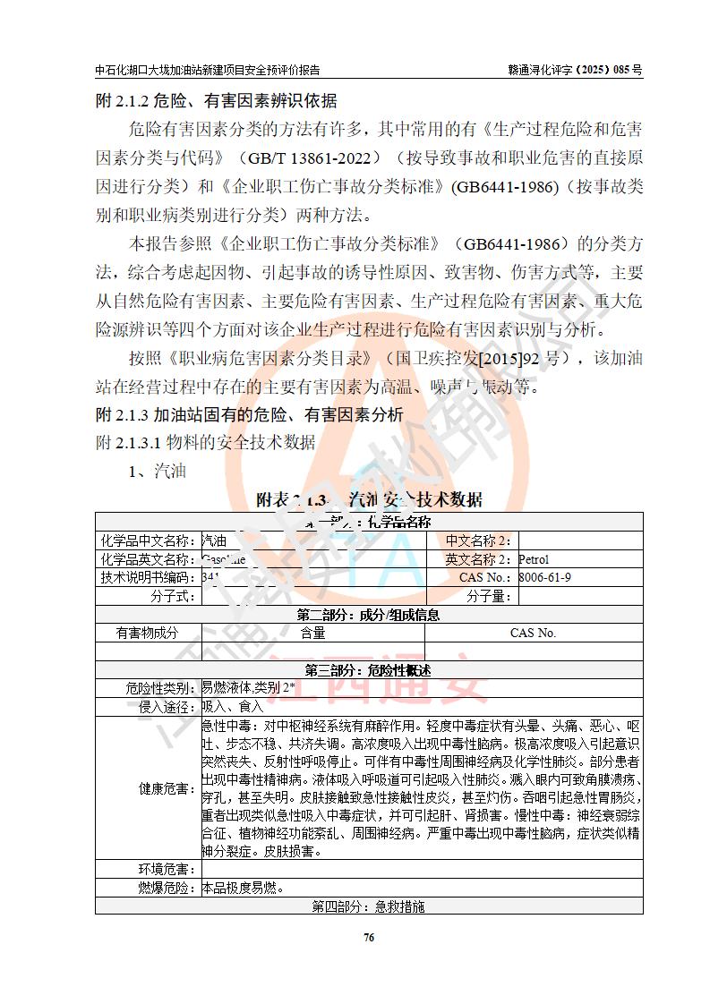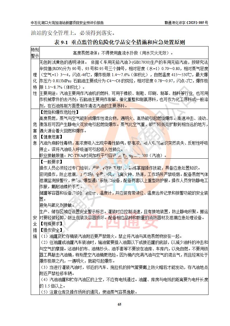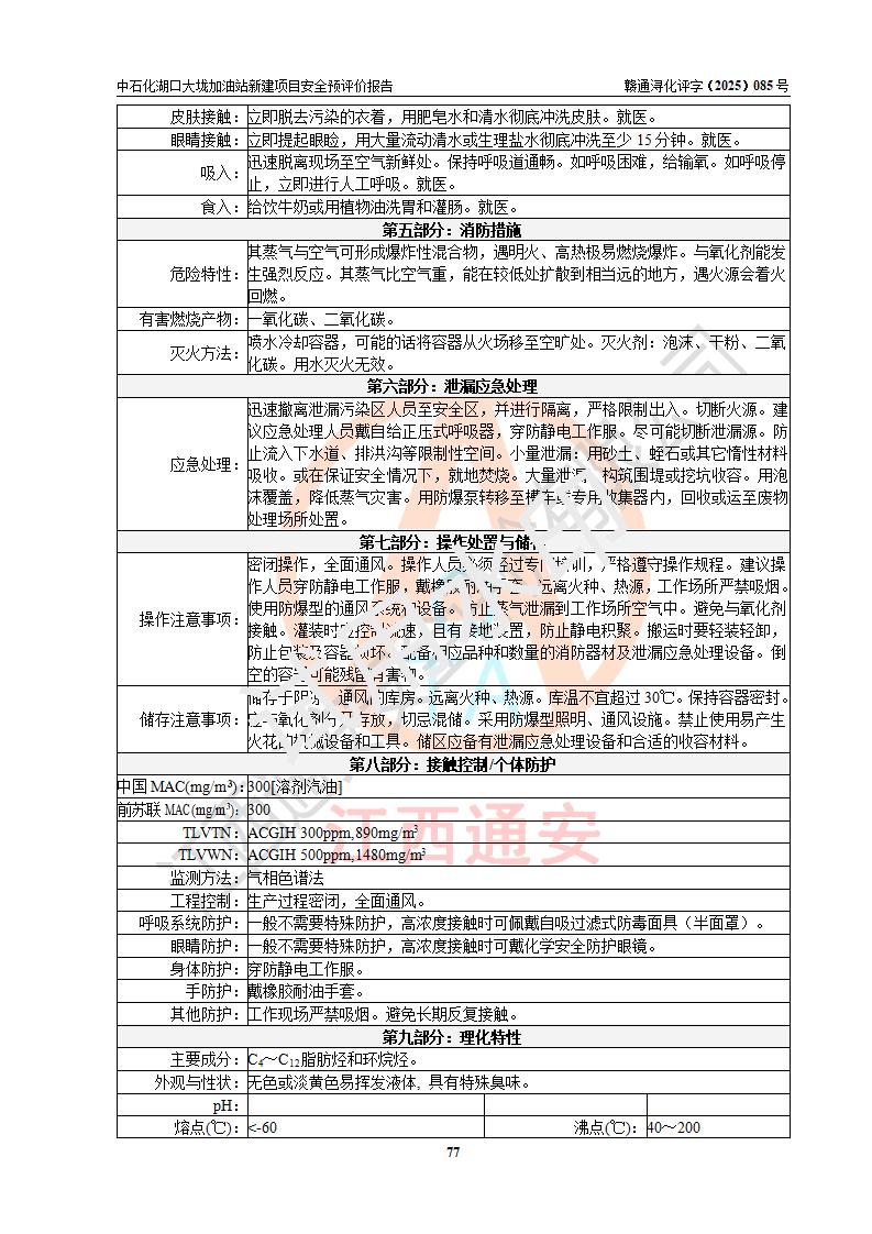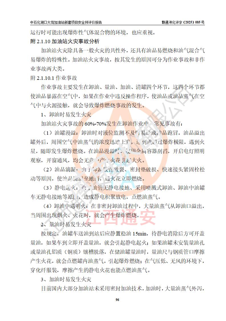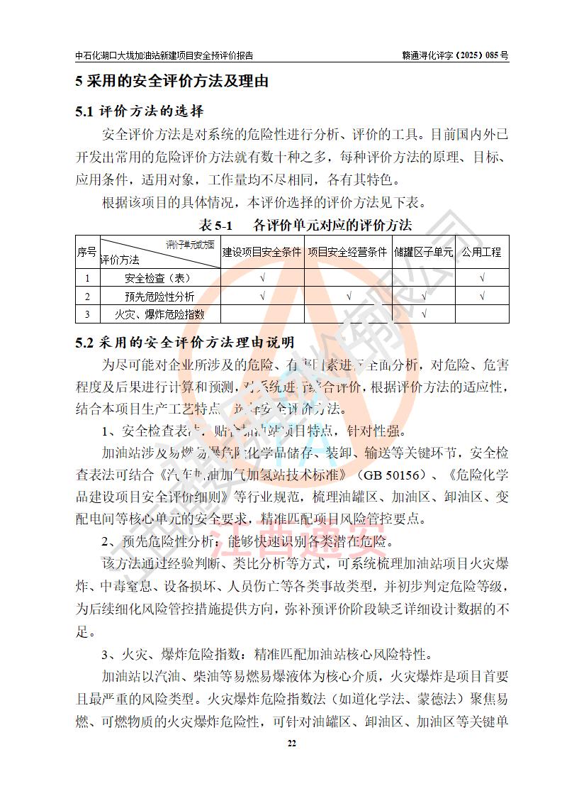 评价结论 | 中国石化销售股份有限公司江西九江石油分公司湖口大垅加油站新建项目的选址、自然条件适宜该项目工程的建设;项目规划设计中的总体布局方案可行,符合有关法规、标准要求;项目选择的工艺过程及设备设施的安全可靠性能达到**法规、标准规定要求;项目存在的危险有害因素可控,在落实项目建设方案及评价报告提出的有关安全对策措施后,其危险有害程度能达到可以接受的程度,项目建设能够实现安全运行的目标。 | |||