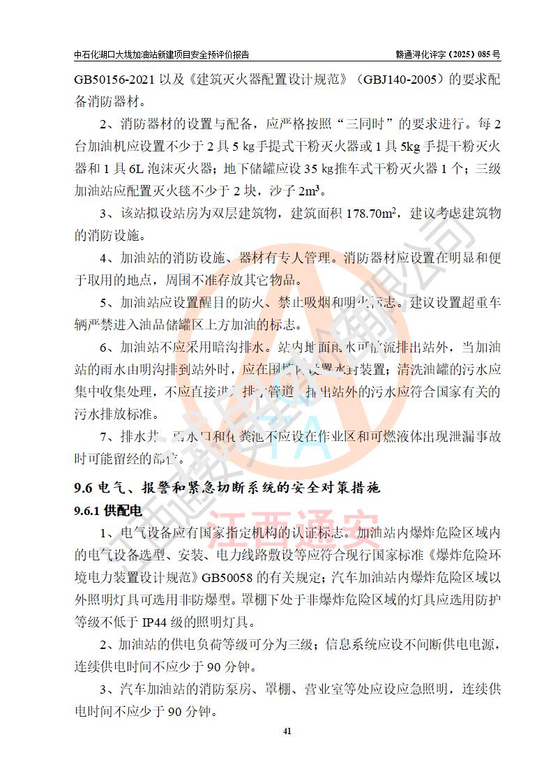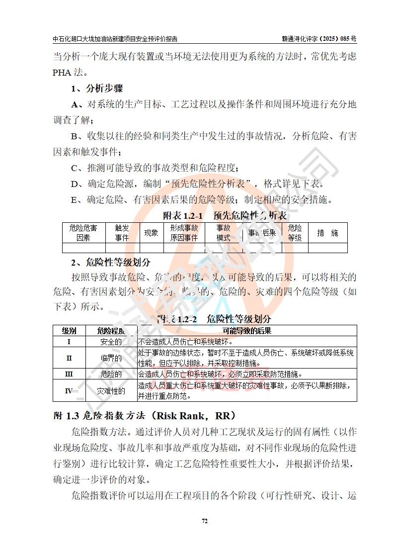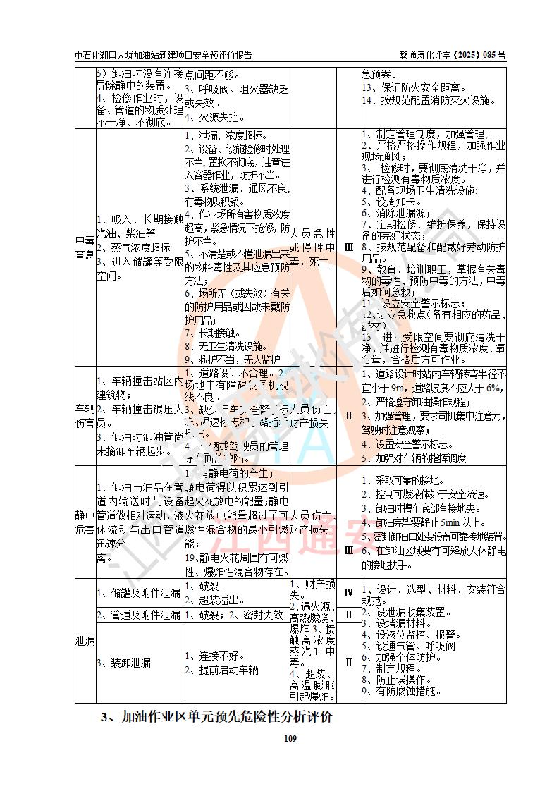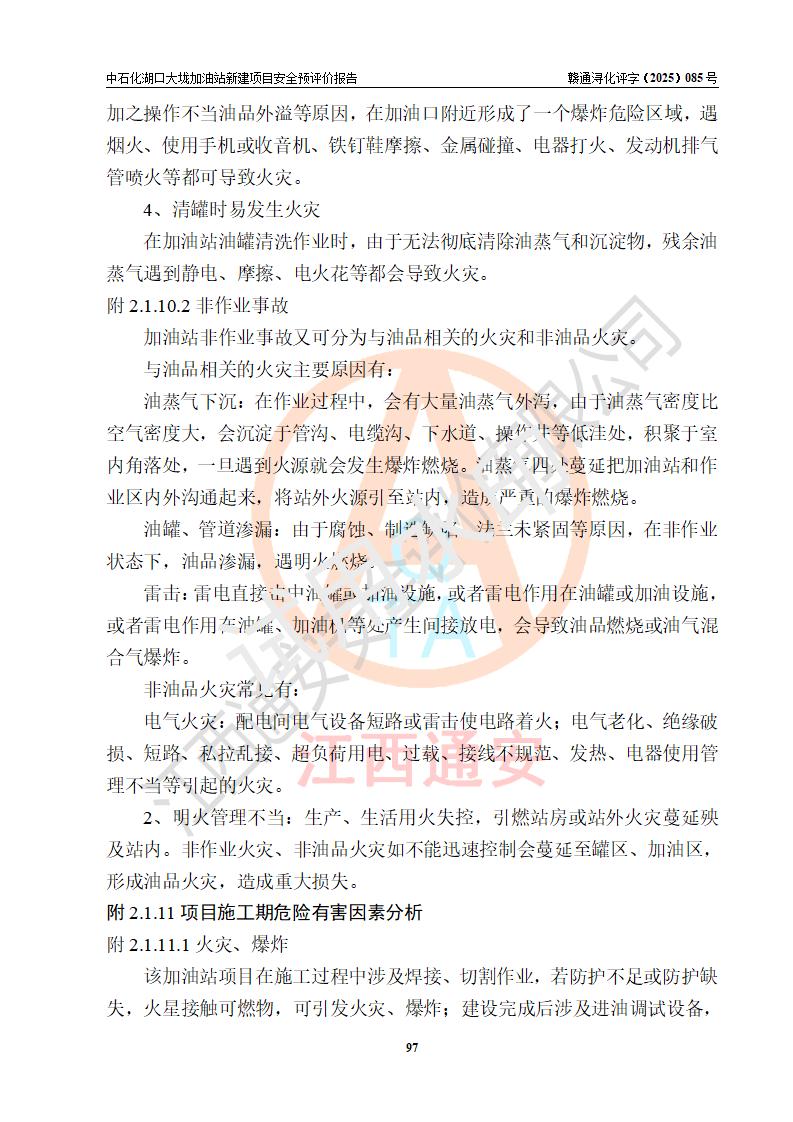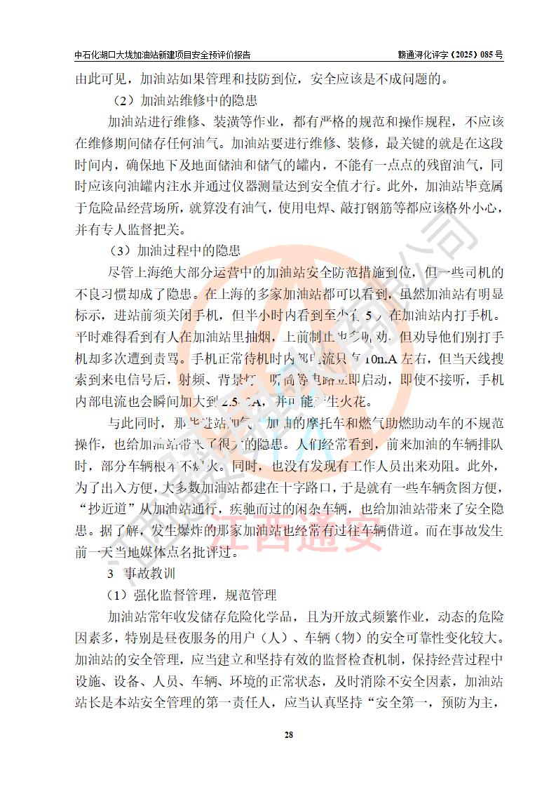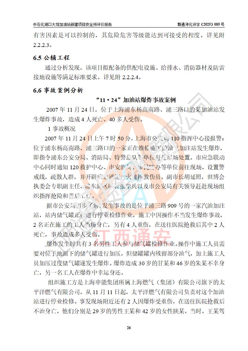 评价结论 | 中国石化销售股份有限公司江西九江石油分公司湖口大垅加油站新建项目的选址、自然条件适宜该项目工程的建设;项目规划设计中的总体布局方案可行,符合有关法规、标准要求;项目选择的工艺过程及设备设施的安全可靠性能达到**法规、标准规定要求;项目存在的危险有害因素可控,在落实项目建设方案及评价报告提出的有关安全对策措施后,其危险有害程度能达到可以接受的程度,项目建设能够实现安全运行的目标。 | |||