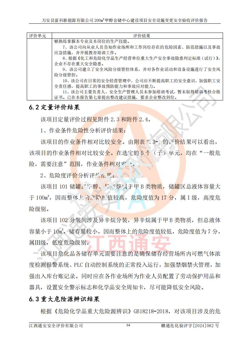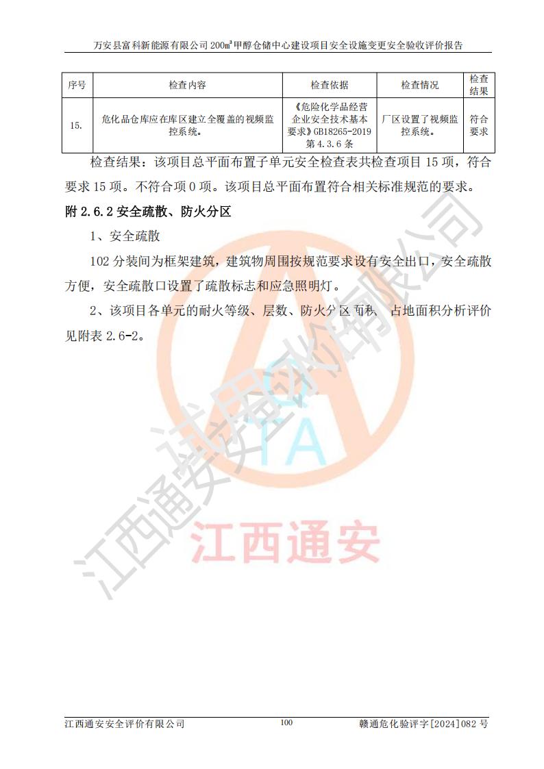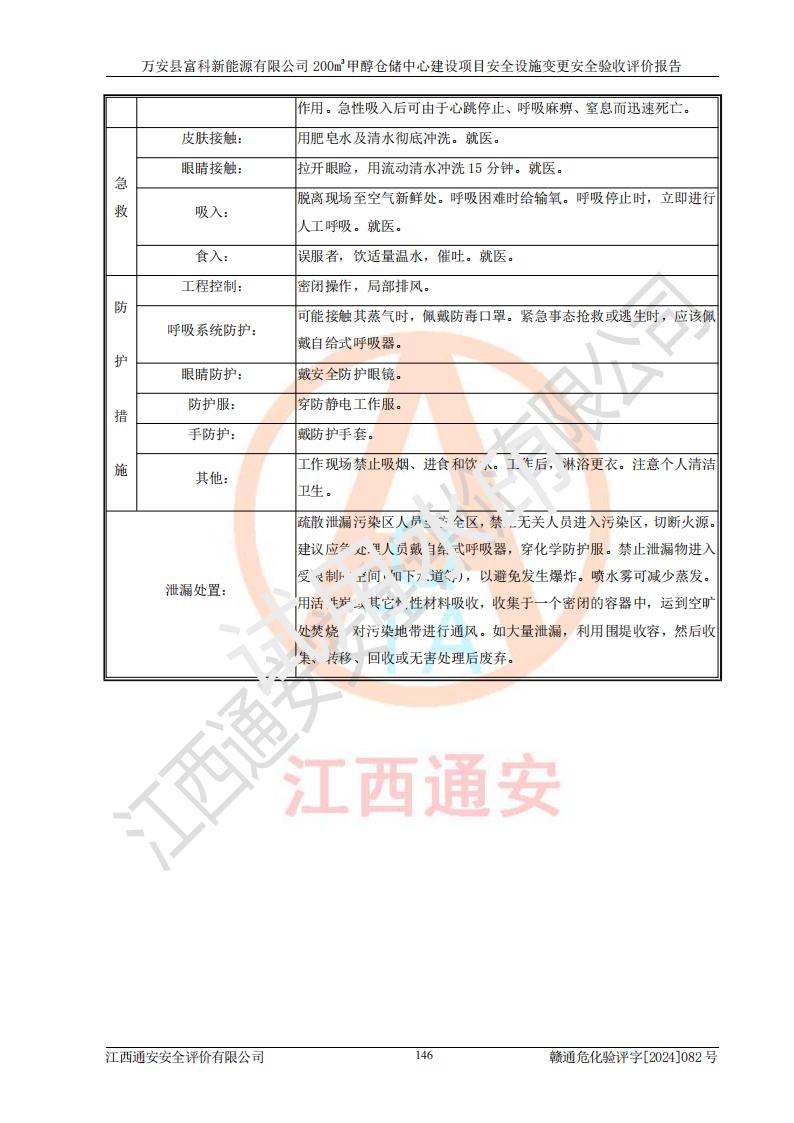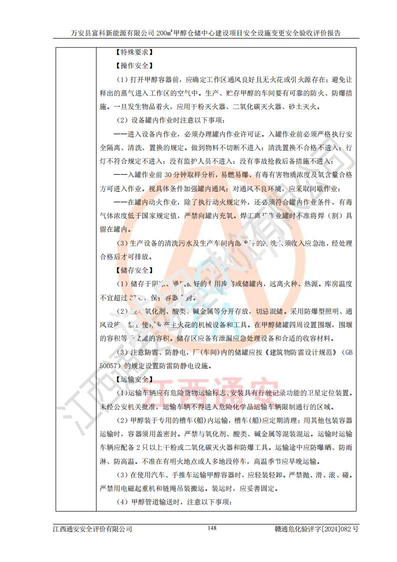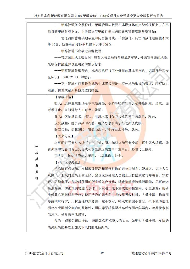 评价结论 | 1、万安县富科新能源有限公司200m3甲醇仓储中心建设项目安全设施变更设计各储存经营单元的安全设施与主体工程同时设计、同时施工、同时投入使用,符合**有关建设项目“三同时”的规定和要求。 2、万安县富科新能源有限公司200m3甲醇仓储中心建设项目安全设施变更的主体工程安全设施、安全措施符合法律法规的规定和要求,并运行**;公用工程及辅助设施满足主体工程生产安全的需要;企业安全管理体系满足生产安全的要求。 3、万安县富科新能源有限公司已针对本报告提出的安全隐患整改意见组织人员进行整改,经过整改已落实到位,企业安全生产的风险控制在可以接受的范围内。 综上所述,万安县富科新能源有限公司200m3甲醇仓储中心建设项目安全设施变更相关的设备设施和安全设施运行正常,企业安全管理机制运行正常,安全设施、措施达到规范要求和预期结果,可以满足该项目危险化学品储存经营的要求,安全管理**。万安县富科新能源有限公司200m3甲醇仓储中心建设项目安全设施变更具备安全设施竣工验收条件。 | |||