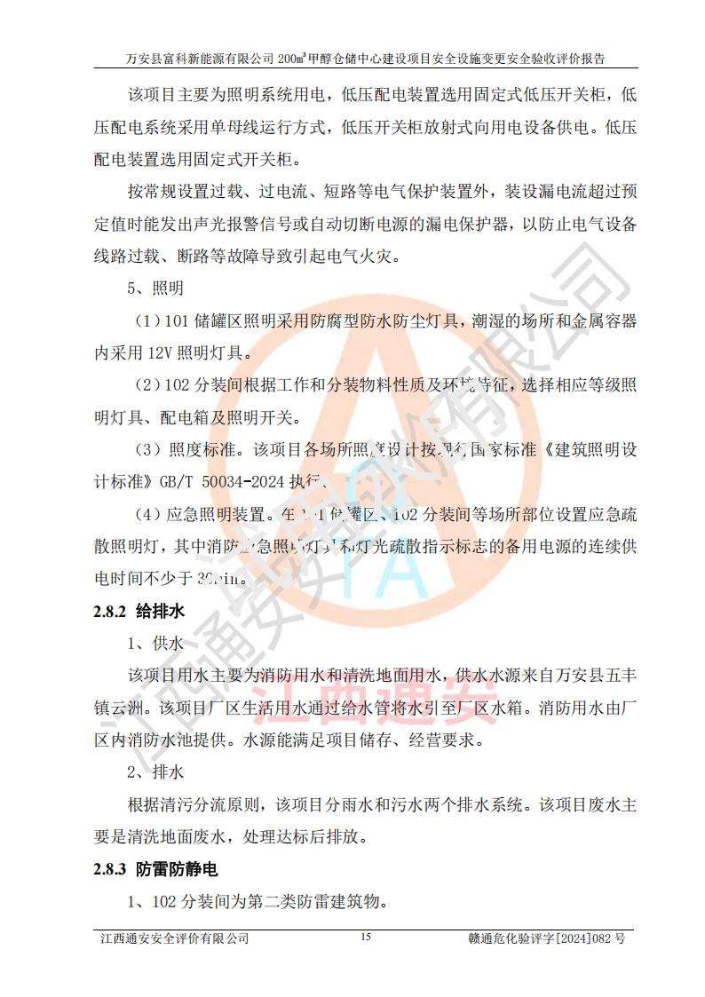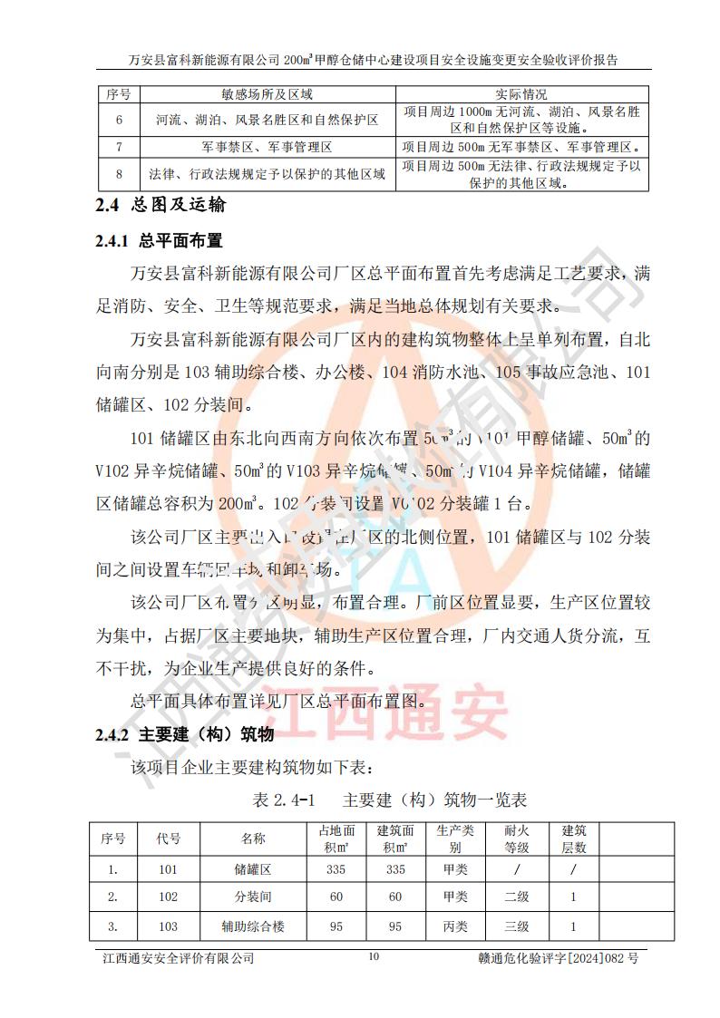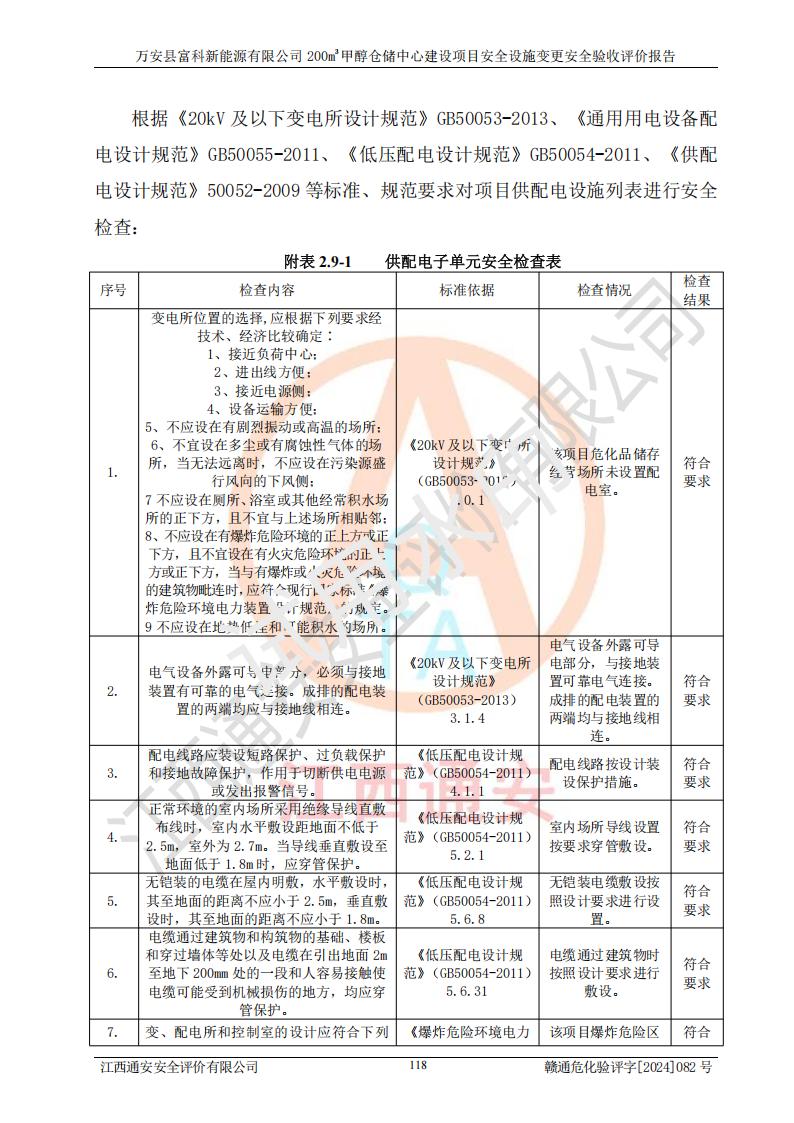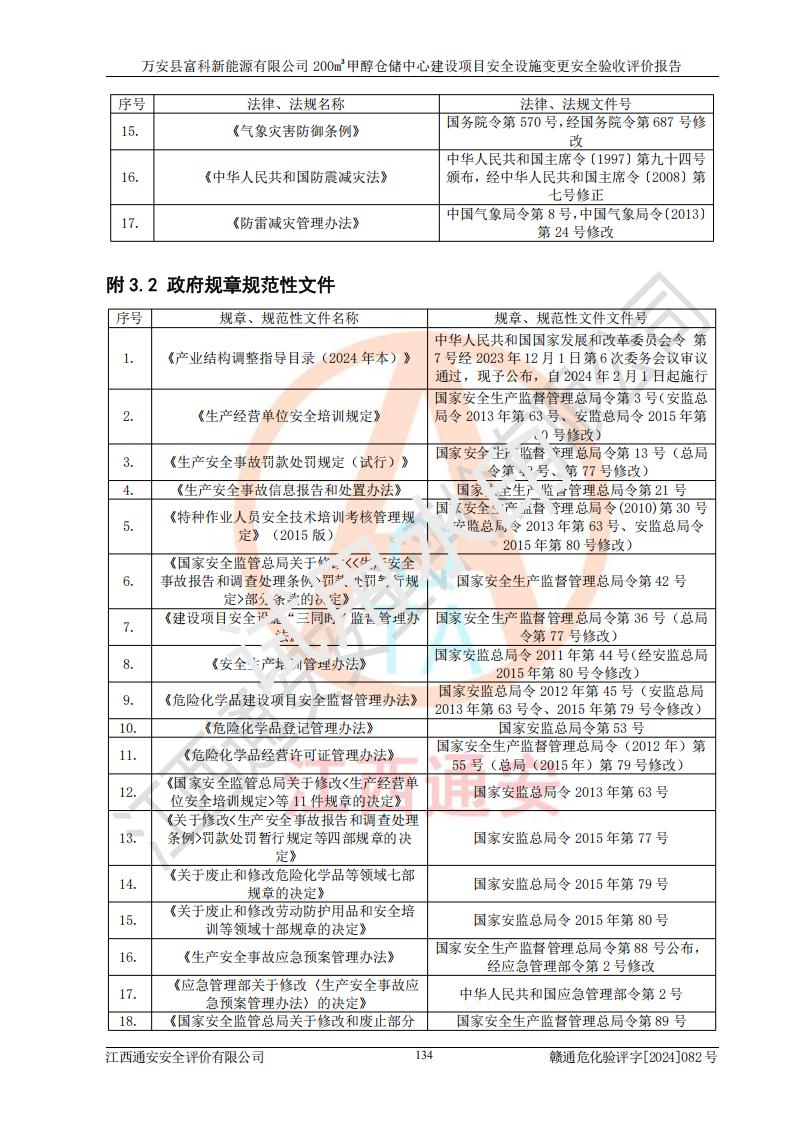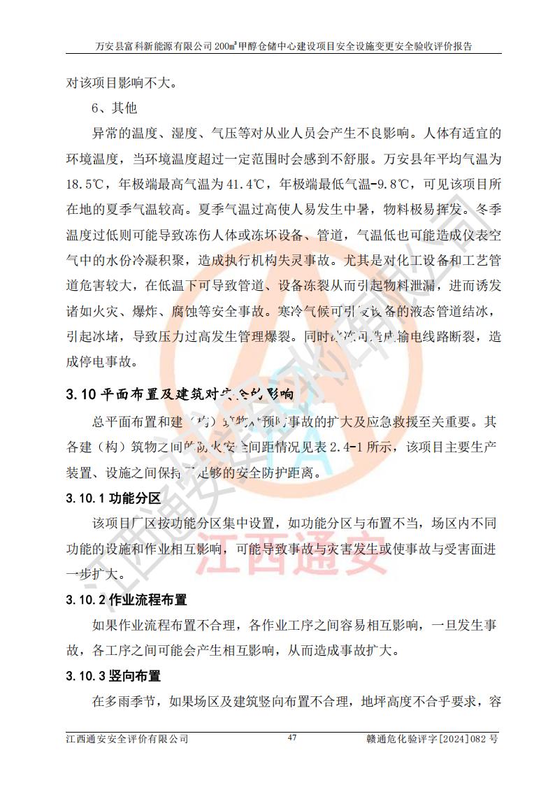 评价结论 | 1、万安县富科新能源有限公司200m3甲醇仓储中心建设项目安全设施变更设计各储存经营单元的安全设施与主体工程同时设计、同时施工、同时投入使用,符合**有关建设项目“三同时”的规定和要求。 2、万安县富科新能源有限公司200m3甲醇仓储中心建设项目安全设施变更的主体工程安全设施、安全措施符合法律法规的规定和要求,并运行**;公用工程及辅助设施满足主体工程生产安全的需要;企业安全管理体系满足生产安全的要求。 3、万安县富科新能源有限公司已针对本报告提出的安全隐患整改意见组织人员进行整改,经过整改已落实到位,企业安全生产的风险控制在可以接受的范围内。 综上所述,万安县富科新能源有限公司200m3甲醇仓储中心建设项目安全设施变更相关的设备设施和安全设施运行正常,企业安全管理机制运行正常,安全设施、措施达到规范要求和预期结果,可以满足该项目危险化学品储存经营的要求,安全管理**。万安县富科新能源有限公司200m3甲醇仓储中心建设项目安全设施变更具备安全设施竣工验收条件。 | |||