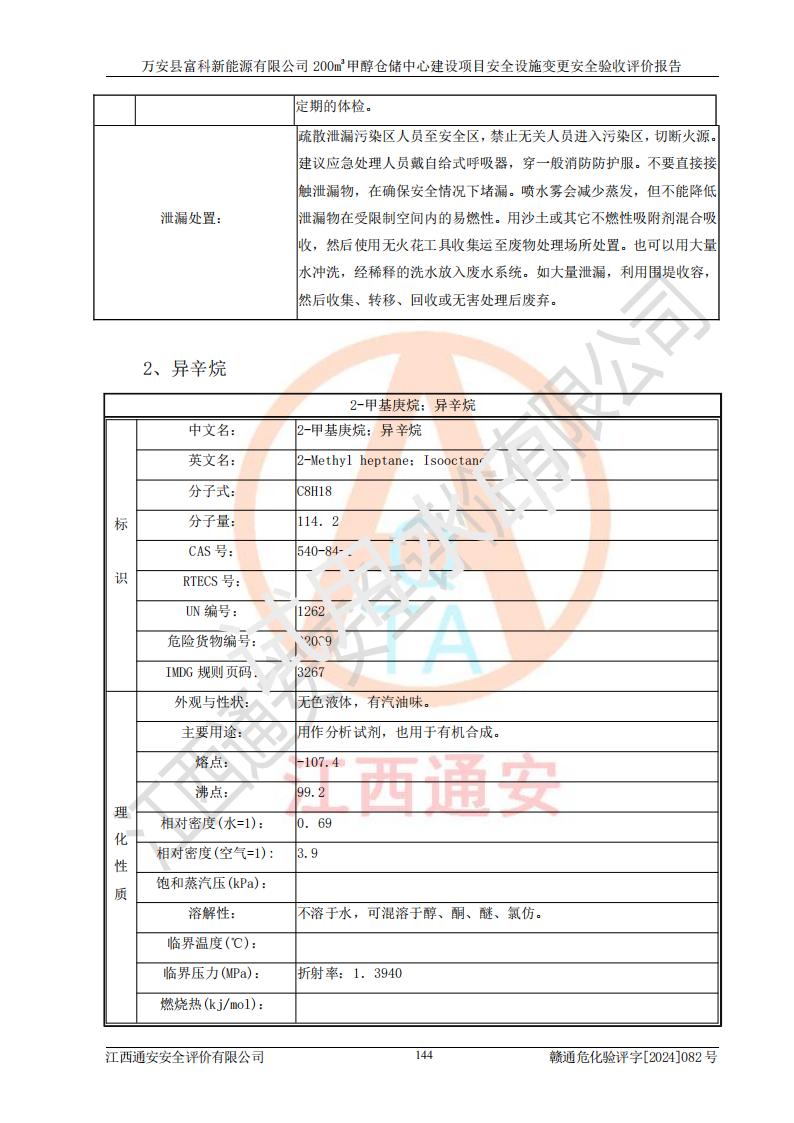 项目简介 | 万安县富科新能源有限公司(以下简称“公司”)成立于2018年12月13日,法定**人:陈丽华。该公司曾用名为万安县荣能甲醇仓储有限公司,于2023年09月01日改为现用名,其经营范围包括许可项目:危险化学品经营(依法须经批准的项目,经相关部门批准后在许可**期内方可开展经营活动,具体经营项目和许可期限以相关部门批准文件或许可证件为准)一般项目:石油制品销售(不含危险化学品)(除依法须经批准的项目外,凭营业执照依法自主开展经营活动)。 万安县富科新能源有限公司于2021年11月16日取得了万安县应急管理局颁发的《危险化学品经营许可证》,证书编号:赣吉危化经字〔2018〕001号,经营范围:甲醇、甲醇基燃料(混合物甲醇含量*过70%),经营方式:零售、批发(储存量不*过200m3)。 根据《危险化学品目录(2015版)》(**安监总局等十部门公告[2015]第5号)及应急管理部、工业和信息化部、公安部、生态环境部、交通运输部、农业农村部、卫生健康委、市场监管总局、铁路局、民航局决定调整《危险化学品目录(2015版)》(应急管理部、工业和信息化部、公安部、生态环境部、交通运输部、农业农村部、卫生健康委、市场监管总局、铁路局、民航局公告2022年第8号)等文件对该项目涉及的化学品进行辨识:该项目涉及的危险化学品有:甲醇、异辛烷。 | |||