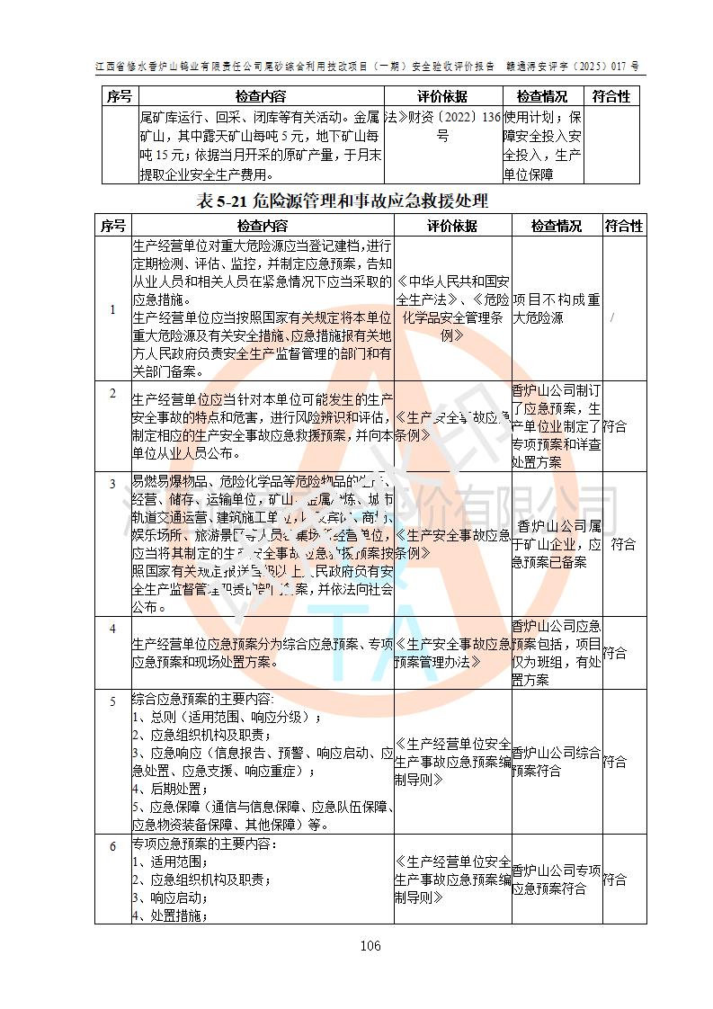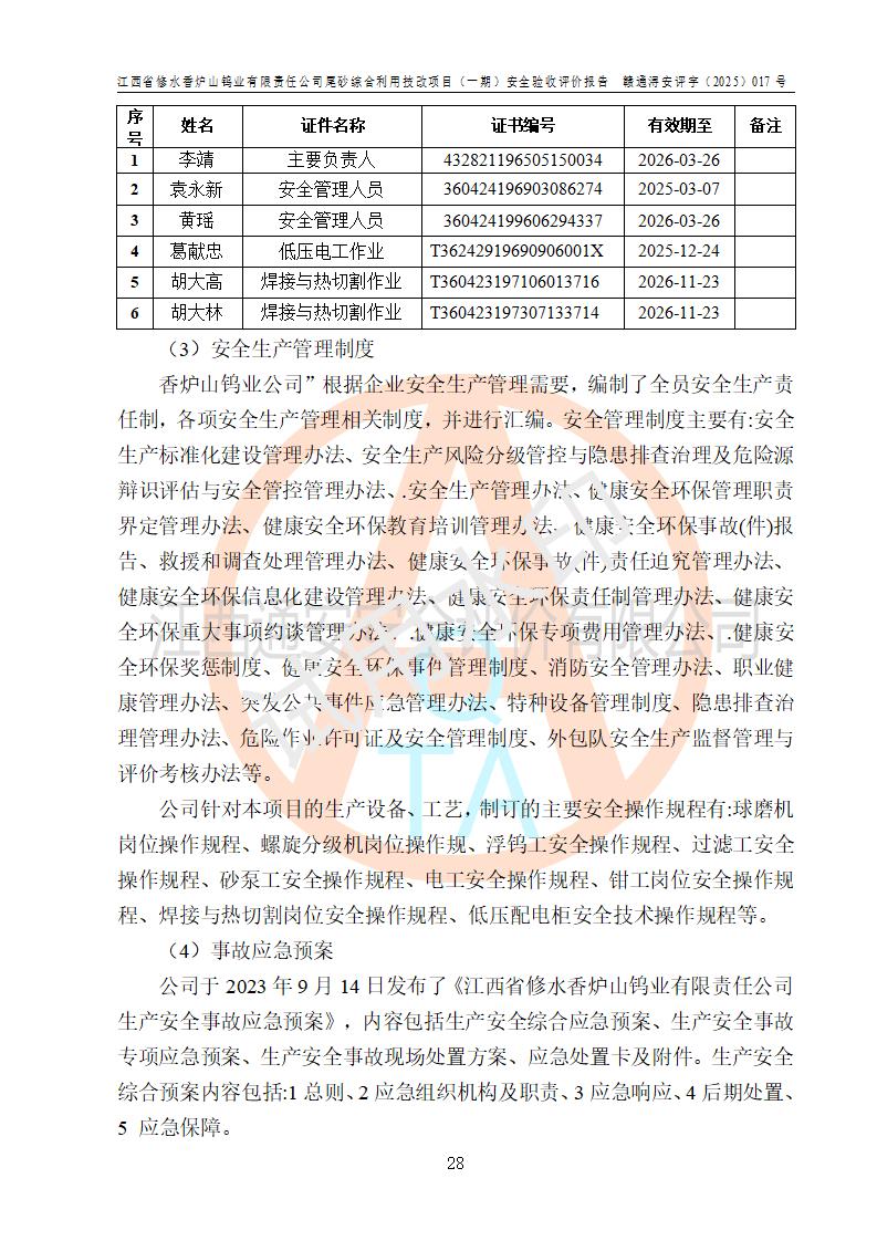 评价报告名称 | 江西省修水香炉山钨业有限责任公司尾砂综合利用技改项目(一期)安全验收评价报告 | |||||