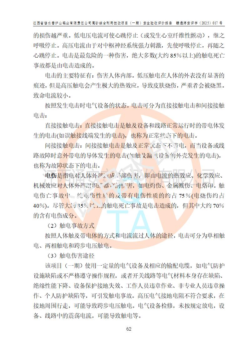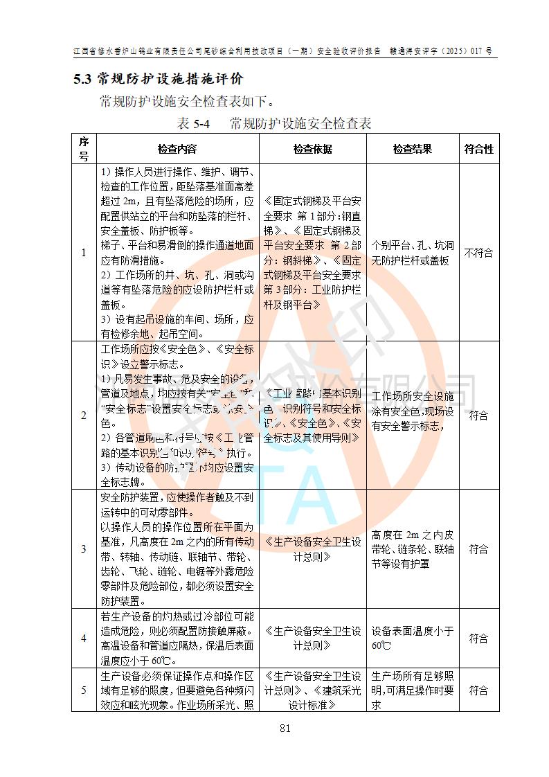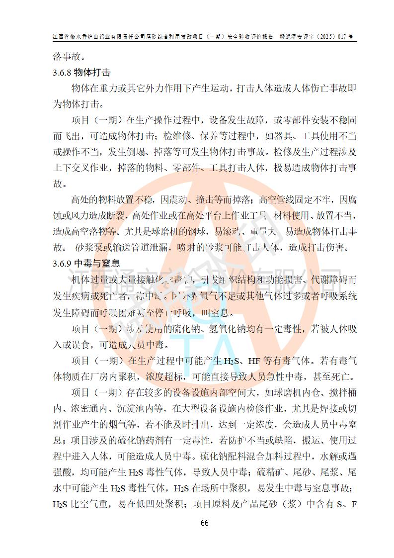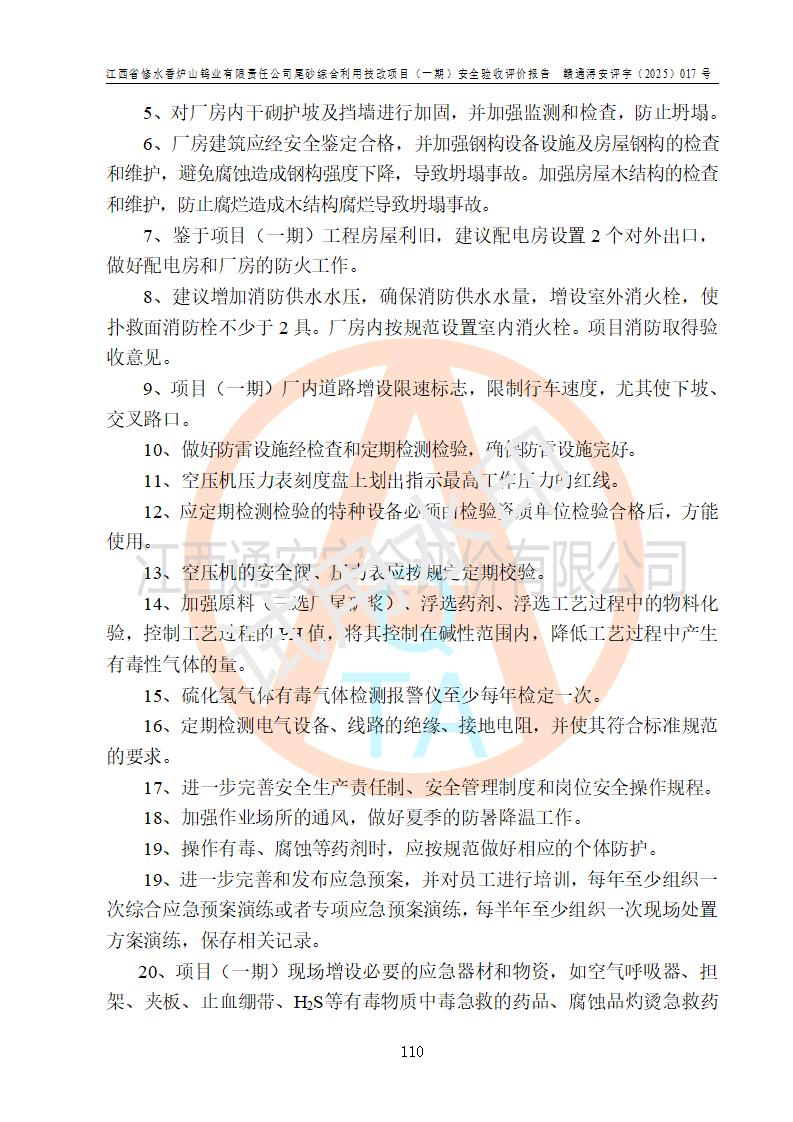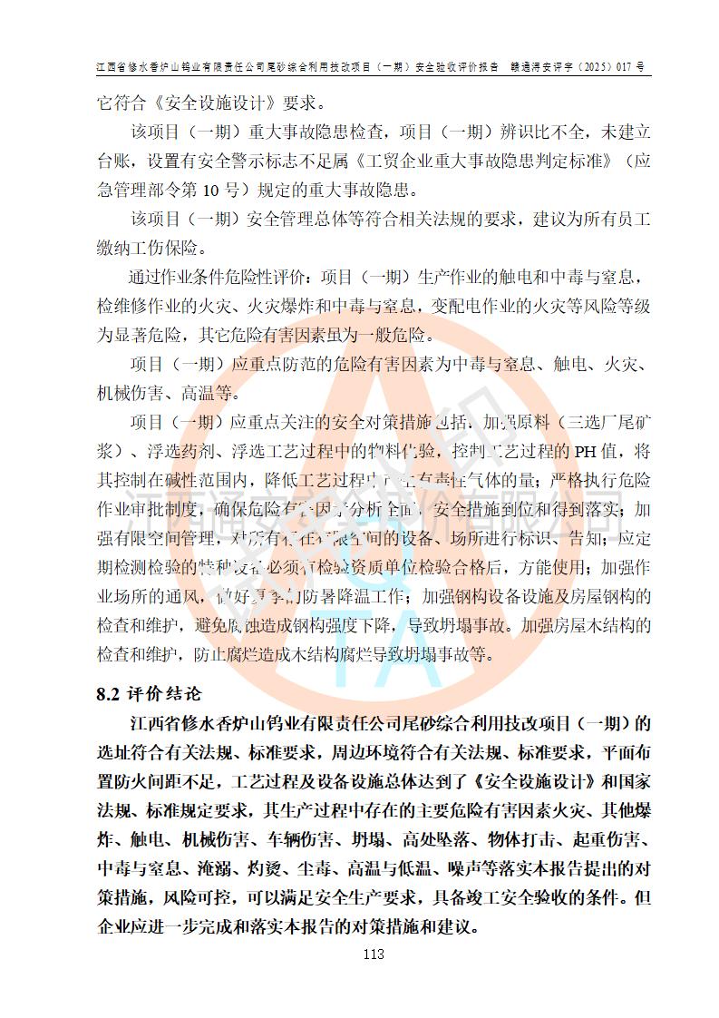 评价结论 | 总体结论:江西省修水香炉山钨业有限责任公司尾砂综合利用技改项目(一期)的选址符合有关法规、标准要求,周边环境符合有关法规、标准要求,平面布置防火间距不足,工艺过程及设备设施总体达到了《安全设施设计》和**法规、标准规定要求,其生产过程中存在的主要危险有害因素火灾、其他爆炸、触电、机械伤害、**伤害、坍塌、高处坠落、物体打击、起重伤害、中毒与窒息、淹溺、灼烫、尘毒、高温与低温、噪声等落实本报告提出的对策措施,风险可控,可以满足安全生产要求,具备竣工安全验收的条件。但企业应进一步完成和落实本报告的对策措施和建议。 | |||||