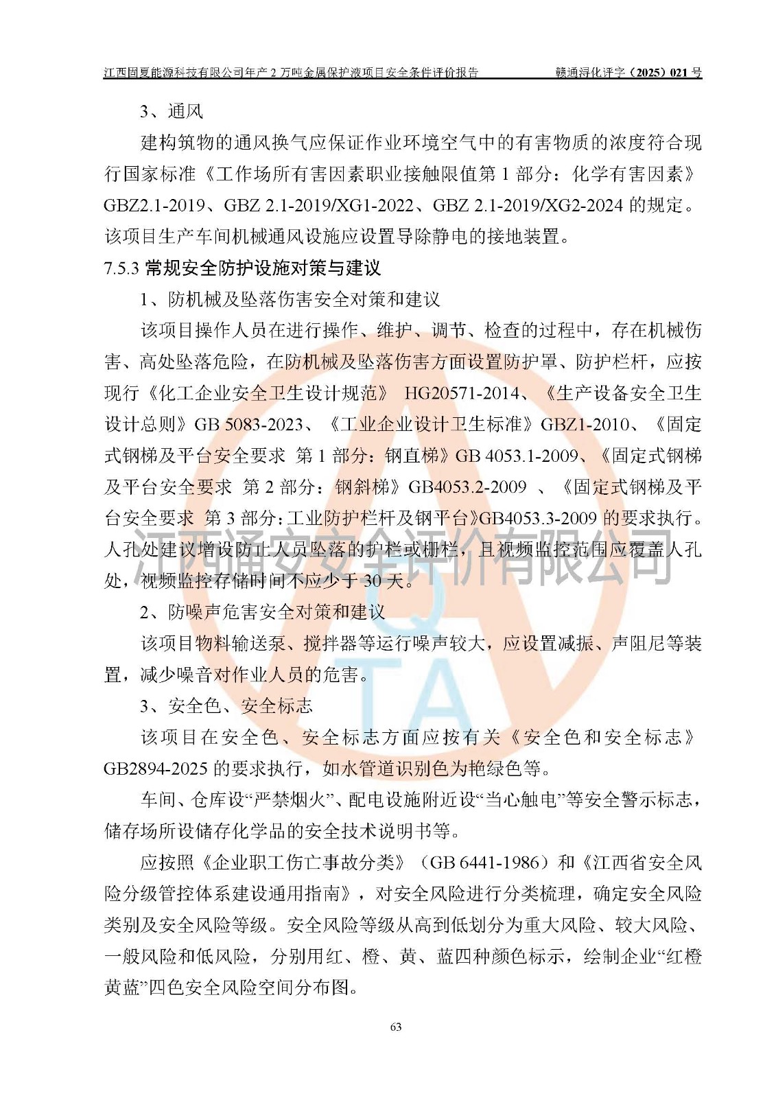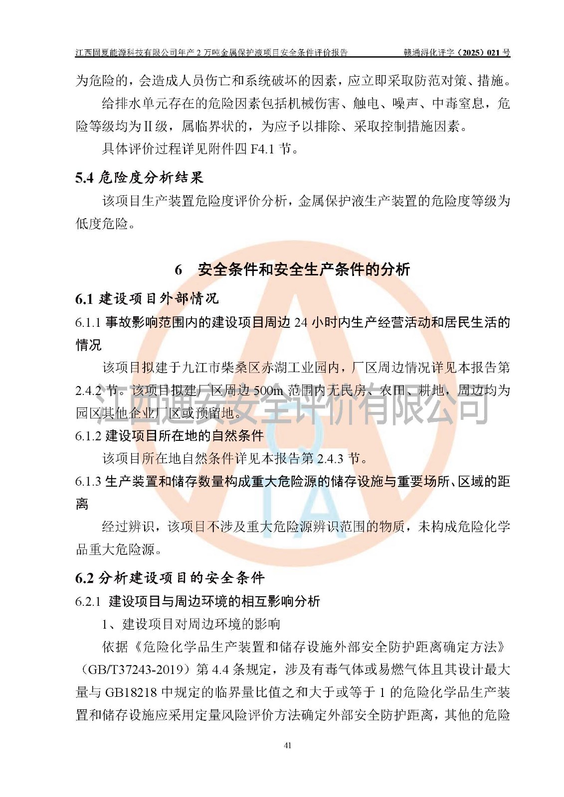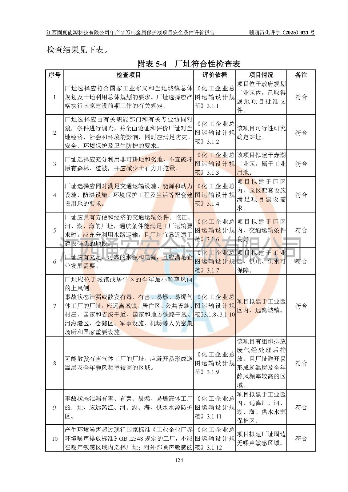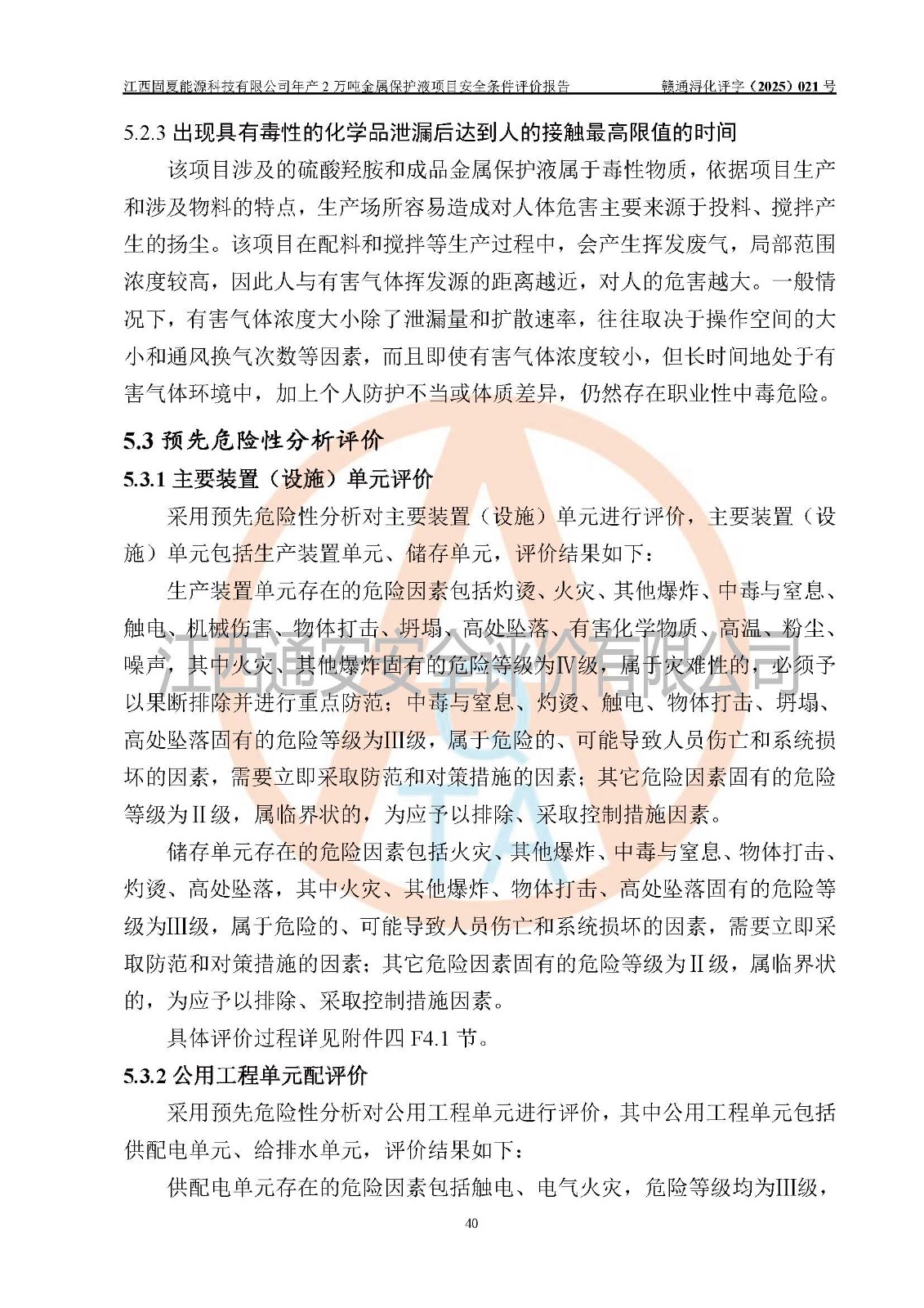 评价结论 | 江西固夏能源科技有限公司年产2万吨金属保护液项目的选址、总体布局、周边环境、自然环境能满足建设安全条件;项目选择的工艺过程及设备设施的安全可靠性能达到**法规、标准规定要求;项目存在的危险有害因素可控,在落实本评价报告提出的有关安全对策措施后,其危险有害程度能达到可以接受的程度,项目建设能够实现安全运行的目标。 | |||