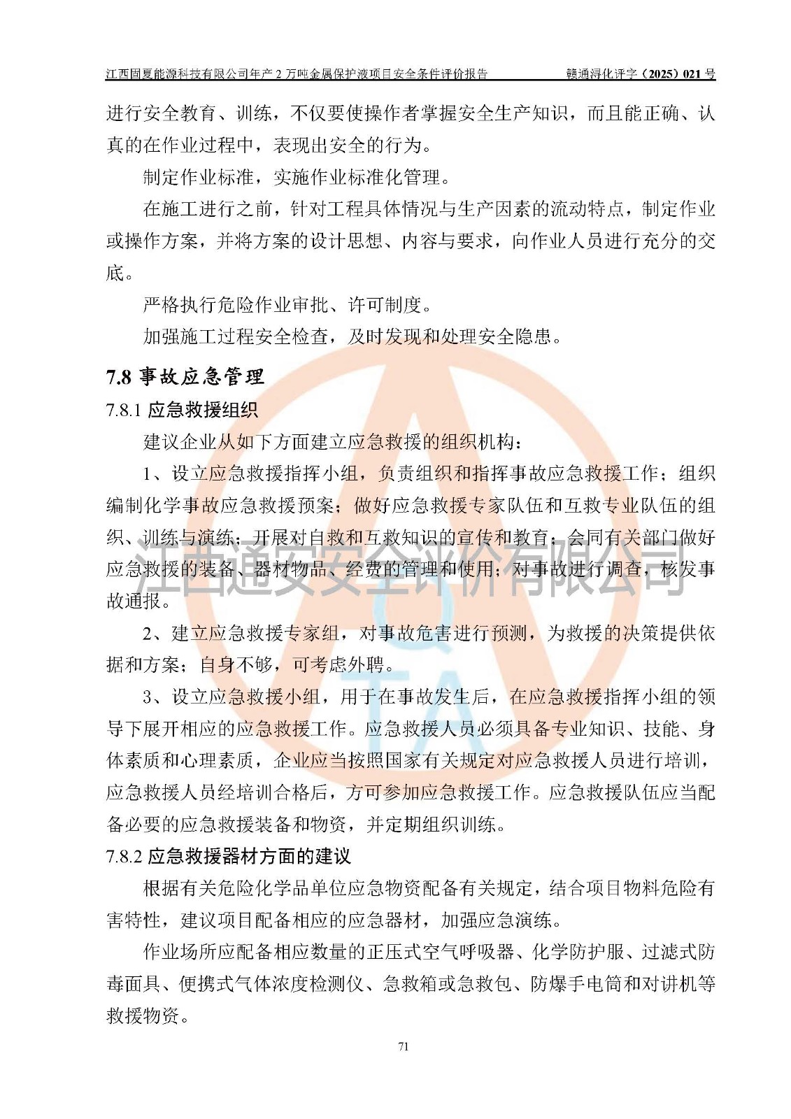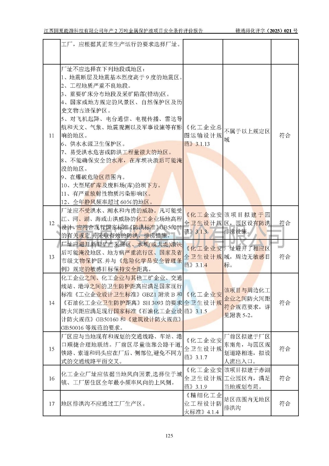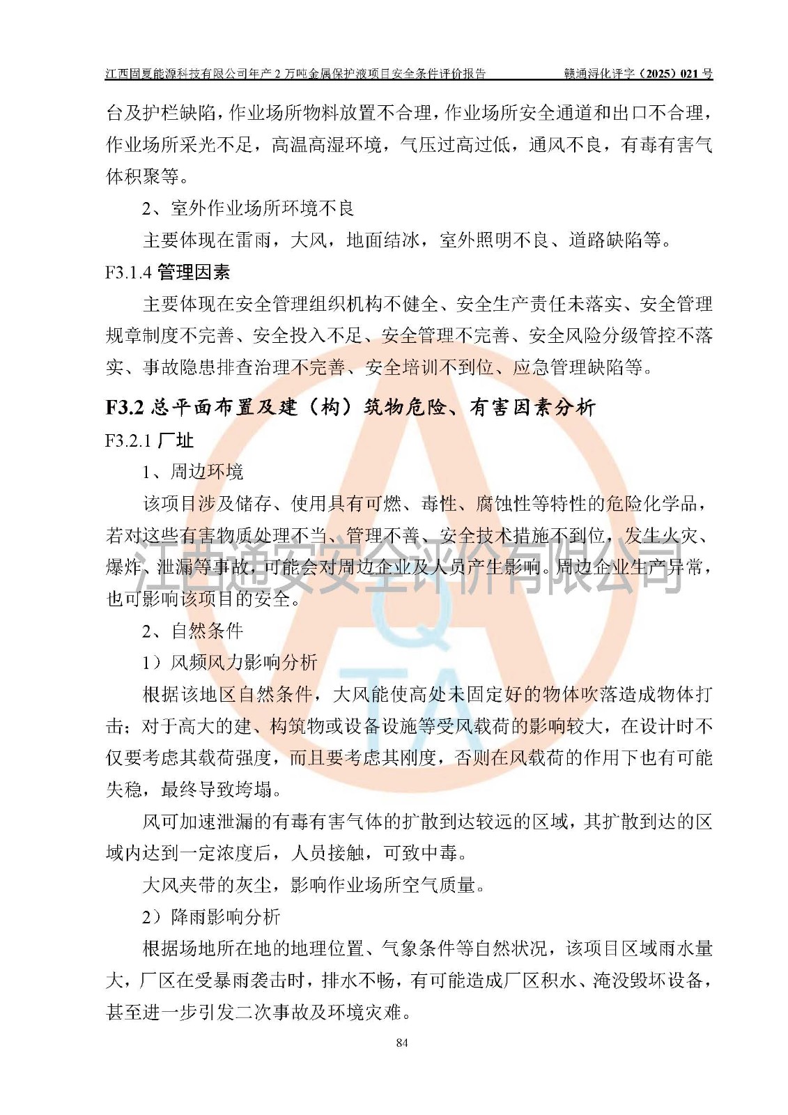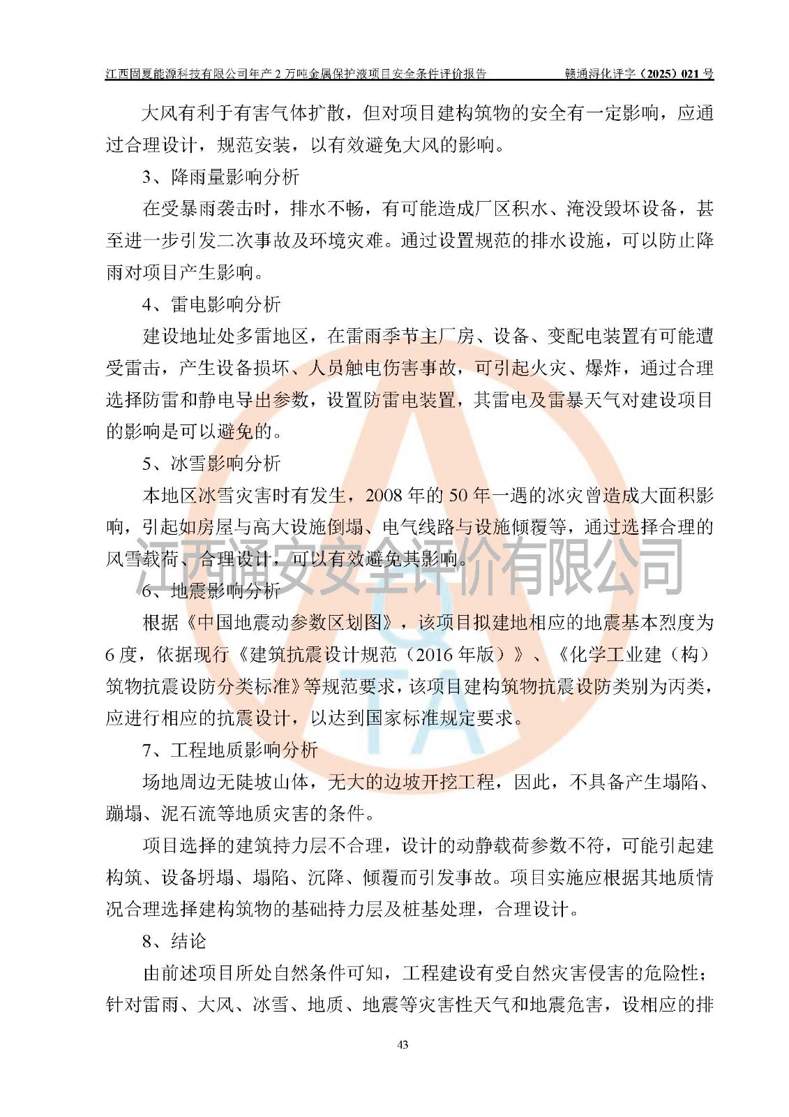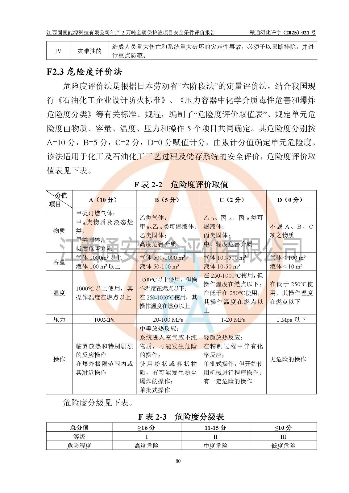 评价结论 | 江西固夏能源科技有限公司年产2万吨金属保护液项目的选址、总体布局、周边环境、自然环境能满足建设安全条件;项目选择的工艺过程及设备设施的安全可靠性能达到**法规、标准规定要求;项目存在的危险有害因素可控,在落实本评价报告提出的有关安全对策措施后,其危险有害程度能达到可以接受的程度,项目建设能够实现安全运行的目标。 | |||