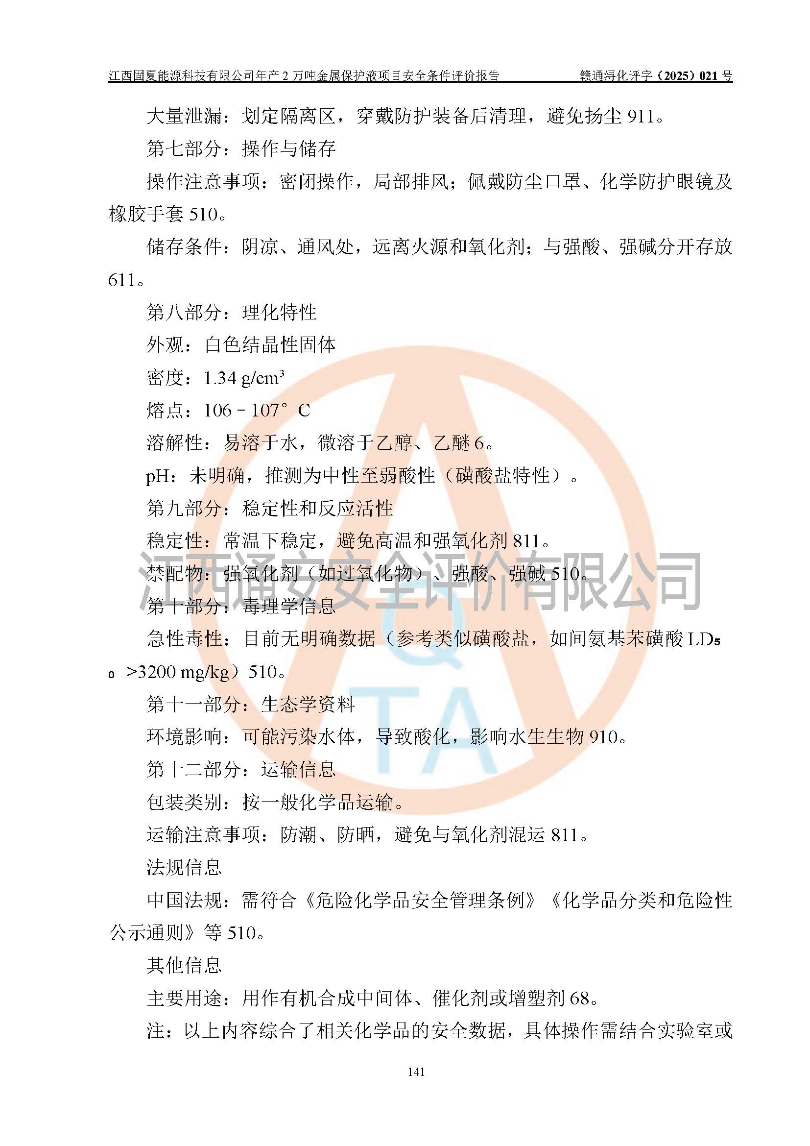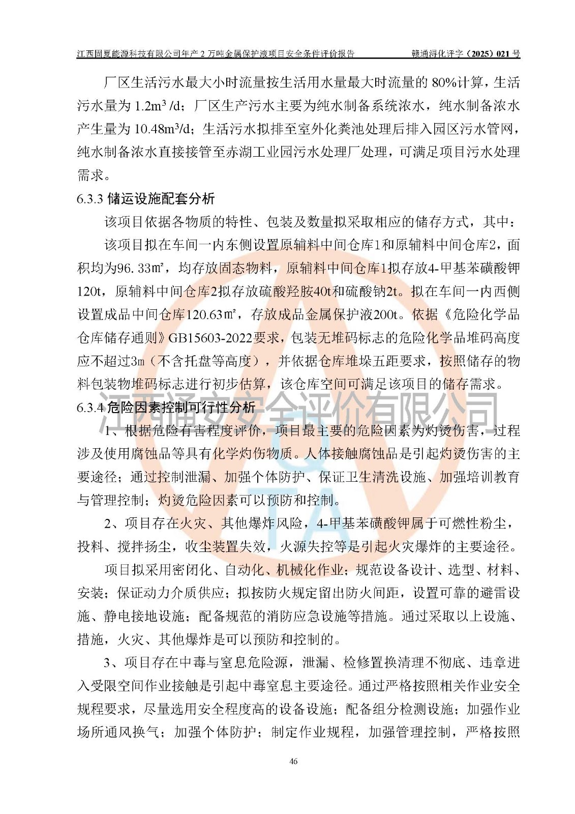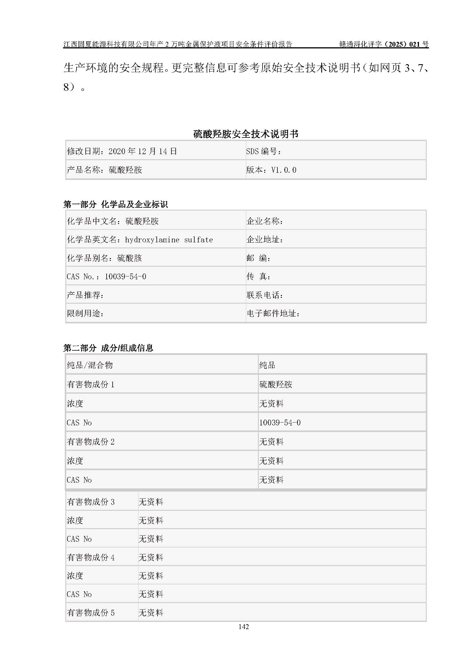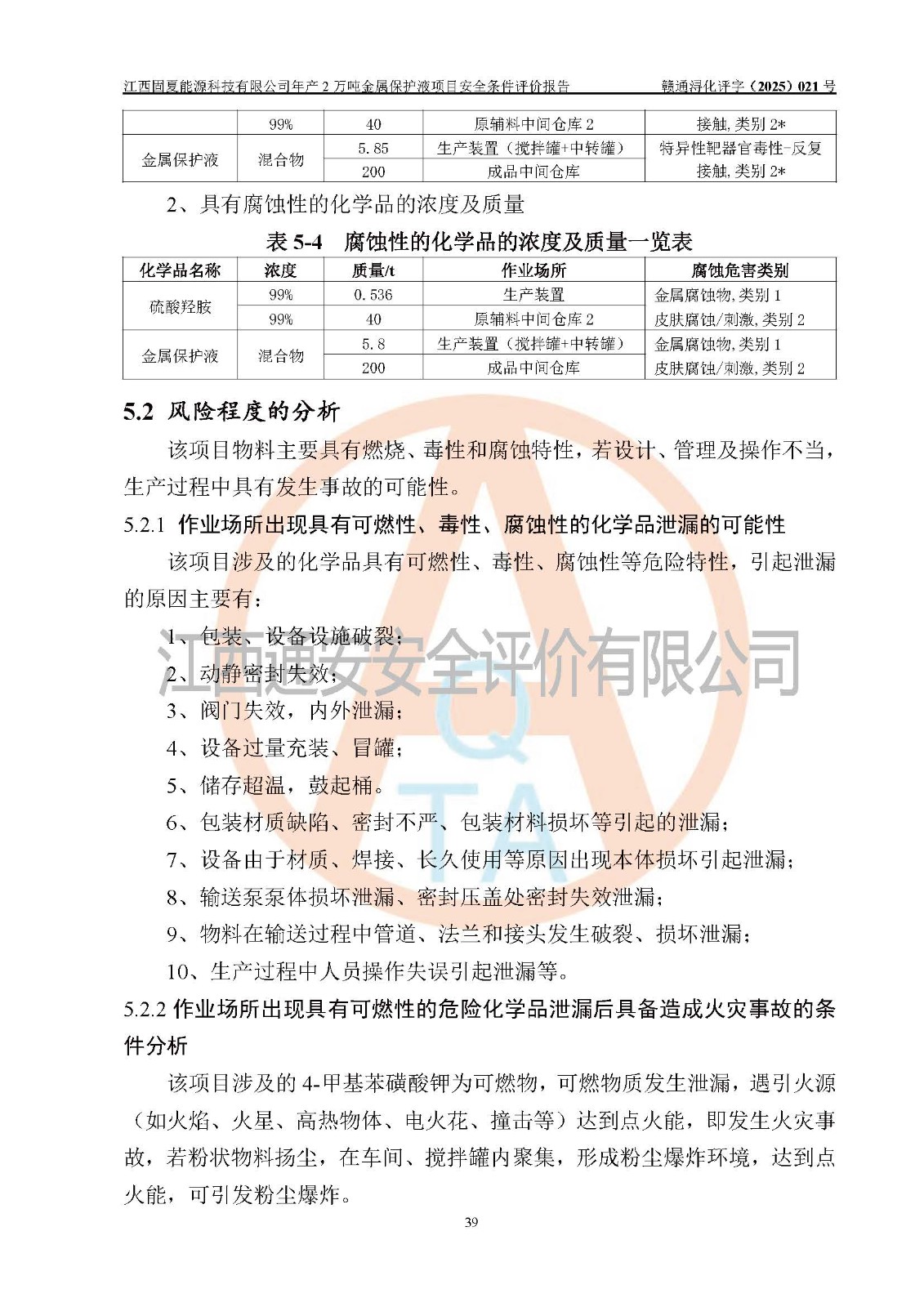 项目简介 | 江西固夏能源科技有限公司(以下简称“该公司”)是一家2024年11月成立的有限责任公司(自然人独资),注册地址为江西省九江市柴桑区赤湖工业园通江东大道6号,法定**人周金龙,注册资本500万元,主要从事**化工产品的生产、销售。 为满足市场需求,企业拟投资10000万元新建年产2万吨金属保护液项目,该项目厂区占地面积6773.00㎡(合约10.16亩)。该项目生产过程涉及列入目录的危险化学品:硫酸羟胺;产品金属保护液混合物中硫酸羟胺含量为12%,且依据企业提供的化学品危险性分类报告,属于危险化学品,该项目不涉及监控化学品、剧毒化学品、重点监管的危险化学品、易制毒化学品、特别管控危险化学品、高毒物品。 该项目生产工艺不涉及任何化学反应,仅为物理搅拌混合稀释,不涉及重点监管的典型危险化工工艺,生产单元和储存单元均不构成危险化学品重大危险源。 | |||
