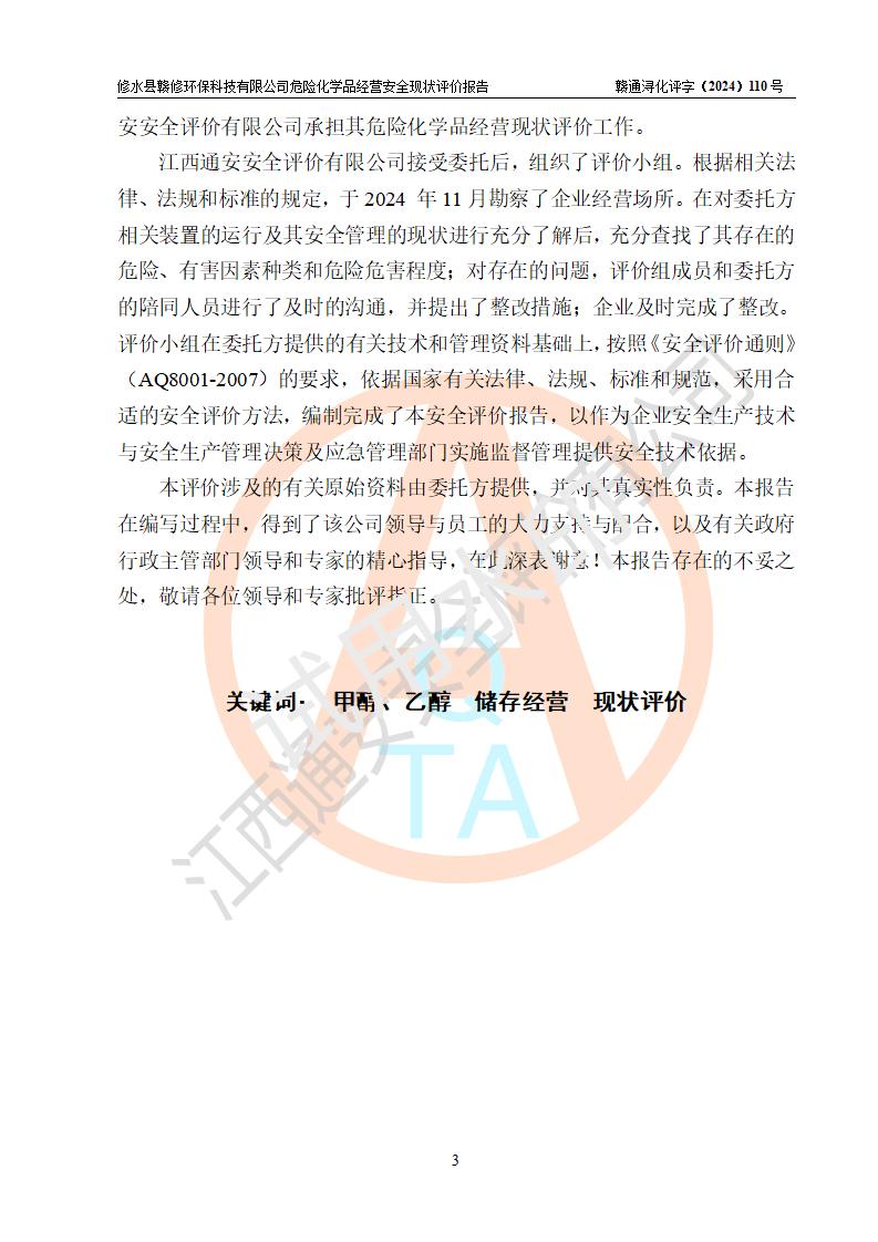 项目简介 | 修水县赣修**科技有限公司是一家从事储存经营甲醇、乙醇等危险化学品的有限责任公司(自然人投资或控股),法定**人慎冬玲。经营范围:许可项目:甲醇、乙醇,燃气燃烧器具安装、维修(依法须批准的项目,经相关部门批准后方可开展经营活动),一般项目:**咨询服务,技术服务、技术开发、技术咨询、技术交流、技术**、技术推广,非食用植物油加工 ,非食用植物油销售,**化学产品销售(不含危险化学品),生物质液体燃料生产工艺研发,化工产品销售(不含许可类化工产品),厨具卫具及日用杂品批发,日用品销售,非电力家用器具销售(除许可业务外,可自主依法经营法律法规非禁止或限制的项目)。企业住所位于江西省九江市修水县义宁镇站前路140号,注册资本伍拾万元整。现有员工5人,其中安全管理人员1人,法定**人慎冬玲。 该公司租赁修水县林业集团公司(汽配公司)位于九江市修水县北门神仙脑林业汽车配件公司场地,占地面积为500m2。该企业在储存、经营过程中涉及的危险化学品有甲醇、乙醇等。该公司设有1吨的方形桶储存甲醇、乙醇及配套设施,从事储存经营;设有1个甲类储存仓库,储存库占地面积105m2。企业经营过程中涉及的危险化学品均已列入《危险化学品目录(2015年版,2022年修改)》。该公司于2022年05月16日由九江市行政审批局签发的《危险化学品经营许可证》(证号:赣九行审经(甲)字[2022]000067),**期至2025年01月23日。 根据《危险化学品经营许可证管理办法》(**安监总局第55号令,第79号令修改)以及《江西省安全生产监督管理局关于贯彻﹤危险化学品经营许可证管理办法﹥的通知》(赣安监管二字﹝2013﹞14号)的要求,危险化学品经营许可证的**期为3年。**期满后,企业需要继续从事危险化学品经营活动的,应当在危险化学品经营许可证**期满3个月前,向发证机关提出危险化学品经营许可证的延期申请。申请证照延期的所有储存、经营危险化学品的单位,应当提供安全评价报告。修水县赣修**科技有限公司目前正在做危险化学品经营许可证延期换证的准备工作,故委托江西通安安全评价有限公司承担其危险化学品经营现状评价工作。 江西通安安全评价有限公司接受委托后,组织了评价小组。根据相关法律、法规和标准的规定,于2024 年11月勘察了企业经营场所。在对委托方相关装置的运行及其安全管理的现状进行充分了解后,充分查找了其存在的危险、有害因素种类和危险危害程度;对存在的问题,评价组成员和委托方的陪同人员进行了及时的沟通,并提出了整改措施;企业及时完成了整改。评价小组在委托方提供的有关技术和管理资料基础上,按照《安全评价通则》(AQ8001-2007)的要求,依据**有关法律、法规、标准和规范,采用合适的安全评价方法,编制完成了本安全评价报告,以作为企业安全生产技术与安全生产管理决策及应急管理部门实施监督管理提供安全技术依据。 本次安全评价范围为:修水县赣修**科技有限公司储存经营甲醇、乙醇等的储存装置和辅助设施,以及储存过程中涉及的设备设施的安全技术措施和安全管理措施。包括储存经营过程中的危险有害因素、安全生产条件以及工艺、设备设施的安全可靠性和安全管理的组织、机构、人员、防护设施、作业环境、管理制度等。 项目涉及的环境保护、消防、职业卫生等问题则应执行**的有关规定及相关标准。本评价引用到的**、消防、职业卫生等方面的法规标准与安全评价有**的关联,环境保护、职业卫生与消防应以其主管部门审核意见为准。厂外运输不在评价范围,出库后经危化品运输车分装至用户不在本次评价范围,只作一般性描述。 | ||||||
