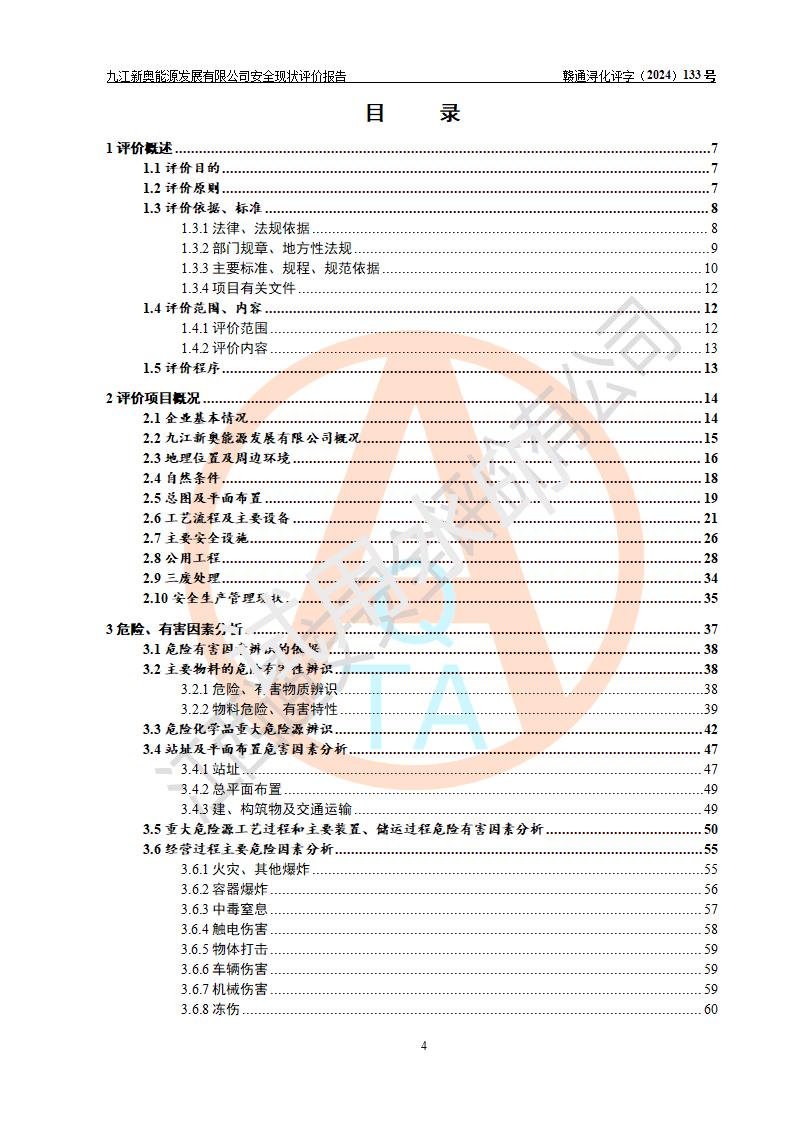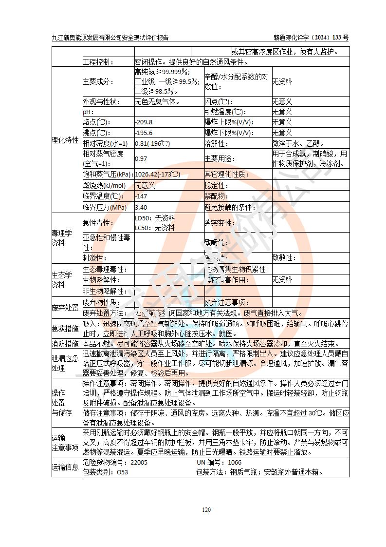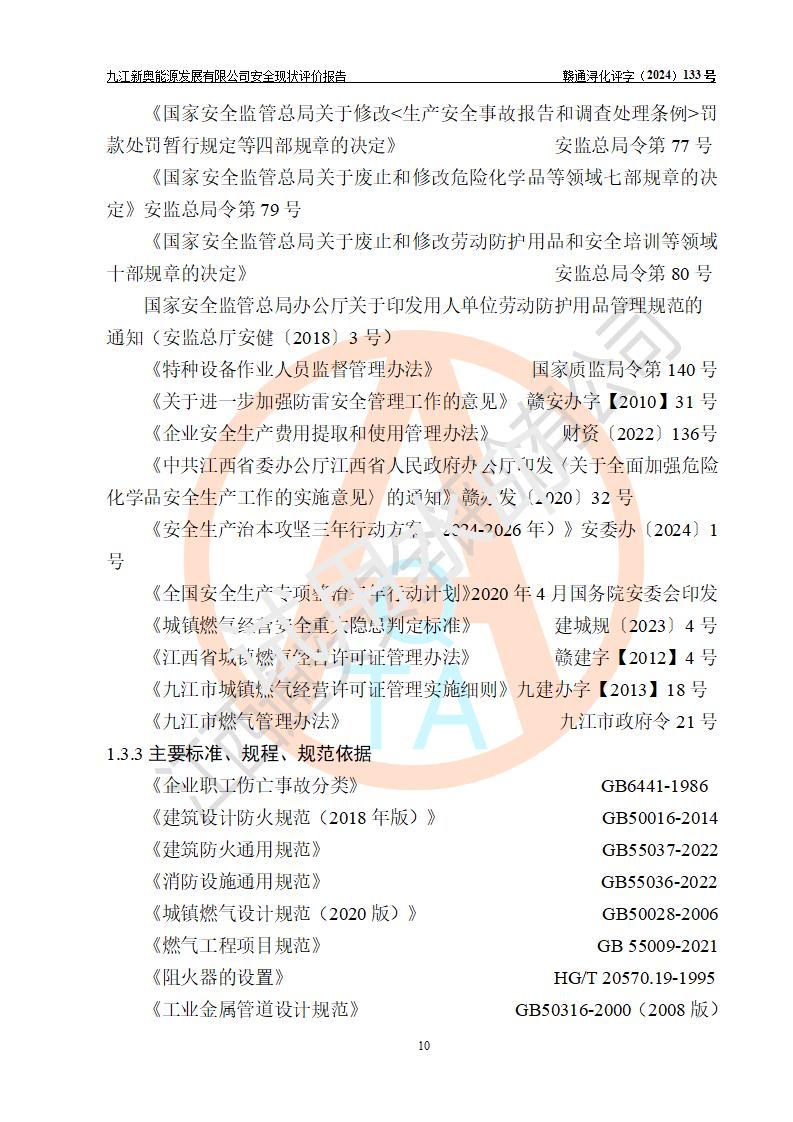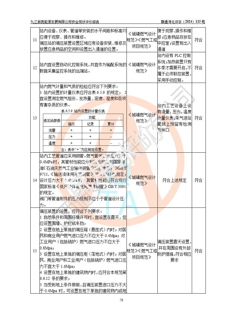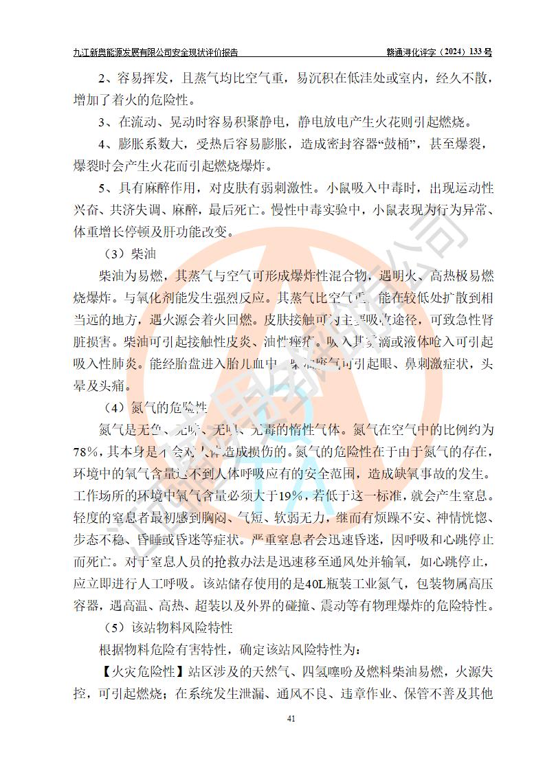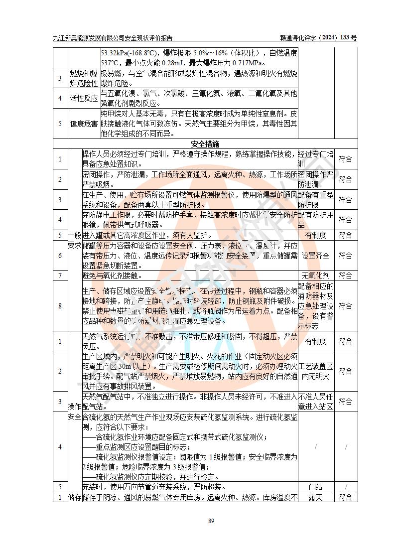 项目简介 | 九江新奥能源发展有限公司,成立于2017年12月6日,位于江西省九江市九江经济技术开发区城西港区港城大道189号,注册资金10000万元,法人**苏莉,属有限责任公司(台港澳法人独资)。经营范围:燃气供应、电力供应、蒸汽供应;分布式能源及新能源利用设施建设及运营管理;燃气管网的建设、供热管网的建设、配电网的建设、运营管理;管网燃气的工程设计及安装;合同能源管理;系能源技术开发、技术咨询、技术**、技术服务;商务信息咨询;能源管理数据库系统开发、管理;机电设备、暖道设备及其他能源利用设备的销售、租赁、技术服务(依法须经批准的项目,经相关部门批准后方可开展经营活动)。 公司在城西港港城大道建设有九江市城西港区泛能站(一期)项目,设有LNG储配站和高中压调压站合建站,LNG储备站作为应急调峰气源,上游门站管输天然气作为气源。高中压调压站建设规模:供气量7672.58万Nm3/年,高峰小时流量1.2×104Nm3/h;LNG气化站规模:总储量2×150m3。 该站2020年完成竣工验收,近三年以来,现场主要工艺装置、安全设施未发生过变化,无设计变更情况发生。 该站在供应天然气过程中,涉及的天然气、四氢噻吩、氮气(压缩的)均属于危险化学品;另外,发电机涉及的柴油也属于危险化学品;涉及的液化天然气属于**重点监管的危险化学品和特别管控危险化学品,不涉及剧毒化学品、高毒物品、易制毒化学品、监控化学品、易制爆化学品。该站LNG储罐区构成四级危险化学品重大危险源。 根据《中华人民共和国安全生产法》以及《城镇燃气管理条例》第四十一条规定,燃气经营者应当建立健全燃气安全评估和风险管理体系,按《九江市燃气管理办法》(**令21号)规定,燃气生产经营单位应当对本单位的燃气设施每三年进行一次安全评价。为此,九江新奥能源发展有限公司委托江西通安安全评价有限公司承担该公司的安全现状评价。 江西通安安全评价有限公司接受委托后,组成了评价小组,于2024年11月进行了现场勘察,对九江新奥能源发展有限公司LNG储配站和高中压调压站合建站的燃气设施的安全条件及安全管理进行了充分的了解,查找了其存在的危险、有害因素种类和程度,对存在的问题,评价组成员和委托方的陪同人员进行了及时的沟通,并提出了整改措施;按照《安全评价通则》(AQ8001-2007)的要求,依据**有关法律、法规、标准和规范,采用合适的安全评价方法,编制完成了本安全评价报告,以作为企业安全生产技术与安全生产管理决策及应急管理部门实施安全监督管理提供技术依据。 本次安全评价范围为:九江新奥能源发展有限公司选址及总平面布置、主体装置和辅助设施,包括站区内天然气接收装置、过滤、计量、调压、加臭设施、LNG储罐区等主体装置和公共辅助设施;评价该公司的安全管理制度、安全组织机构及其安全管理等。 九江新奥能源发展有限公司上、下游的管道及管道输送工程不在评价范围内;项目配套的行政、生活设施除总体布局外,不在评价范围内。本站LNG气化后向用户输送的中压管道及站区外的天然气管网以及站外天然气运输不在本评估范围内。 本评价引用到的**、消防方面的法规标准与安全评价有**的关联,本评价涉及的环境保护与消防评价内容,不****和消防主管部门的意见,环境保护与消防应以其主管部门检查的意见为准;自然灾害方面不包括在本评价范围内,只对涉及部分做一般性评述。 | ||||||