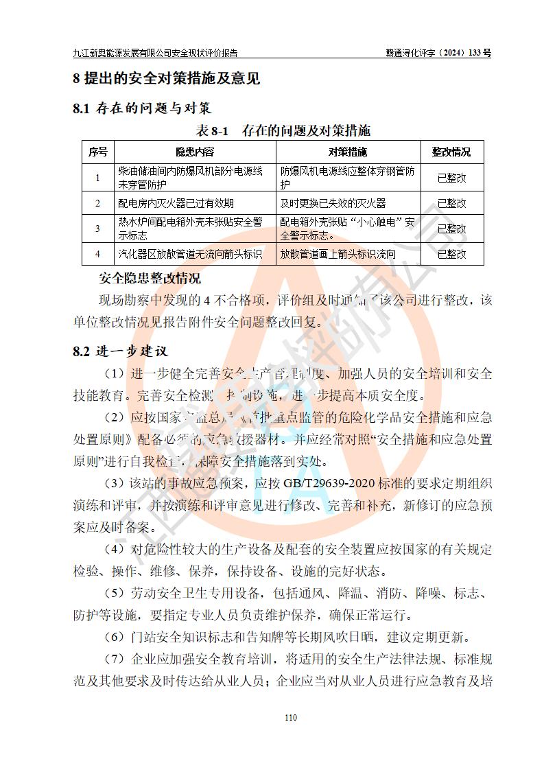 评价结论 | 九江新奥能源发展有限公司配套的安全设施及安全生产管理符合有关法规、标准规范要求,在落实本报告提出的安全对策措施与建议后,其风险可控,能达到可以接受的程度,可满足安全生产条件。 | ||||||