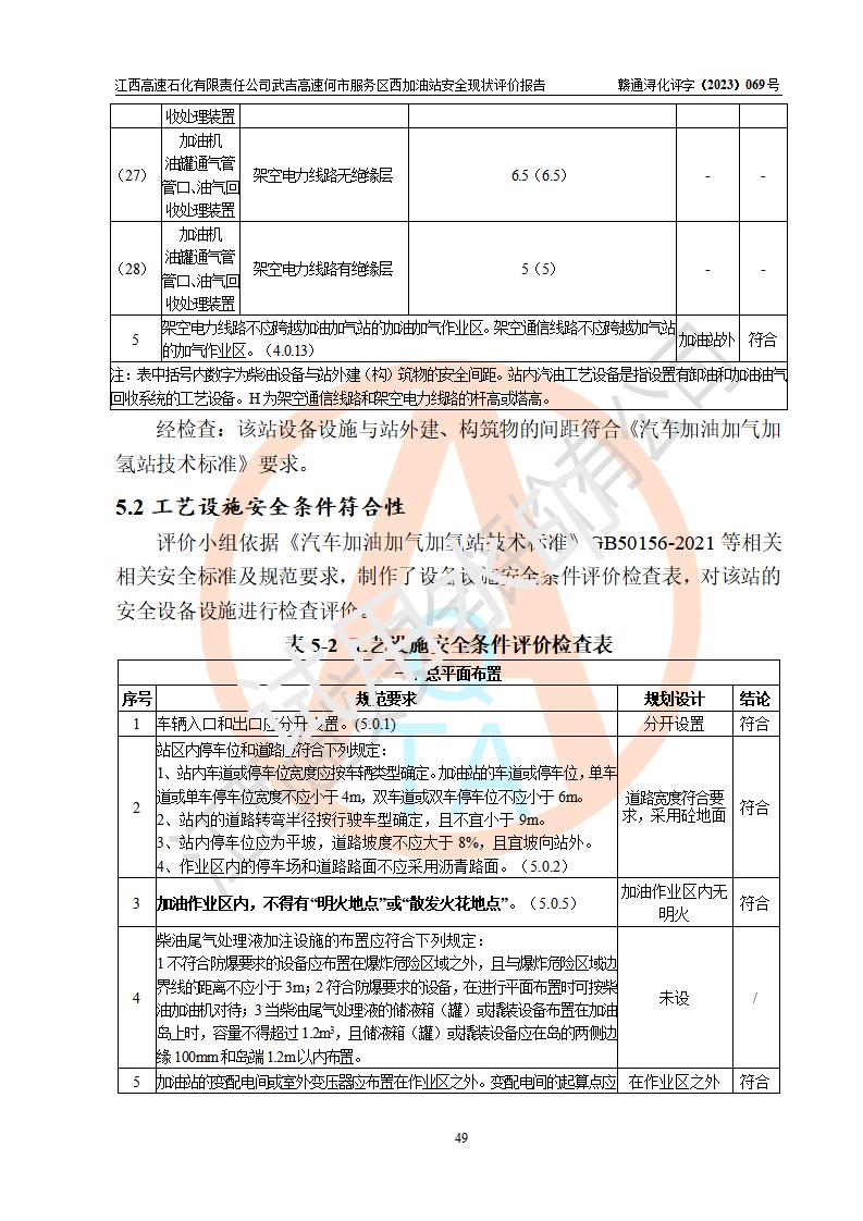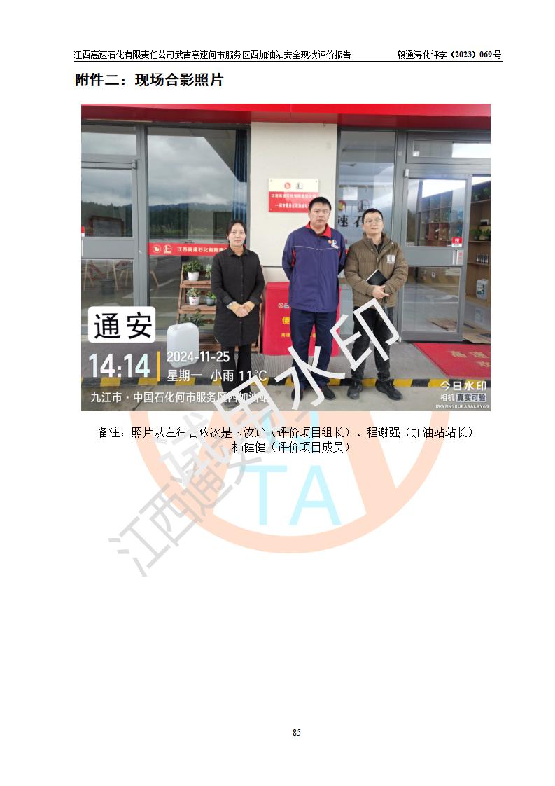 项目简介 | 江西高速石化有限责任公司武吉高速何市服务区西加油站是一家专门从事成品油零售经营的其他有限责任公司分公司,经营场所位于江西省九江市修水县武吉高速何市西服务区,该站现有员工7人,主要负责人程谢强。 该加油站占地面积约1511.3m2,站内设有地下直埋卧式双层油罐5台,分别50m3汽油罐2台、30m³汽油罐1台,50m3柴油罐2台,储罐总容积230m3,柴油罐容积折半计入油罐总容积则为180m³,按现行《汽车加油加气加氢站技术标准》对加油站的等级划分原则,该站属一级加油站。 该站由九江市行政审批局换发《危险化学品经营许可证》(证号:赣九危化经字[2023]000093号),**期限2022年02月26日至2025年02月25日。 | |||