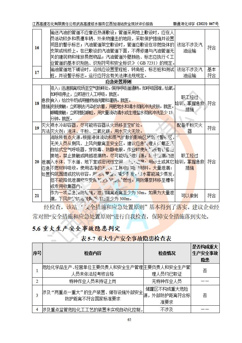 评价结论 | 江西高速石化有限责任公司武吉高速修水服务区西加油站涉及的安全条件、安全经营条件、安全生产管理符合《危险化学品经营许可证管理办法》、《汽车加油加气加氢站技术标准》等**有关法规、标准、规范要求,能满足危险化学品经营安全条件。 | |||