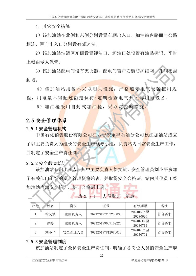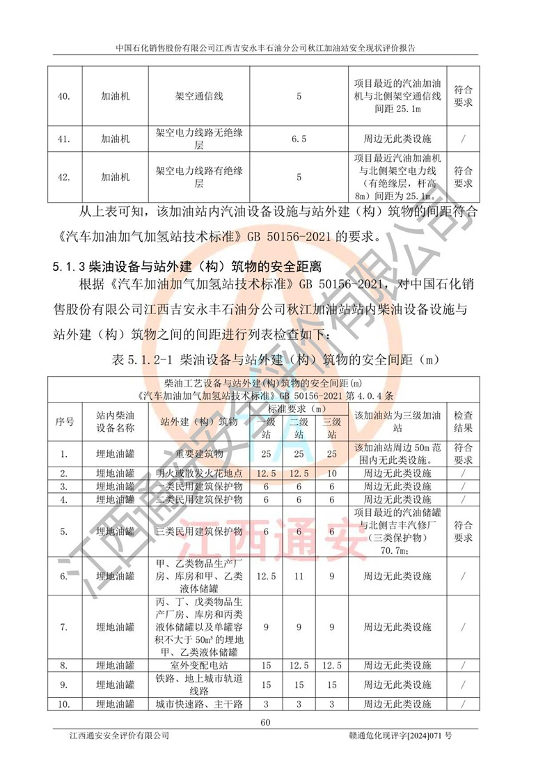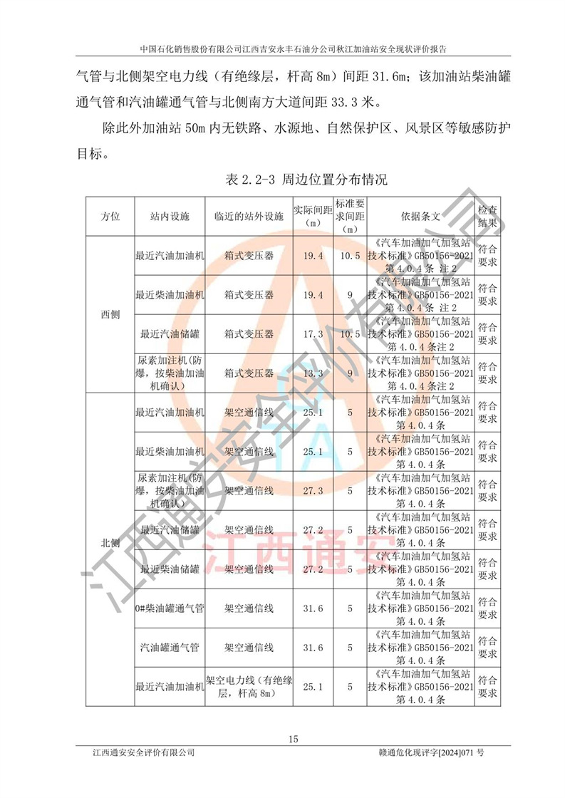 评价结论 | 中国石化销售股份有限公司江西吉安永丰石油分公司秋江加油站符合《汽车加油加气加氢站技术标准》GB50156-2021等标准规范的要求,安全风险可控,满足危险化学品经营的安全条件。 | |||