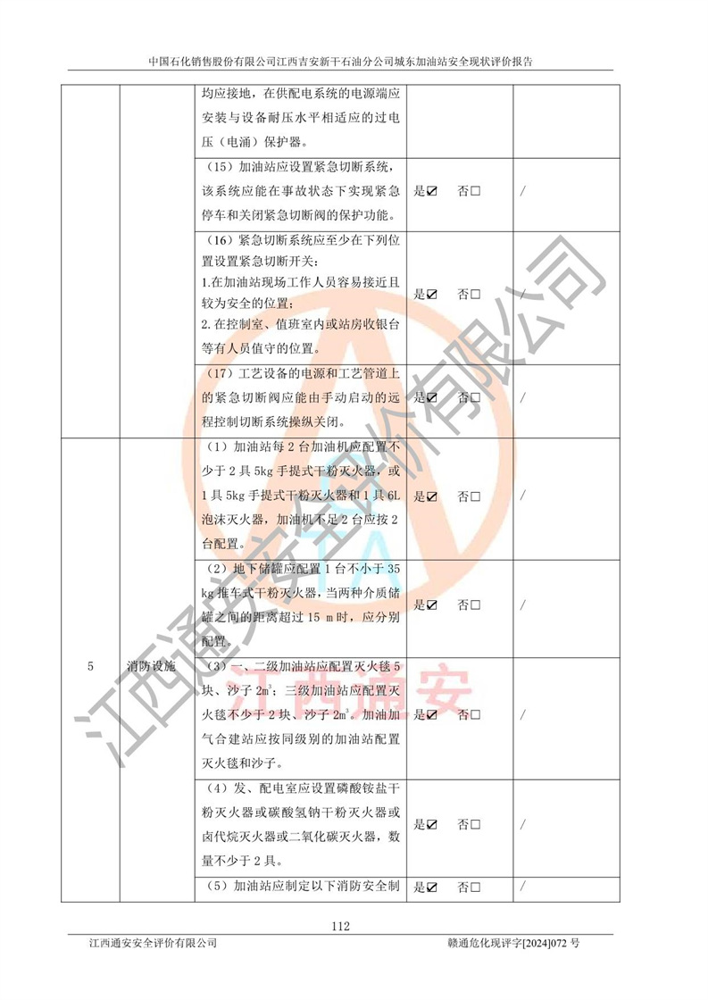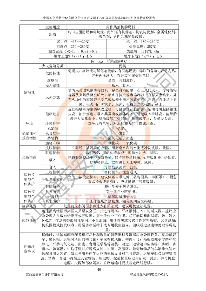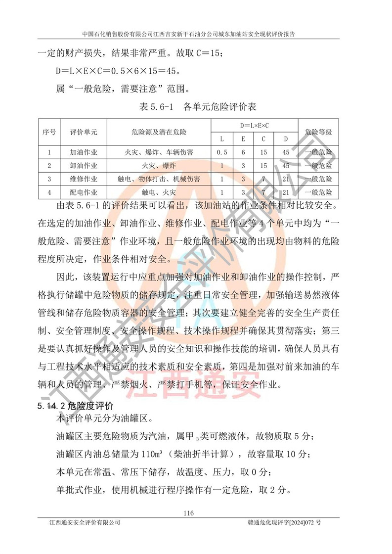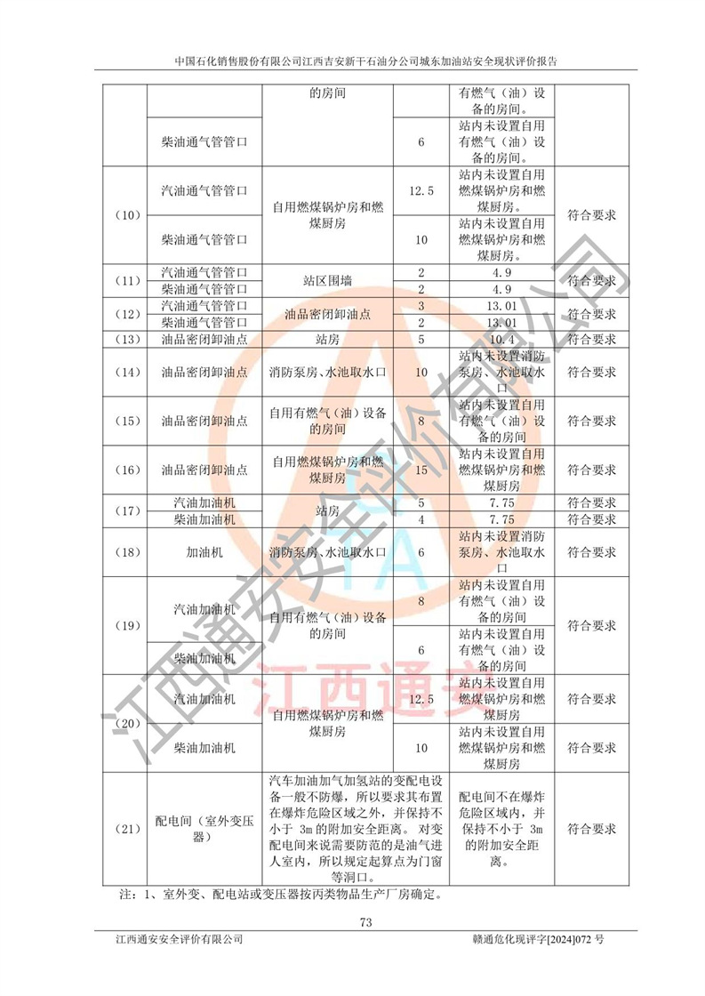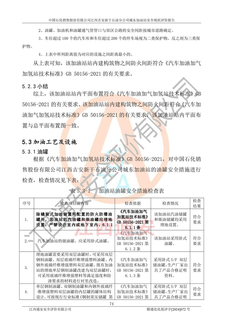 评价结论 | 中国石化销售股份有限公司江西吉安新干石油分公司城东加油站符合《汽车加油加气加氢站技术标准》GB50156-2021等标准规范的要求,安全风险可控,满足危险化学品经营的安全条件。 | |||