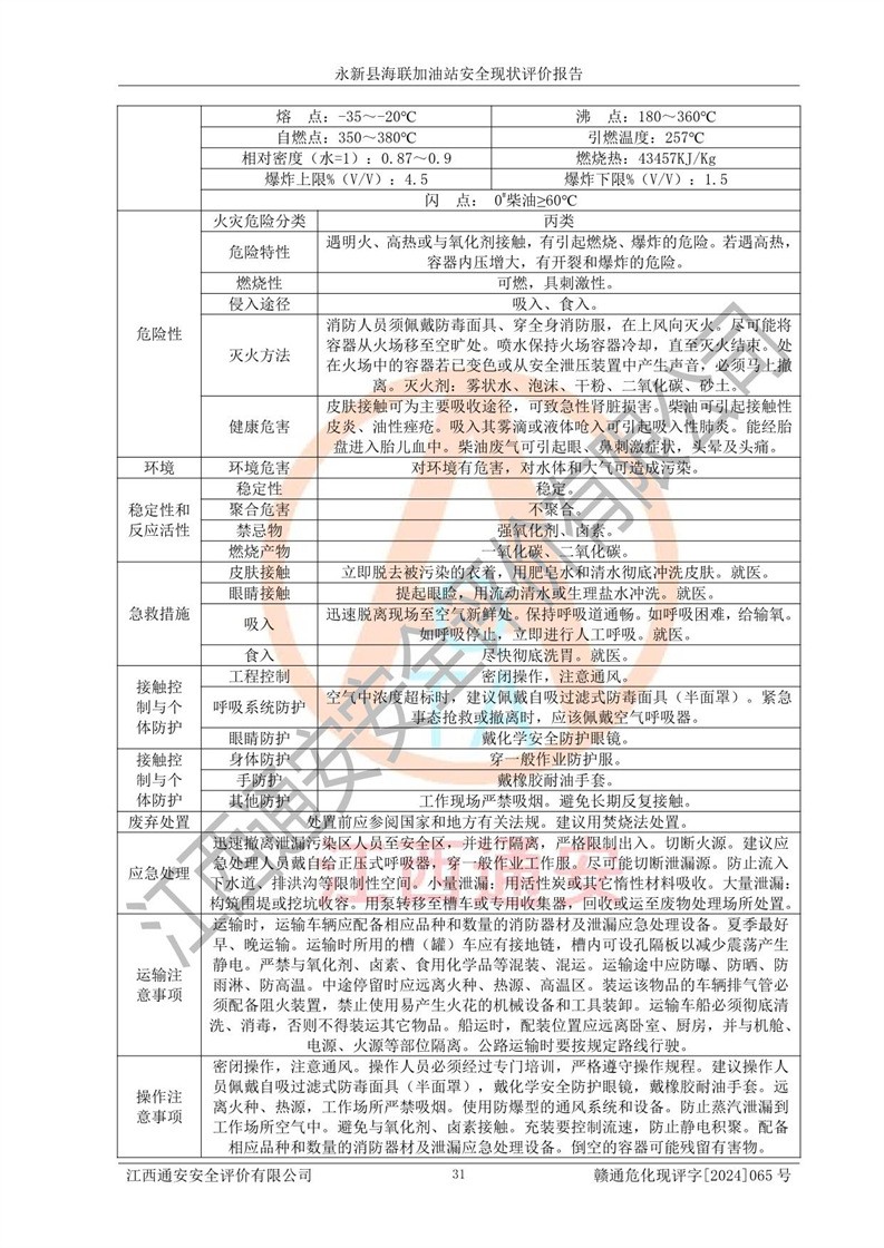 项目简介 | 永新县海联加油站成立于2009年9月8日,住所位于江西省吉安市永新县高市乡芦溪村319国道旁。该加油站经营许可范围:许可项目:成品油零售(依法须经批准的项目,经相关部门批准后方可开展经营活动,具体经营项目以相关部门批准文件或许可证件为准)。 永新县海联加油站设2台0#柴油/0#柴油双枪加油机,2台92#汽油/95#汽油双枪加油机,1台92#汽油/92#汽油双枪加油机;设置4台SF双层埋地储罐,其中包括:1台50m³92#汽油双层埋地储罐;1台35m³92#汽油双层埋地储罐;1台50m³0#柴油双层埋地储罐;1台35m³95#汽油双层埋地储罐;总储量为170m³,柴油折半后总容积为145m³,加油站等级为二级,汽油卸油、加油设置了油气回收系统。 该加油站的主要化学品物质是汽油和柴油。根据危险化学品目录[2015年版]》(**安监总局等十部门[2015]第5号)以及《应急管理部办公厅关于修改《危险化学品目录(2015版)实施指南(试行)》涉及柴油部分内容的通知》(应急厅函〔2022〕300号)、应急管理部 工业和信息化部 公安部 生态环境部 交通运输部 农业农村部 卫生健康委 市场监管总局 铁路局 民航局公告2022年第8号决定调整《危险化学品目录(2015版)》,将“1674柴油[闭杯闪点≤60℃]”调整为“1674柴油”等文件进行辨识:该加油站经营的汽油、柴油均属于危险化学品。 | |||