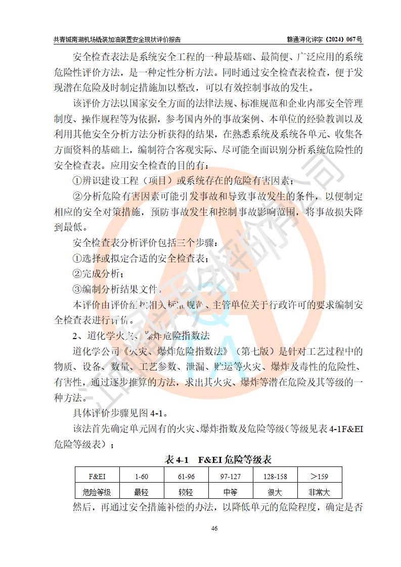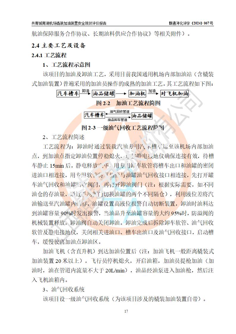 评价结论 | 九共青城南湖机场内橇装加油装置涉及的安全条件、安全运营条件、安全生产管理等方面在落实本报告安全对策措施建议后,符合《通用航空供油工程建设规范》MH/T 5030-2014、《汽车加油加气加氢站技术标准》GB50156-2021、《橇装式汽车加油站技术标准》SH/T 3134-2023等**有关法规、标准、规范要求。 | |||
