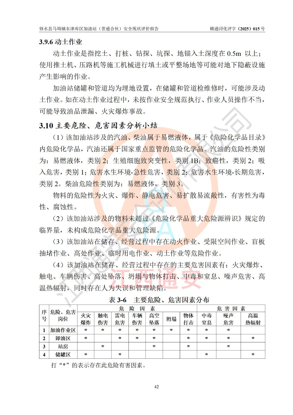 项目简介 | 修水县马坳镇东津库区加油站(普通合伙)是一家专门从事成品油零售经营的普通合伙企业,经营场所位于江西省九江市修水县马坳镇东津村。现有从业人员8名,其中安全管理人员1人,加油站负责人徐益林。 该加油站占地面积2666.66m2,站区内设置有4台四枪程控燃油加油机及配套的工艺管线,设有SF双层储罐3台,其中40m3的92#汽油储罐1台、50m3的0#柴油储罐1台、40m3的95#汽油储罐1台,油品储罐总容积为130m3(折算成汽油为105m3),按现行《汽车加油加气加氢站技术标准》对加油站的等级划分原则,属二级加油站。 该站由九江市行政审批局换发《危险化学品经营许可证》(证号:赣九行审经(甲)字[2022]000055号),**期限2022年04月09日至2025年04月08日。 | |||