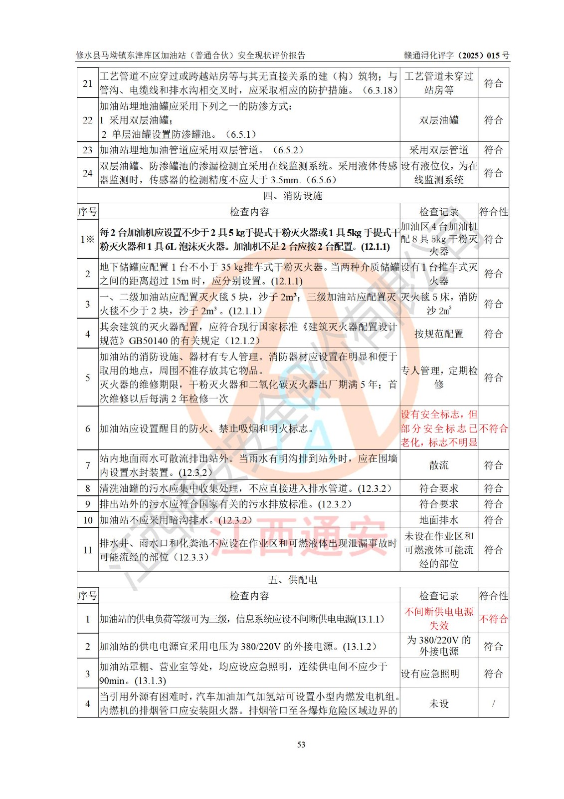 评价结论 | 修水县马坳镇东津库区加油站(普通合伙)涉及的安全条件、安全经营条件、安全生产管理符合《危险化学品经营许可证管理办法》、《汽车加油加气加氢站技术标准》等**有关法规、标准、规范要求,能满足危险化学品经营安全条件。 | |||