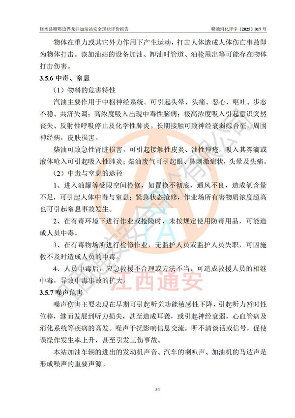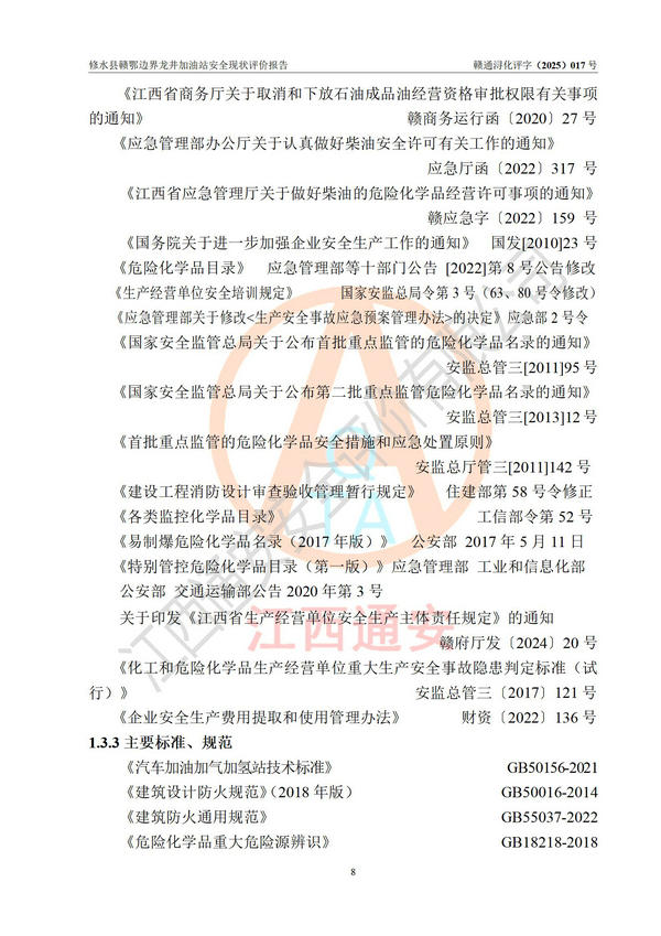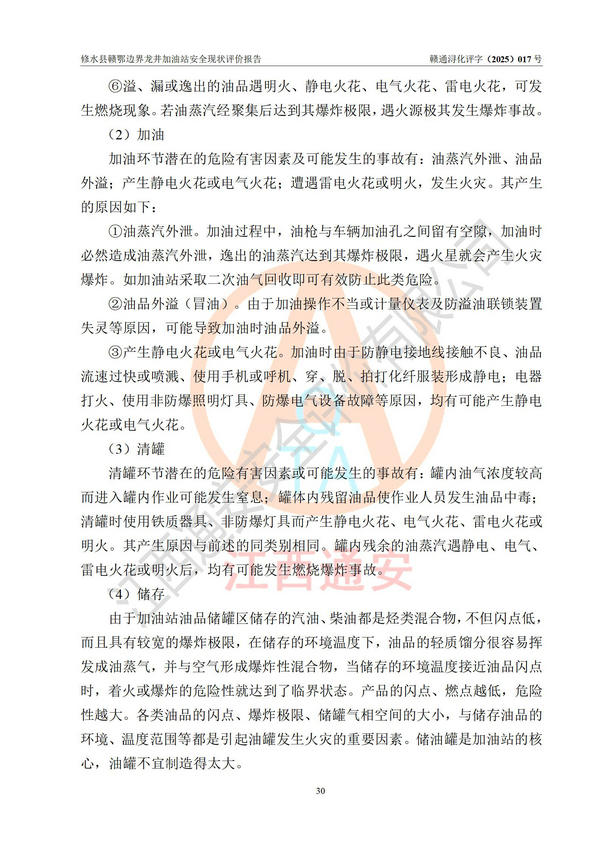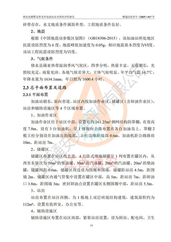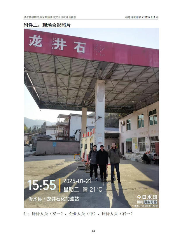 评价结论 | 修水县赣鄂边界龙井加油站涉及的安全条件、安全经营条件、安全生产管理符合《危险化学品经营许可证管理办法》、《汽车加油加气加氢站技术标准》等**有关法规、标准、规范要求,能满足危险化学品经营安全条件。 | |||