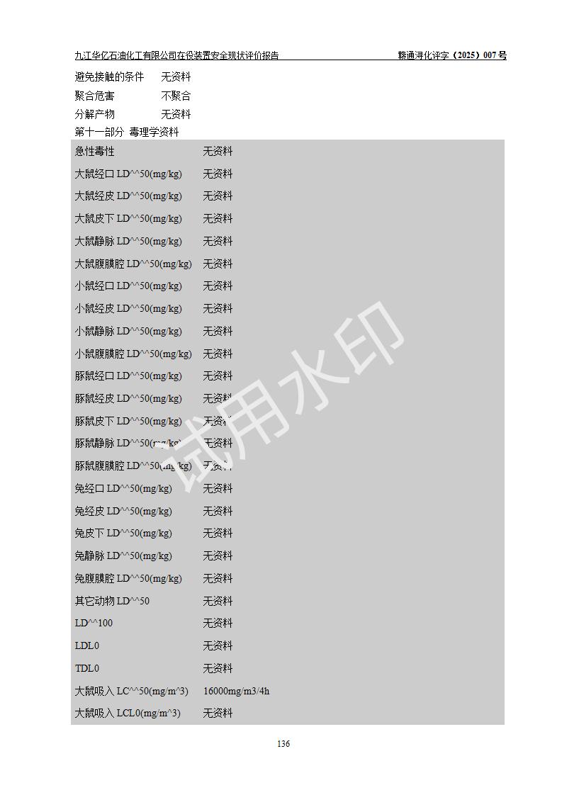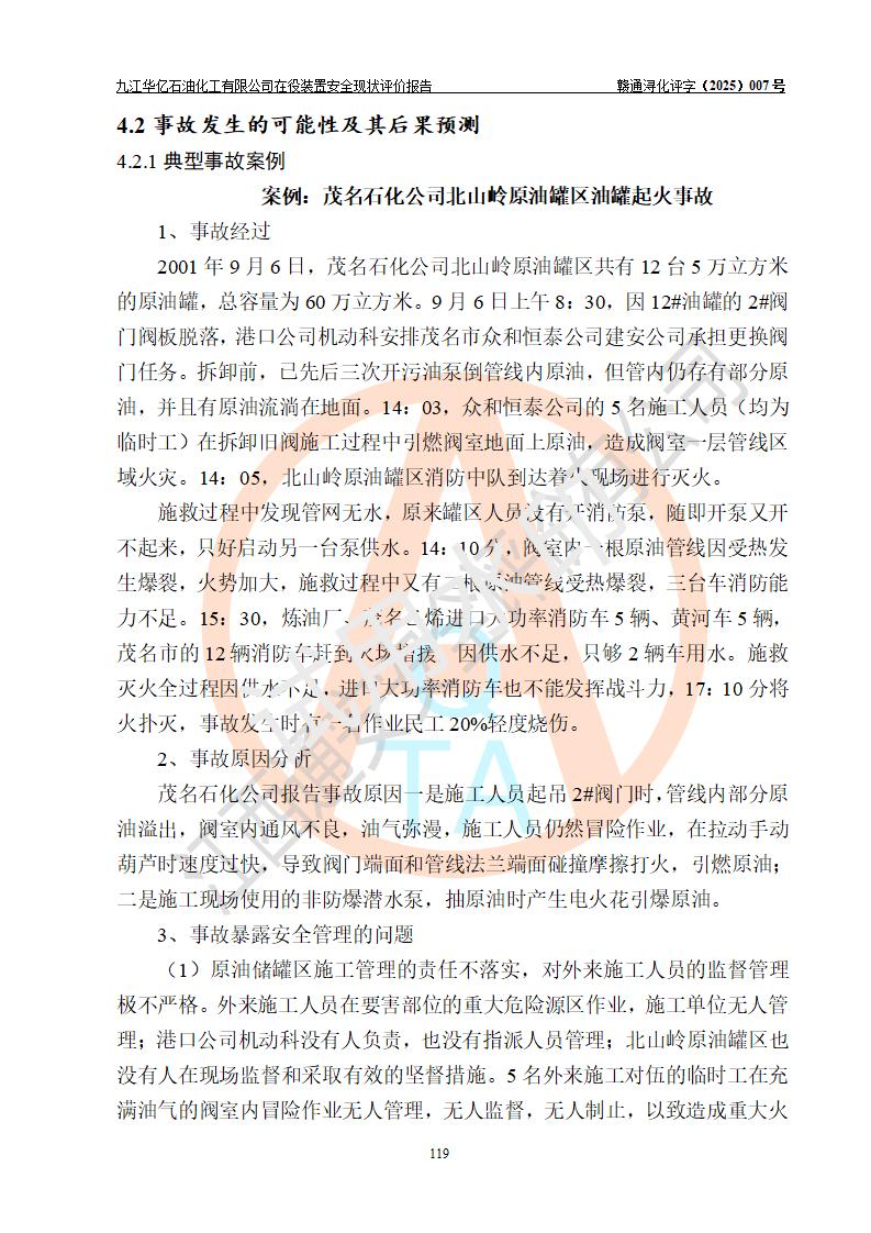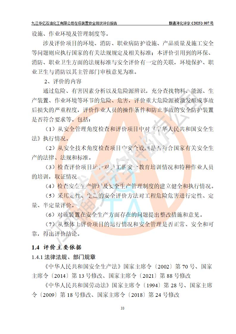 评价结论 | 经评价组评价,九江华亿石油化工有限公司现场总体布局、设备布置、DCS/SIS系统情况与安全设计图纸一致;企业在役装置涉及重点监管危险化学品、重大危险源,相关自控系统配置与安全设计相符并正常投用;企业主要负责人董事长、总经理、生产、技术、设备负责人及安全管理人员均已具有化工类大专以上相关专业学历,已取得危险化学品生产企业主要负责人及安全管理人员考核合格证。 九江华亿石油化工有限公司在役生产装置配套安全装置、防护设施以及采取的安全技术措施及安全管理措施符合**有关法规、标准、规范要求,符合《危险化学品生产企业安全生产许可证实施办法》规定的安全生产条件,项目风险可控,满足安全生产条件。