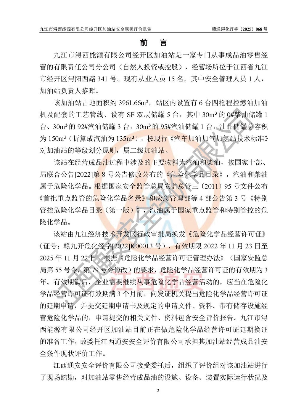 评价结论 | 九江市浔西能源有限公司经开区加油站涉及的安全条件、安全经营条件、安全生产管理符合《危险化学品经营许可证管理办法》、《汽车加油加气加氢站技术标准》等**有关法规、标准、规范要求,能满足危险化学品经营安全条件。 | |||