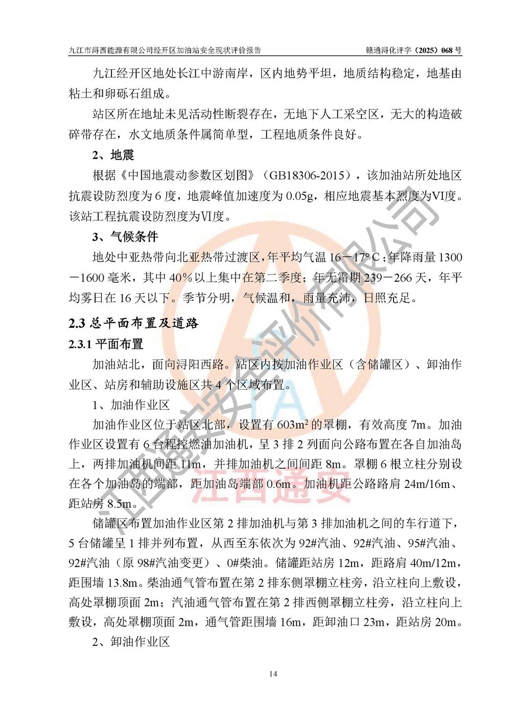 项目简介 | 九江市浔西能源有限公司经开区加油站是一家专门从事成品油零售经营的有限责任公司分公司(自然人投资或控股),经营场所位于江西省九江市经开区浔阳西路341号。现有从业人员15名,其中安全管理人员1人,加油站负责人黎晖。 该加油站占地面积约3961.66m2,站区内设置有6台四枪程控燃油加油机及配套的工艺管线、设有SF双层储罐5台,其中30m3的0#柴油储罐1台、30m3的92#汽油储罐3台,30m3的95#汽油储罐1台,油品储罐总容积为150m3(折算成汽油为135m3),按现行《汽车加油加气加氢站技术标准》对加油站的等级划分原则,属二级加油站。 该站由九江经济技术开发区行政审批局换发《危险化学品经营许可证》(证号:赣九开危化经字[2022]K00013号),**期限2022年11月23日至2025年11月22日日。 | |||