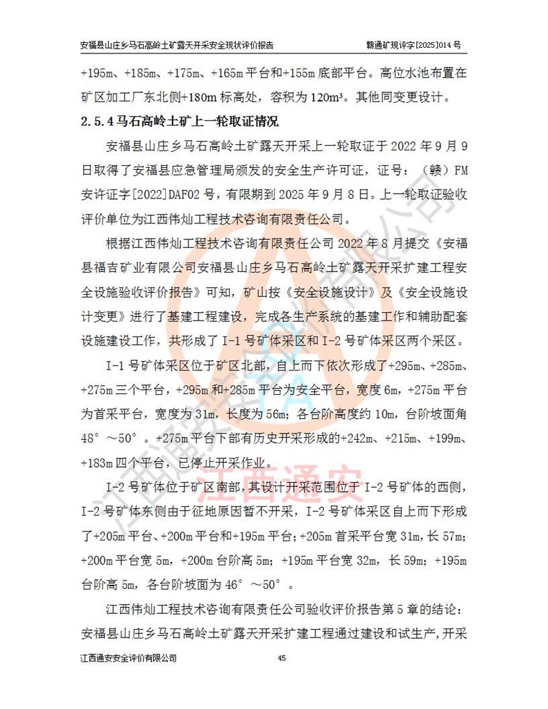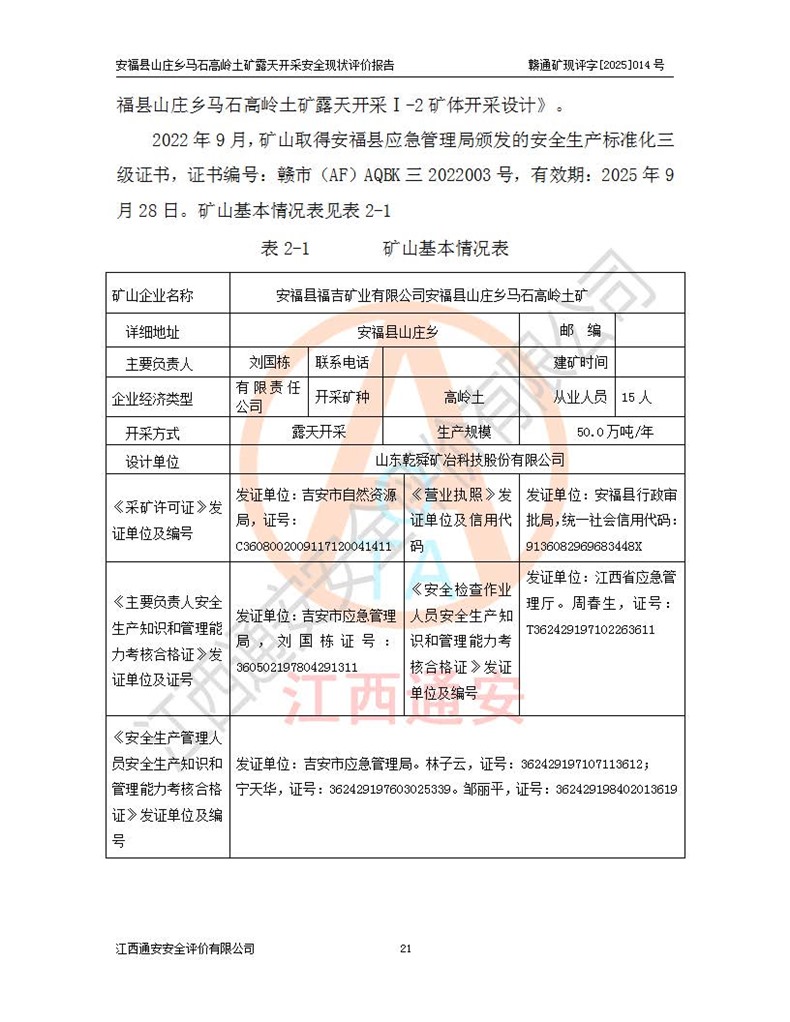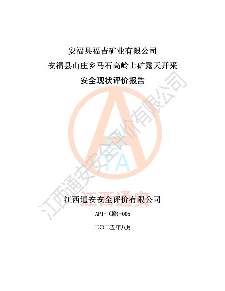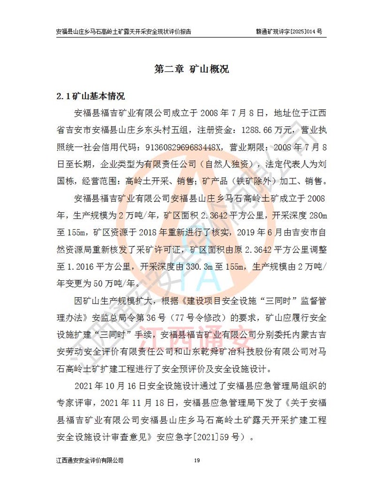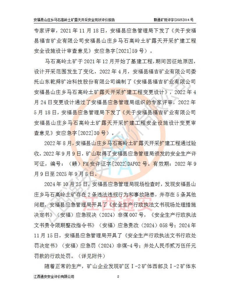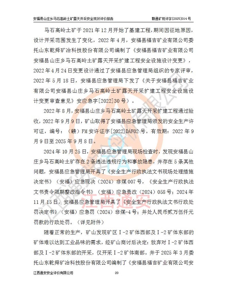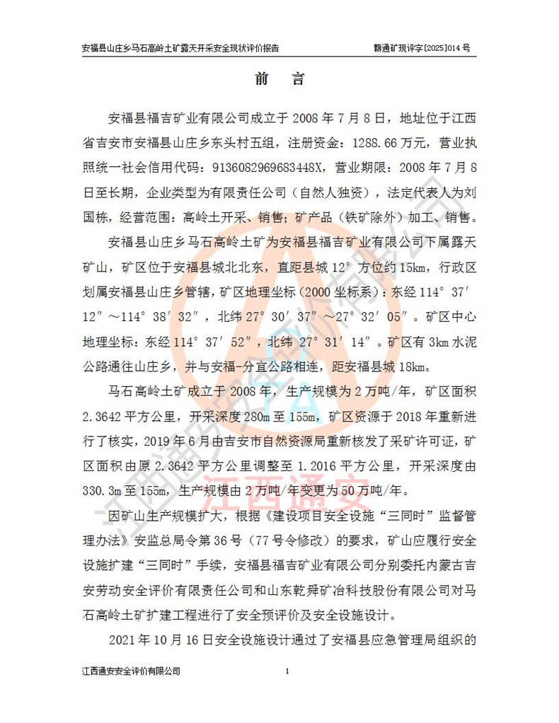 安福县福吉矿业有限公司成立于2008年7月8日,地址位于江西省吉安市安福县山庄乡东头村五组,注册资金:1288.66万元,营业执照统一社会信用代码:9136082969683448X,营业期限:2008年7月8日至长期,企业类型为有限责任公司(自然人独资),法定**人为刘国栋,经营范围:高岭土开采、销售;矿产品(铁矿除外)加工、销售。 安福县山庄乡马石高岭土矿为安福县福吉矿业有限公司下属露天矿山,矿区位于安福县城北北东,直距县城12°方位约15km,行政区划属安福县山庄乡管辖,矿区地理坐标(2000坐标系):东经114°37′12″~114°38′32″,北纬27°30′37″~27°32′05″。矿区中心地理坐标:东经114°37′52″,北纬 27°31′14″。矿区有3km水泥公路通往山庄乡,并与安福-分宜公路相连,距安福县城18km。 马石高岭土矿成立于2008年,生产规模为2万吨/年,矿区面积2.3642平方**,开采深度280m至155m,矿区资源于2018年重新进行了核实,2019年6月由吉安市自然资源局重新核发了采矿许可证,矿区面积由原2.3642平方**调整至1.2016平方**,开采深度由330.3m至155m,生产规模由2万吨/年变更为50万吨/年。 因矿山生产规模扩大,根据《建设项目安全设施“三同时”监督管理办法》安监总局令第36号(77号令修改)的要求,矿山应履行安全设施扩建“三同时”手续,安福县福吉矿业有限公司分别委托内蒙古吉安劳动安全评价有限责任公司和山东乾舜矿冶科技股份有限公司对马石高岭土矿扩建工程进行了安全预评价及安全设施设计。 2021年10月16日安全设施设计通过了安福县应急管理局组织的专家评审,2021年11月18日,安福县应急管理局下发了《关于安福县福吉矿业有限公司安福县山庄乡马石高岭土矿露天开采扩建工程安全设施设计审查意见》安应急字[2021]59号)。 马石高岭土矿于2021年12月开始了基建工程,期间因征地原因,设计开采范围发生了变化,2022年4月,安福县福吉矿业有限公司委托山东乾舜矿冶科技股份有限公司编制了《安福县福吉矿业有限公司安福县山庄乡马石高岭土矿露天开采扩建工程变更设计》,2022年4月24日变更设计通过了安福县应急管理局组织的专家评审,2022年5月18日,安福县应急管理局下发了《关于安福县福吉矿业有限公司安福县山庄乡马石高岭土矿露天开采扩建工程安全设施设计变更审查意见》安应急字[2022]30号)。 2022年8月,安福县山庄乡马石高岭土矿露天开采扩建工程通过验收,2022年9月9日,矿山取得了安福县应急管理局颁发的安全生产许可证,编号:(赣)FM安许证字[2022]DAF02号。**期:2022年9月9日至2025年9月8日。 2024年10月25日,安福县应急管理局现场检查时,发现安福县山庄乡马石高岭土矿存在2条违法违规行为和事故隐患,并存在5条其他问题,安福县应急管理局开具了《安全生产行政执法文书现场处理措施决定书》(安福)应急现决(2024)非煤007号,《安全生产行政执法文书责令限期整改指令书》(安福)应急责改(2024)058号;2024年11月15日,安福县应急管理局开具了《安全生产行政执法文书行政处罚决定书》(安福)应急罚(2024)非煤-4号;并处人民币贰万伍仟元罚款的行政处罚。 随着正常的生产,矿山企业发现矿区Ⅰ-2矿体西部及Ⅰ-2矿体东部的矿体难以达到工业品味的需求,经矿山企业商讨后决定:放弃对Ⅰ-2矿体西部及Ⅰ-2矿体东部的开采,仅开采Ⅰ-2矿体南部,并于2025年3月委托山东乾舜矿冶科技股份有限公司编制了《安福县福吉矿业有限公司安福县山庄乡马石高岭土矿露天开采Ⅰ-2矿体开采设计》。 依照《非煤矿矿山企业安全生产许可证延期换证工作》的通知,根据***《安全生产许可证条例》、《江西省安全生产条例》、《非煤矿山安全生产许可证实施办法》、《江西省非煤矿矿山企业安全生产许可证办法》规定及非煤矿山安全评价导则的要求,受安福县福吉矿业有限公司的委托,我公司承担安福县山庄乡马石高岭土矿露天开采延期换证的安全现状评价工作。  |