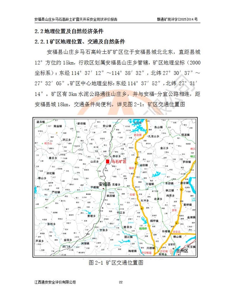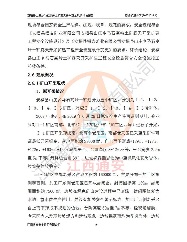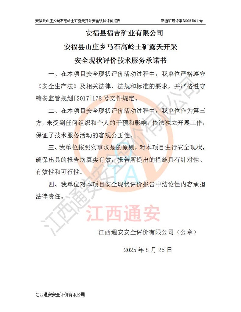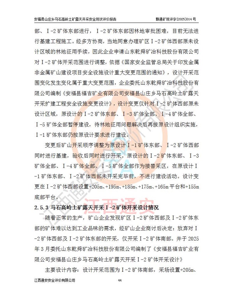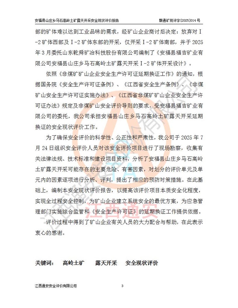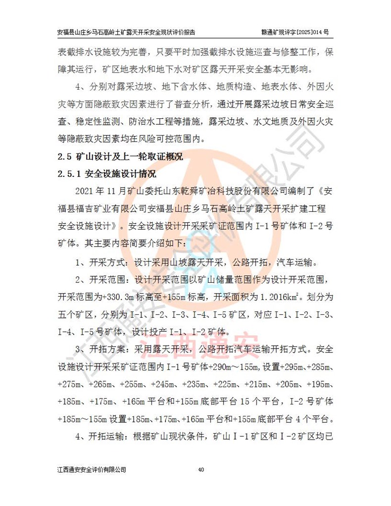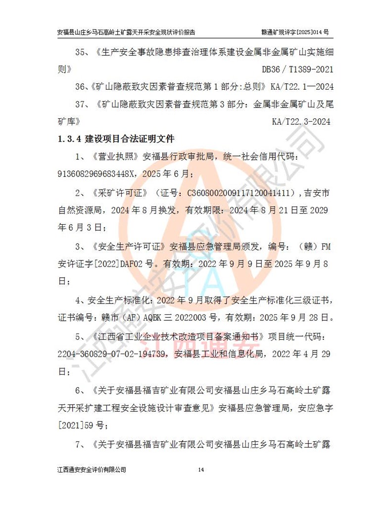 安福县福吉矿业有限公司成立于2008年7月8日,地址位于江西省吉安市安福县山庄乡东头村五组,注册资金:1288.66万元,营业执照统一社会信用代码:9136082969683448X,营业期限:2008年7月8日至长期,企业类型为有限责任公司(自然人独资),法定**人为刘国栋,经营范围:高岭土开采、销售;矿产品(铁矿除外)加工、销售。 安福县山庄乡马石高岭土矿为安福县福吉矿业有限公司下属露天矿山,矿区位于安福县城北北东,直距县城12°方位约15km,行政区划属安福县山庄乡管辖,矿区地理坐标(2000坐标系):东经114°37′12″~114°38′32″,北纬27°30′37″~27°32′05″。矿区中心地理坐标:东经114°37′52″,北纬 27°31′14″。矿区有3km水泥公路通往山庄乡,并与安福-分宜公路相连,距安福县城18km。 马石高岭土矿成立于2008年,生产规模为2万吨/年,矿区面积2.3642平方**,开采深度280m至155m,矿区资源于2018年重新进行了核实,2019年6月由吉安市自然资源局重新核发了采矿许可证,矿区面积由原2.3642平方**调整至1.2016平方**,开采深度由330.3m至155m,生产规模由2万吨/年变更为50万吨/年。 因矿山生产规模扩大,根据《建设项目安全设施“三同时”监督管理办法》安监总局令第36号(77号令修改)的要求,矿山应履行安全设施扩建“三同时”手续,安福县福吉矿业有限公司分别委托内蒙古吉安劳动安全评价有限责任公司和山东乾舜矿冶科技股份有限公司对马石高岭土矿扩建工程进行了安全预评价及安全设施设计。 2021年10月16日安全设施设计通过了安福县应急管理局组织的专家评审,2021年11月18日,安福县应急管理局下发了《关于安福县福吉矿业有限公司安福县山庄乡马石高岭土矿露天开采扩建工程安全设施设计审查意见》安应急字[2021]59号)。 马石高岭土矿于2021年12月开始了基建工程,期间因征地原因,设计开采范围发生了变化,2022年4月,安福县福吉矿业有限公司委托山东乾舜矿冶科技股份有限公司编制了《安福县福吉矿业有限公司安福县山庄乡马石高岭土矿露天开采扩建工程变更设计》,2022年4月24日变更设计通过了安福县应急管理局组织的专家评审,2022年5月18日,安福县应急管理局下发了《关于安福县福吉矿业有限公司安福县山庄乡马石高岭土矿露天开采扩建工程安全设施设计变更审查意见》安应急字[2022]30号)。 2022年8月,安福县山庄乡马石高岭土矿露天开采扩建工程通过验收,2022年9月9日,矿山取得了安福县应急管理局颁发的安全生产许可证,编号:(赣)FM安许证字[2022]DAF02号。**期:2022年9月9日至2025年9月8日。 2024年10月25日,安福县应急管理局现场检查时,发现安福县山庄乡马石高岭土矿存在2条违法违规行为和事故隐患,并存在5条其他问题,安福县应急管理局开具了《安全生产行政执法文书现场处理措施决定书》(安福)应急现决(2024)非煤007号,《安全生产行政执法文书责令限期整改指令书》(安福)应急责改(2024)058号;2024年11月15日,安福县应急管理局开具了《安全生产行政执法文书行政处罚决定书》(安福)应急罚(2024)非煤-4号;并处人民币贰万伍仟元罚款的行政处罚。 随着正常的生产,矿山企业发现矿区Ⅰ-2矿体西部及Ⅰ-2矿体东部的矿体难以达到工业品味的需求,经矿山企业商讨后决定:放弃对Ⅰ-2矿体西部及Ⅰ-2矿体东部的开采,仅开采Ⅰ-2矿体南部,并于2025年3月委托山东乾舜矿冶科技股份有限公司编制了《安福县福吉矿业有限公司安福县山庄乡马石高岭土矿露天开采Ⅰ-2矿体开采设计》。 依照《非煤矿矿山企业安全生产许可证延期换证工作》的通知,根据***《安全生产许可证条例》、《江西省安全生产条例》、《非煤矿山安全生产许可证实施办法》、《江西省非煤矿矿山企业安全生产许可证办法》规定及非煤矿山安全评价导则的要求,受安福县福吉矿业有限公司的委托,我公司承担安福县山庄乡马石高岭土矿露天开采延期换证的安全现状评价工作。  |