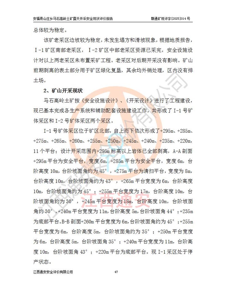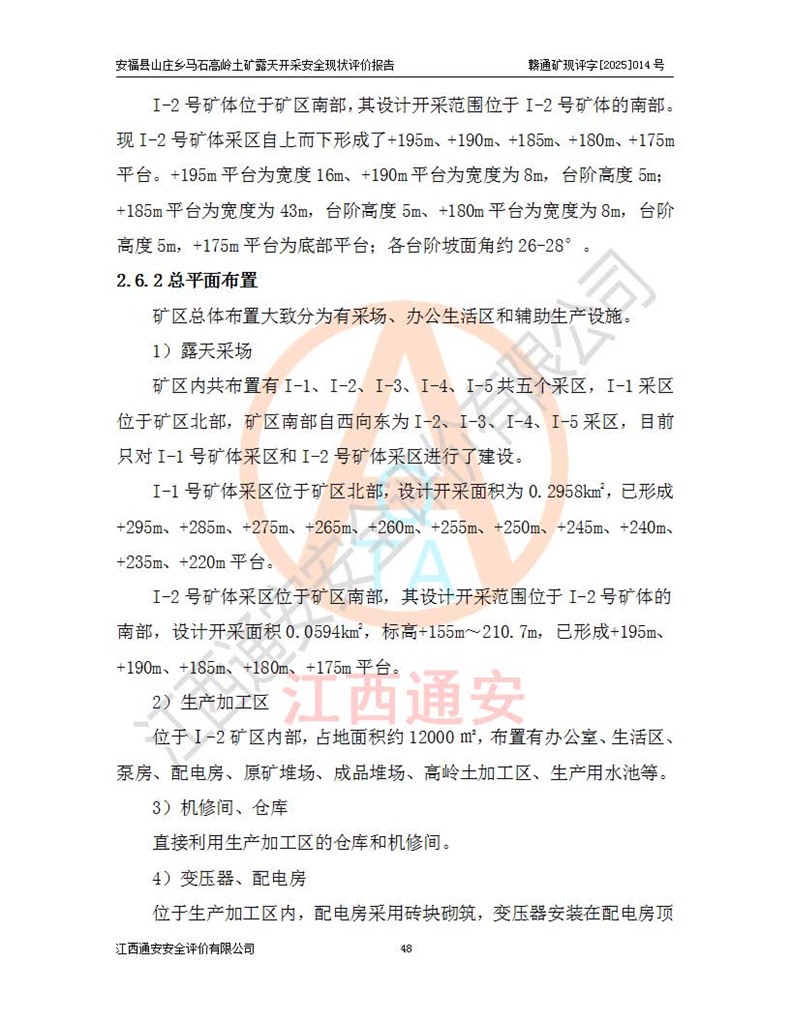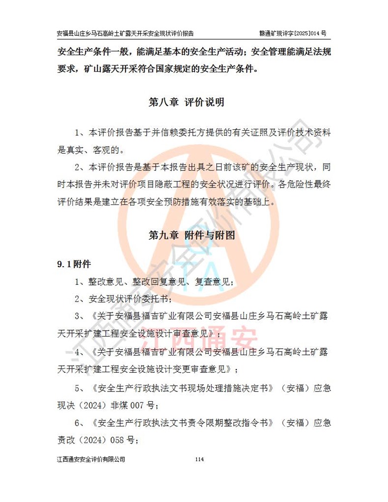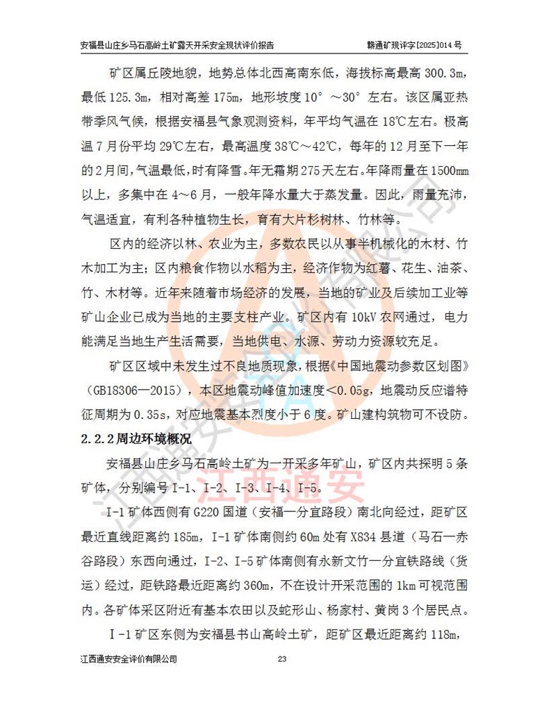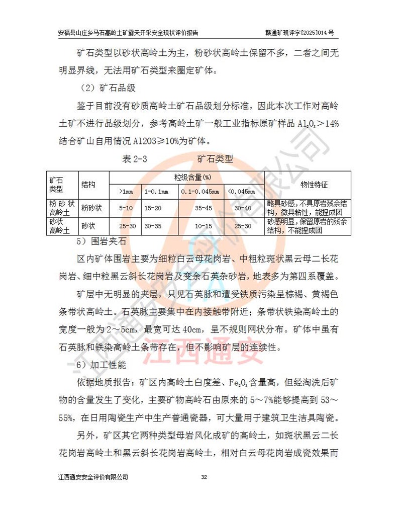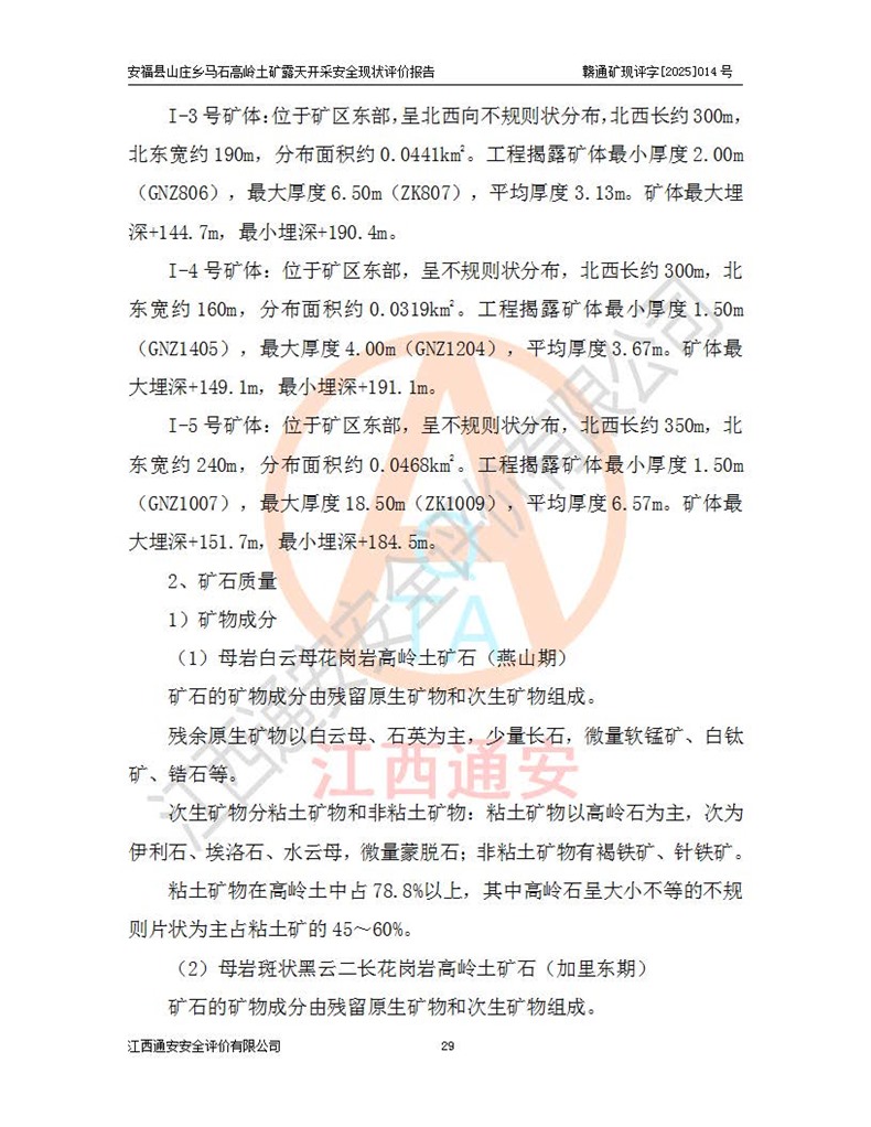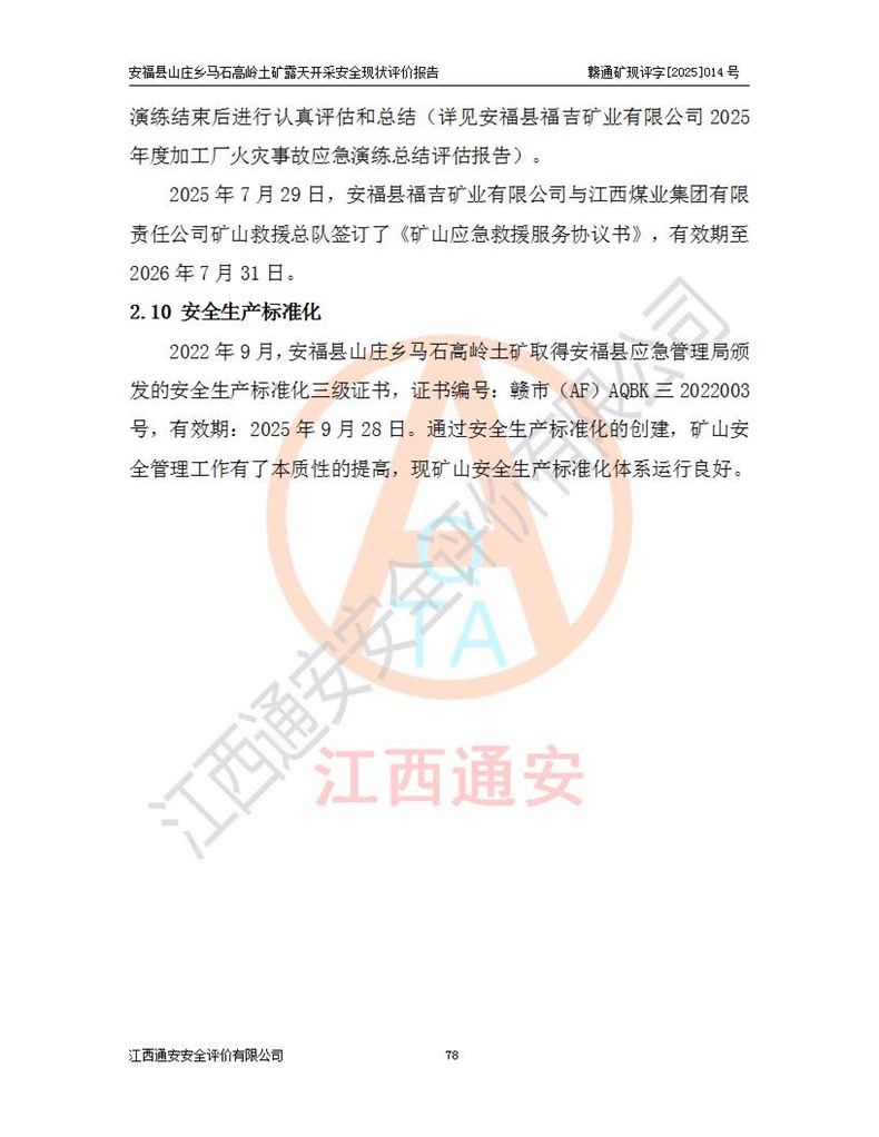 安福县福吉矿业有限公司成立于2008年7月8日,地址位于江西省吉安市安福县山庄乡东头村五组,注册资金:1288.66万元,营业执照统一社会信用代码:9136082969683448X,营业期限:2008年7月8日至长期,企业类型为有限责任公司(自然人独资),法定**人为刘国栋,经营范围:高岭土开采、销售;矿产品(铁矿除外)加工、销售。 安福县山庄乡马石高岭土矿为安福县福吉矿业有限公司下属露天矿山,矿区位于安福县城北北东,直距县城12°方位约15km,行政区划属安福县山庄乡管辖,矿区地理坐标(2000坐标系):东经114°37′12″~114°38′32″,北纬27°30′37″~27°32′05″。矿区中心地理坐标:东经114°37′52″,北纬 27°31′14″。矿区有3km水泥公路通往山庄乡,并与安福-分宜公路相连,距安福县城18km。 马石高岭土矿成立于2008年,生产规模为2万吨/年,矿区面积2.3642平方**,开采深度280m至155m,矿区资源于2018年重新进行了核实,2019年6月由吉安市自然资源局重新核发了采矿许可证,矿区面积由原2.3642平方**调整至1.2016平方**,开采深度由330.3m至155m,生产规模由2万吨/年变更为50万吨/年。 因矿山生产规模扩大,根据《建设项目安全设施“三同时”监督管理办法》安监总局令第36号(77号令修改)的要求,矿山应履行安全设施扩建“三同时”手续,安福县福吉矿业有限公司分别委托内蒙古吉安劳动安全评价有限责任公司和山东乾舜矿冶科技股份有限公司对马石高岭土矿扩建工程进行了安全预评价及安全设施设计。 2021年10月16日安全设施设计通过了安福县应急管理局组织的专家评审,2021年11月18日,安福县应急管理局下发了《关于安福县福吉矿业有限公司安福县山庄乡马石高岭土矿露天开采扩建工程安全设施设计审查意见》安应急字[2021]59号)。 马石高岭土矿于2021年12月开始了基建工程,期间因征地原因,设计开采范围发生了变化,2022年4月,安福县福吉矿业有限公司委托山东乾舜矿冶科技股份有限公司编制了《安福县福吉矿业有限公司安福县山庄乡马石高岭土矿露天开采扩建工程变更设计》,2022年4月24日变更设计通过了安福县应急管理局组织的专家评审,2022年5月18日,安福县应急管理局下发了《关于安福县福吉矿业有限公司安福县山庄乡马石高岭土矿露天开采扩建工程安全设施设计变更审查意见》安应急字[2022]30号)。 2022年8月,安福县山庄乡马石高岭土矿露天开采扩建工程通过验收,2022年9月9日,矿山取得了安福县应急管理局颁发的安全生产许可证,编号:(赣)FM安许证字[2022]DAF02号。**期:2022年9月9日至2025年9月8日。 2024年10月25日,安福县应急管理局现场检查时,发现安福县山庄乡马石高岭土矿存在2条违法违规行为和事故隐患,并存在5条其他问题,安福县应急管理局开具了《安全生产行政执法文书现场处理措施决定书》(安福)应急现决(2024)非煤007号,《安全生产行政执法文书责令限期整改指令书》(安福)应急责改(2024)058号;2024年11月15日,安福县应急管理局开具了《安全生产行政执法文书行政处罚决定书》(安福)应急罚(2024)非煤-4号;并处人民币贰万伍仟元罚款的行政处罚。 随着正常的生产,矿山企业发现矿区Ⅰ-2矿体西部及Ⅰ-2矿体东部的矿体难以达到工业品味的需求,经矿山企业商讨后决定:放弃对Ⅰ-2矿体西部及Ⅰ-2矿体东部的开采,仅开采Ⅰ-2矿体南部,并于2025年3月委托山东乾舜矿冶科技股份有限公司编制了《安福县福吉矿业有限公司安福县山庄乡马石高岭土矿露天开采Ⅰ-2矿体开采设计》。 依照《非煤矿矿山企业安全生产许可证延期换证工作》的通知,根据***《安全生产许可证条例》、《江西省安全生产条例》、《非煤矿山安全生产许可证实施办法》、《江西省非煤矿矿山企业安全生产许可证办法》规定及非煤矿山安全评价导则的要求,受安福县福吉矿业有限公司的委托,我公司承担安福县山庄乡马石高岭土矿露天开采延期换证的安全现状评价工作。  |