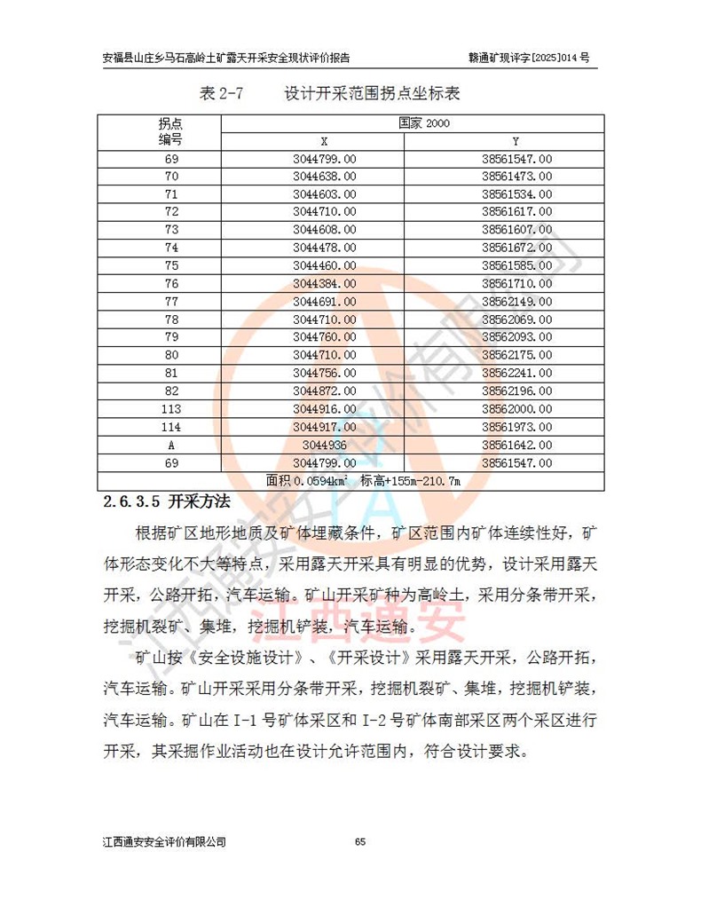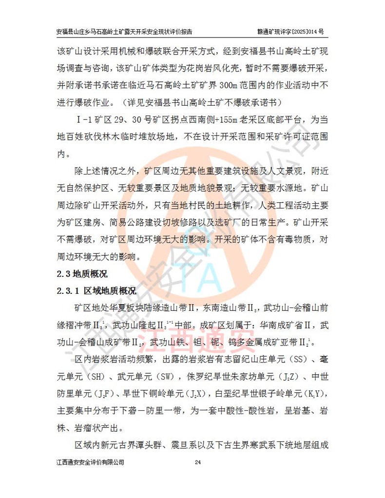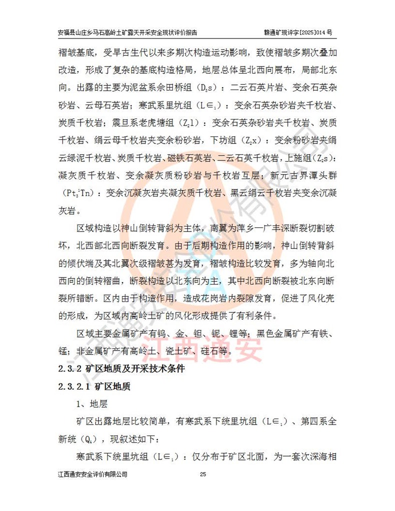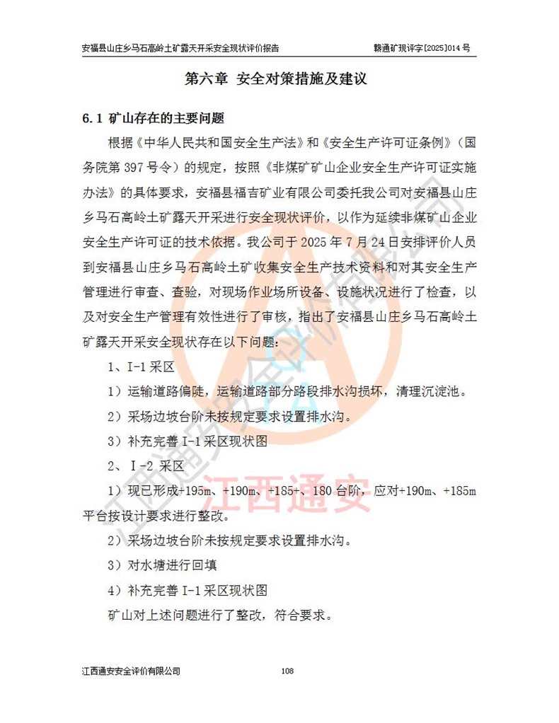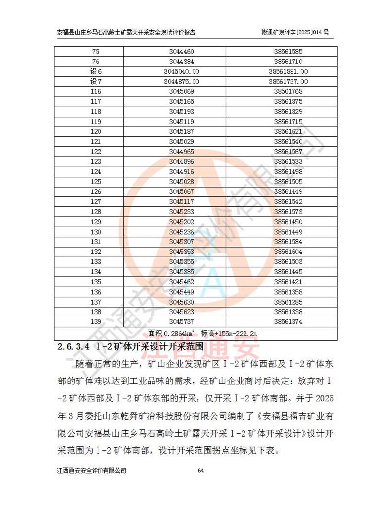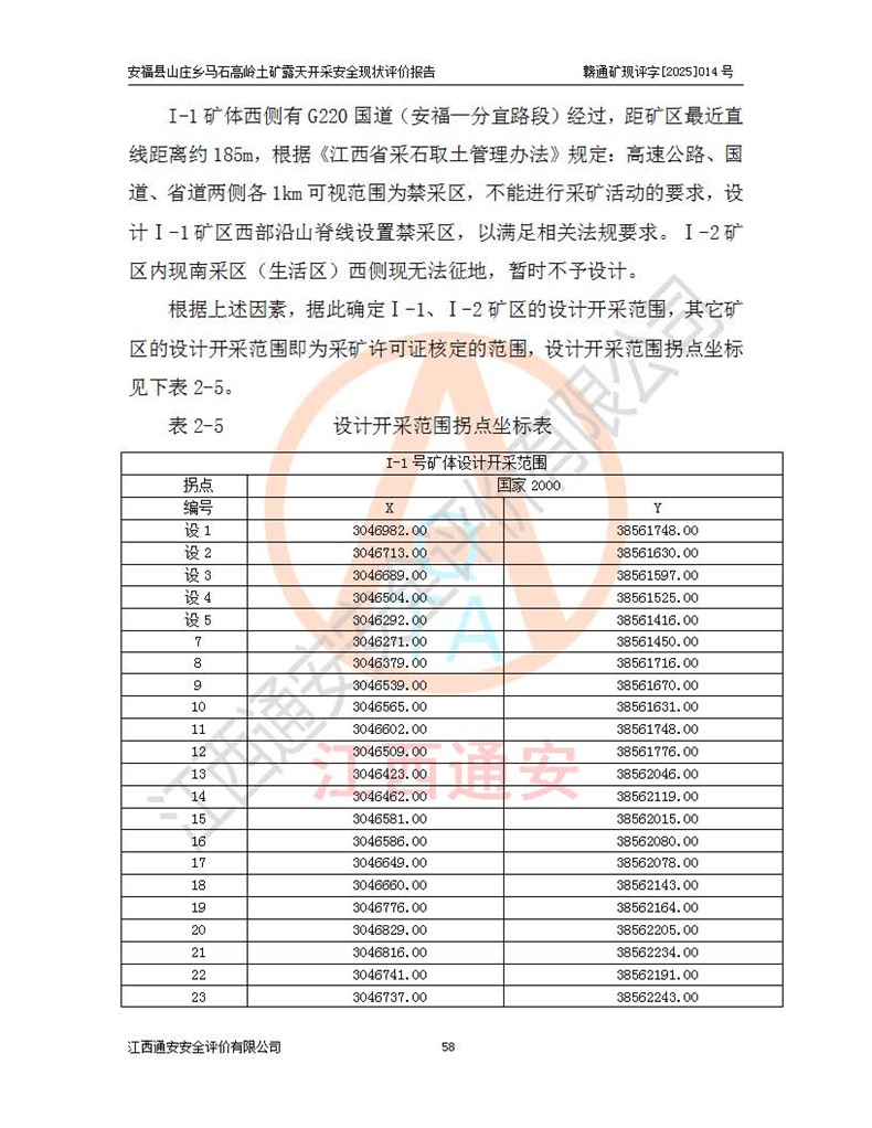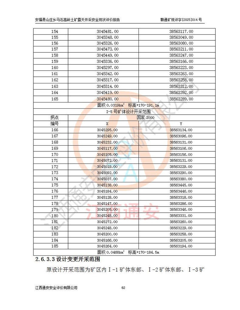安福县福吉矿业有限公司成立于2008年7月8日,地址位于江西省吉安市安福县山庄乡东头村五组,注册资金:1288.66万元,营业执照统一社会信用代码:9136082969683448X,营业期限:2008年7月8日至长期,企业类型为有限责任公司(自然人独资),法定**人为刘国栋,经营范围:高岭土开采、销售;矿产品(铁矿除外)加工、销售。 安福县山庄乡马石高岭土矿为安福县福吉矿业有限公司下属露天矿山,矿区位于安福县城北北东,直距县城12°方位约15km,行政区划属安福县山庄乡管辖,矿区地理坐标(2000坐标系):东经114°37′12″~114°38′32″,北纬27°30′37″~27°32′05″。矿区中心地理坐标:东经114°37′52″,北纬 27°31′14″。矿区有3km水泥公路通往山庄乡,并与安福-分宜公路相连,距安福县城18km。 马石高岭土矿成立于2008年,生产规模为2万吨/年,矿区面积2.3642平方**,开采深度280m至155m,矿区资源于2018年重新进行了核实,2019年6月由吉安市自然资源局重新核发了采矿许可证,矿区面积由原2.3642平方**调整至1.2016平方**,开采深度由330.3m至155m,生产规模由2万吨/年变更为50万吨/年。 因矿山生产规模扩大,根据《建设项目安全设施“三同时”监督管理办法》安监总局令第36号(77号令修改)的要求,矿山应履行安全设施扩建“三同时”手续,安福县福吉矿业有限公司分别委托内蒙古吉安劳动安全评价有限责任公司和山东乾舜矿冶科技股份有限公司对马石高岭土矿扩建工程进行了安全预评价及安全设施设计。 2021年10月16日安全设施设计通过了安福县应急管理局组织的专家评审,2021年11月18日,安福县应急管理局下发了《关于安福县福吉矿业有限公司安福县山庄乡马石高岭土矿露天开采扩建工程安全设施设计审查意见》安应急字[2021]59号)。 马石高岭土矿于2021年12月开始了基建工程,期间因征地原因,设计开采范围发生了变化,2022年4月,安福县福吉矿业有限公司委托山东乾舜矿冶科技股份有限公司编制了《安福县福吉矿业有限公司安福县山庄乡马石高岭土矿露天开采扩建工程变更设计》,2022年4月24日变更设计通过了安福县应急管理局组织的专家评审,2022年5月18日,安福县应急管理局下发了《关于安福县福吉矿业有限公司安福县山庄乡马石高岭土矿露天开采扩建工程安全设施设计变更审查意见》安应急字[2022]30号)。 2022年8月,安福县山庄乡马石高岭土矿露天开采扩建工程通过验收,2022年9月9日,矿山取得了安福县应急管理局颁发的安全生产许可证,编号:(赣)FM安许证字[2022]DAF02号。**期:2022年9月9日至2025年9月8日。 2024年10月25日,安福县应急管理局现场检查时,发现安福县山庄乡马石高岭土矿存在2条违法违规行为和事故隐患,并存在5条其他问题,安福县应急管理局开具了《安全生产行政执法文书现场处理措施决定书》(安福)应急现决(2024)非煤007号,《安全生产行政执法文书责令限期整改指令书》(安福)应急责改(2024)058号;2024年11月15日,安福县应急管理局开具了《安全生产行政执法文书行政处罚决定书》(安福)应急罚(2024)非煤-4号;并处人民币贰万伍仟元罚款的行政处罚。 随着正常的生产,矿山企业发现矿区Ⅰ-2矿体西部及Ⅰ-2矿体东部的矿体难以达到工业品味的需求,经矿山企业商讨后决定:放弃对Ⅰ-2矿体西部及Ⅰ-2矿体东部的开采,仅开采Ⅰ-2矿体南部,并于2025年3月委托山东乾舜矿冶科技股份有限公司编制了《安福县福吉矿业有限公司安福县山庄乡马石高岭土矿露天开采Ⅰ-2矿体开采设计》。 依照《非煤矿矿山企业安全生产许可证延期换证工作》的通知,根据***《安全生产许可证条例》、《江西省安全生产条例》、《非煤矿山安全生产许可证实施办法》、《江西省非煤矿矿山企业安全生产许可证办法》规定及非煤矿山安全评价导则的要求,受安福县福吉矿业有限公司的委托,我公司承担安福县山庄乡马石高岭土矿露天开采延期换证的安全现状评价工作。  |