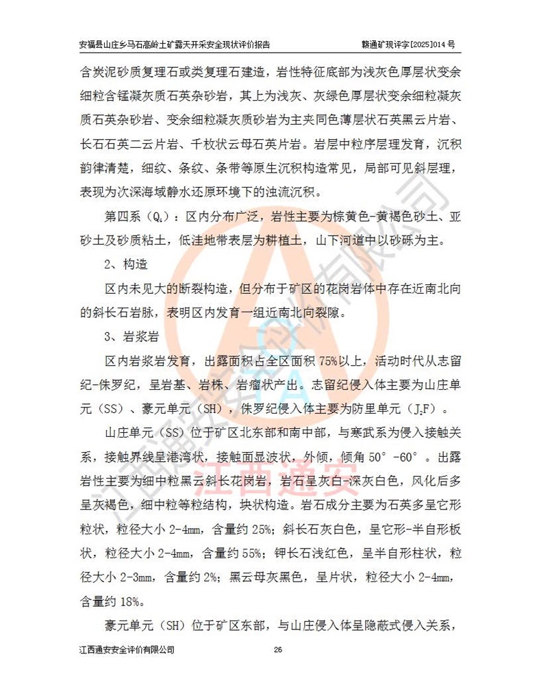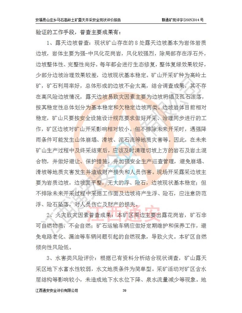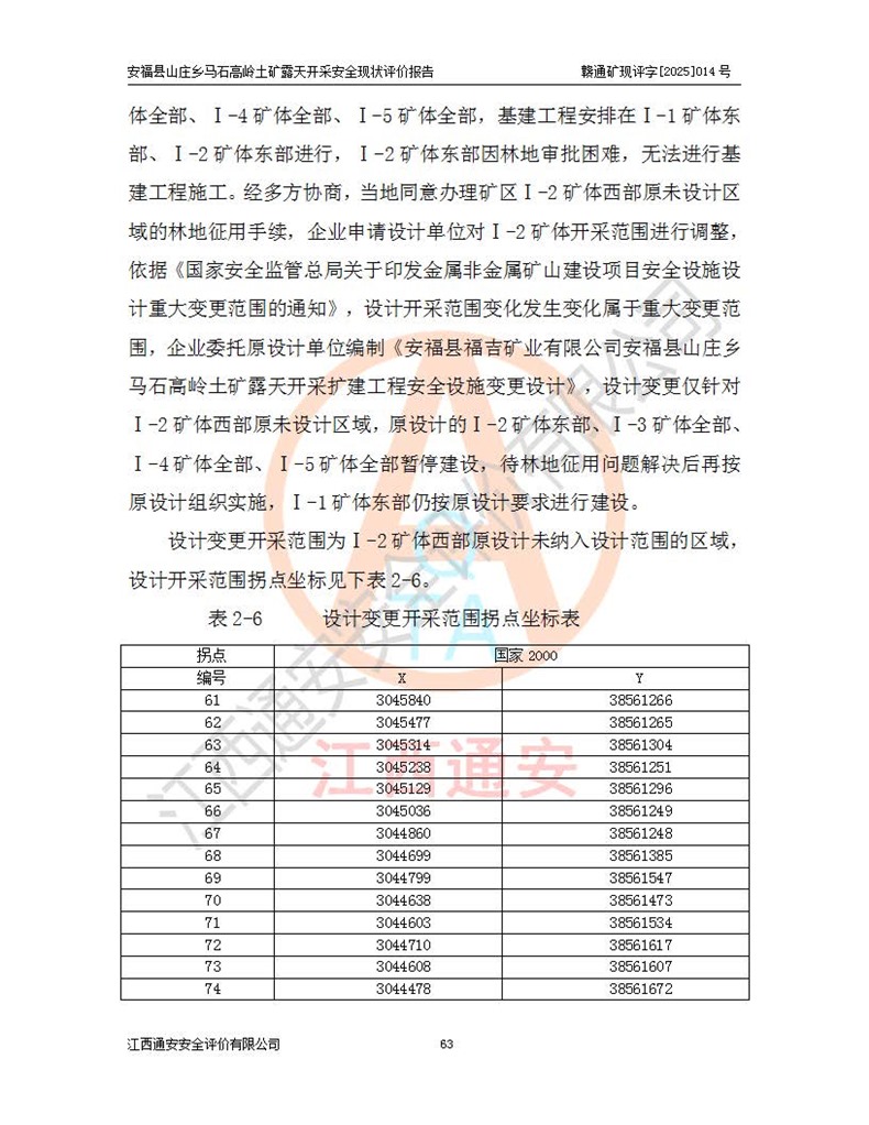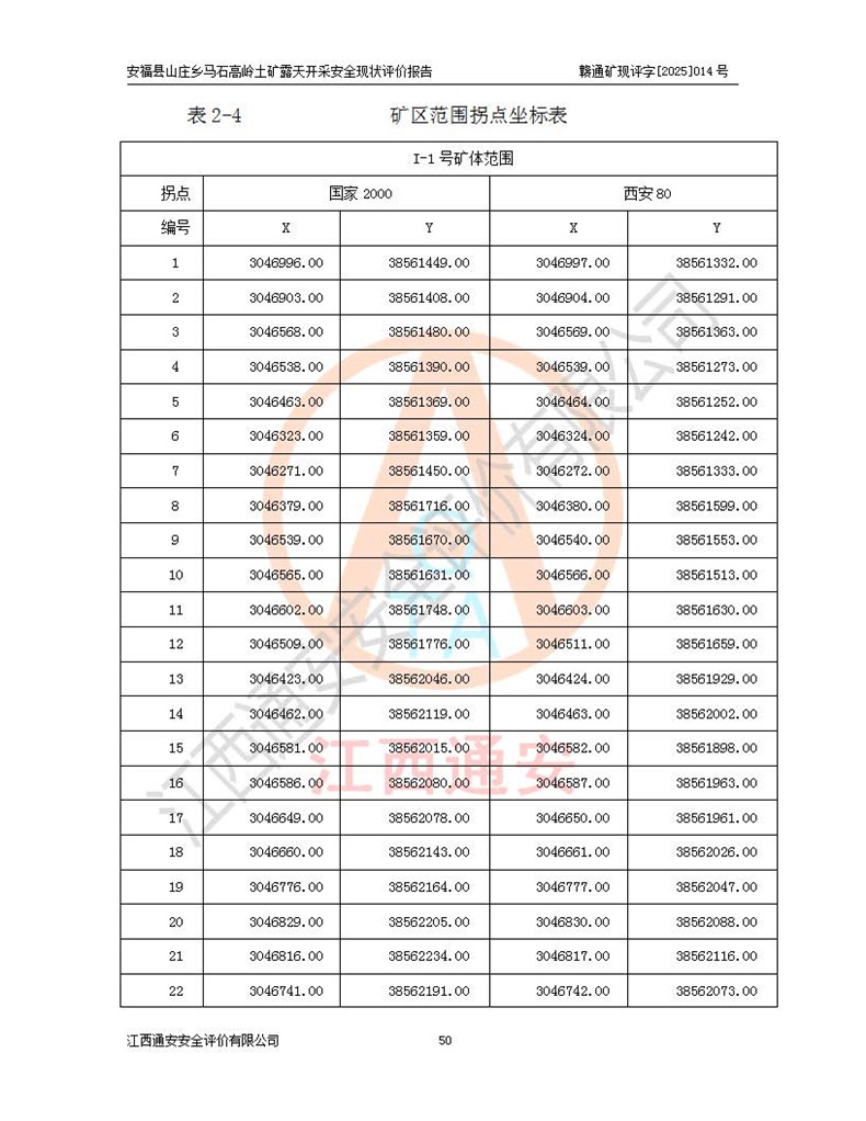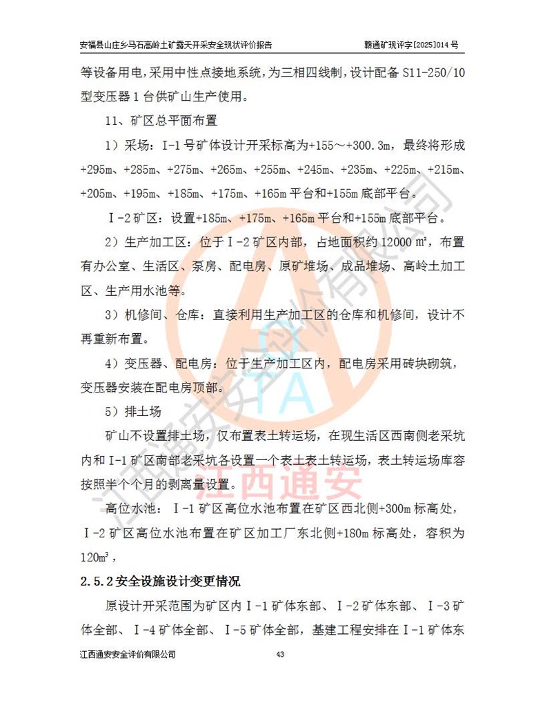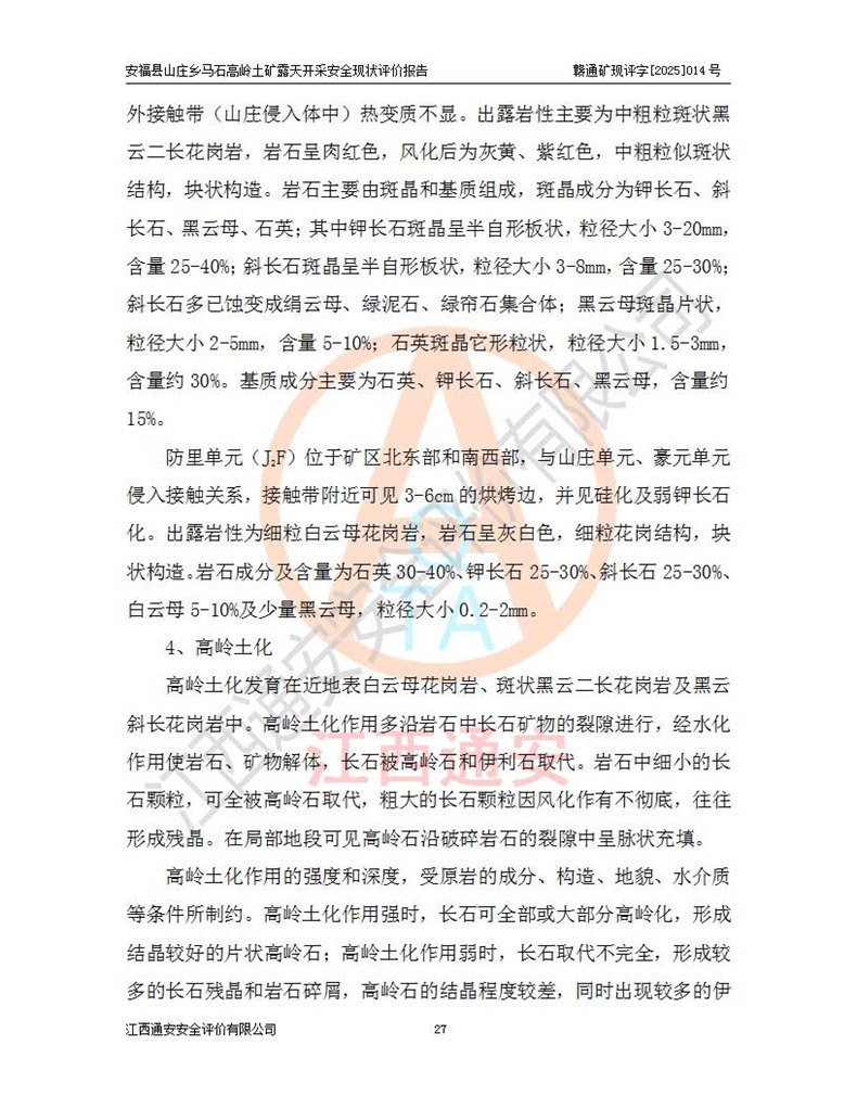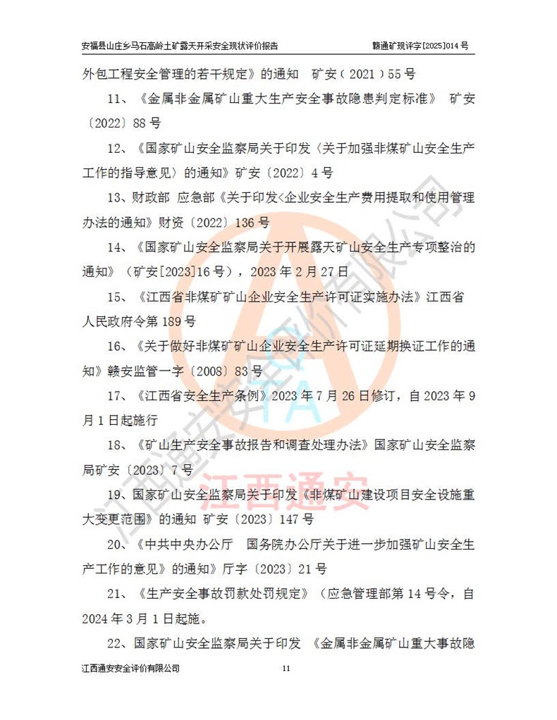 安福县福吉矿业有限公司成立于2008年7月8日,地址位于江西省吉安市安福县山庄乡东头村五组,注册资金:1288.66万元,营业执照统一社会信用代码:9136082969683448X,营业期限:2008年7月8日至长期,企业类型为有限责任公司(自然人独资),法定**人为刘国栋,经营范围:高岭土开采、销售;矿产品(铁矿除外)加工、销售。 安福县山庄乡马石高岭土矿为安福县福吉矿业有限公司下属露天矿山,矿区位于安福县城北北东,直距县城12°方位约15km,行政区划属安福县山庄乡管辖,矿区地理坐标(2000坐标系):东经114°37′12″~114°38′32″,北纬27°30′37″~27°32′05″。矿区中心地理坐标:东经114°37′52″,北纬 27°31′14″。矿区有3km水泥公路通往山庄乡,并与安福-分宜公路相连,距安福县城18km。 马石高岭土矿成立于2008年,生产规模为2万吨/年,矿区面积2.3642平方**,开采深度280m至155m,矿区资源于2018年重新进行了核实,2019年6月由吉安市自然资源局重新核发了采矿许可证,矿区面积由原2.3642平方**调整至1.2016平方**,开采深度由330.3m至155m,生产规模由2万吨/年变更为50万吨/年。 因矿山生产规模扩大,根据《建设项目安全设施“三同时”监督管理办法》安监总局令第36号(77号令修改)的要求,矿山应履行安全设施扩建“三同时”手续,安福县福吉矿业有限公司分别委托内蒙古吉安劳动安全评价有限责任公司和山东乾舜矿冶科技股份有限公司对马石高岭土矿扩建工程进行了安全预评价及安全设施设计。 2021年10月16日安全设施设计通过了安福县应急管理局组织的专家评审,2021年11月18日,安福县应急管理局下发了《关于安福县福吉矿业有限公司安福县山庄乡马石高岭土矿露天开采扩建工程安全设施设计审查意见》安应急字[2021]59号)。 马石高岭土矿于2021年12月开始了基建工程,期间因征地原因,设计开采范围发生了变化,2022年4月,安福县福吉矿业有限公司委托山东乾舜矿冶科技股份有限公司编制了《安福县福吉矿业有限公司安福县山庄乡马石高岭土矿露天开采扩建工程变更设计》,2022年4月24日变更设计通过了安福县应急管理局组织的专家评审,2022年5月18日,安福县应急管理局下发了《关于安福县福吉矿业有限公司安福县山庄乡马石高岭土矿露天开采扩建工程安全设施设计变更审查意见》安应急字[2022]30号)。 2022年8月,安福县山庄乡马石高岭土矿露天开采扩建工程通过验收,2022年9月9日,矿山取得了安福县应急管理局颁发的安全生产许可证,编号:(赣)FM安许证字[2022]DAF02号。**期:2022年9月9日至2025年9月8日。 2024年10月25日,安福县应急管理局现场检查时,发现安福县山庄乡马石高岭土矿存在2条违法违规行为和事故隐患,并存在5条其他问题,安福县应急管理局开具了《安全生产行政执法文书现场处理措施决定书》(安福)应急现决(2024)非煤007号,《安全生产行政执法文书责令限期整改指令书》(安福)应急责改(2024)058号;2024年11月15日,安福县应急管理局开具了《安全生产行政执法文书行政处罚决定书》(安福)应急罚(2024)非煤-4号;并处人民币贰万伍仟元罚款的行政处罚。 随着正常的生产,矿山企业发现矿区Ⅰ-2矿体西部及Ⅰ-2矿体东部的矿体难以达到工业品味的需求,经矿山企业商讨后决定:放弃对Ⅰ-2矿体西部及Ⅰ-2矿体东部的开采,仅开采Ⅰ-2矿体南部,并于2025年3月委托山东乾舜矿冶科技股份有限公司编制了《安福县福吉矿业有限公司安福县山庄乡马石高岭土矿露天开采Ⅰ-2矿体开采设计》。 依照《非煤矿矿山企业安全生产许可证延期换证工作》的通知,根据***《安全生产许可证条例》、《江西省安全生产条例》、《非煤矿山安全生产许可证实施办法》、《江西省非煤矿矿山企业安全生产许可证办法》规定及非煤矿山安全评价导则的要求,受安福县福吉矿业有限公司的委托,我公司承担安福县山庄乡马石高岭土矿露天开采延期换证的安全现状评价工作。  |