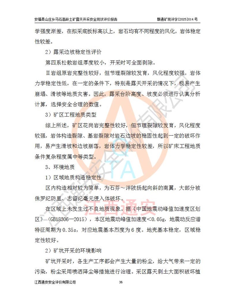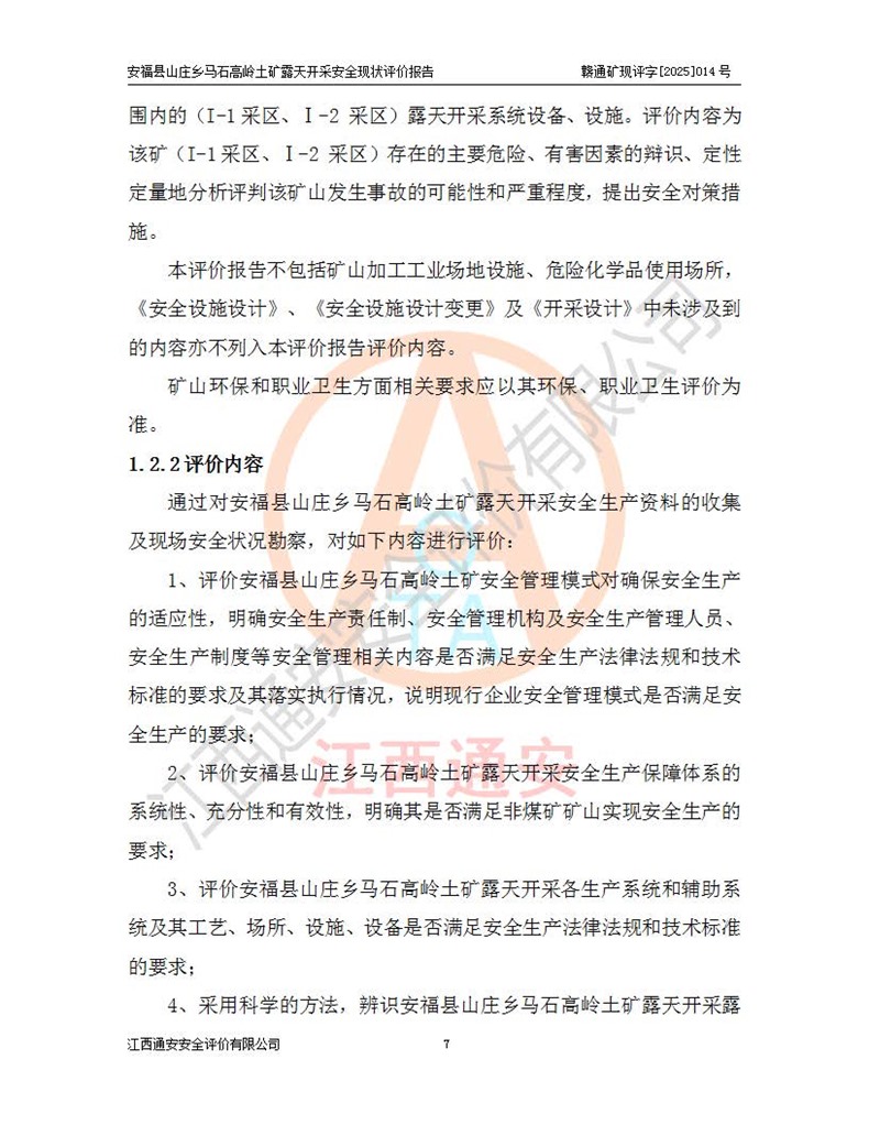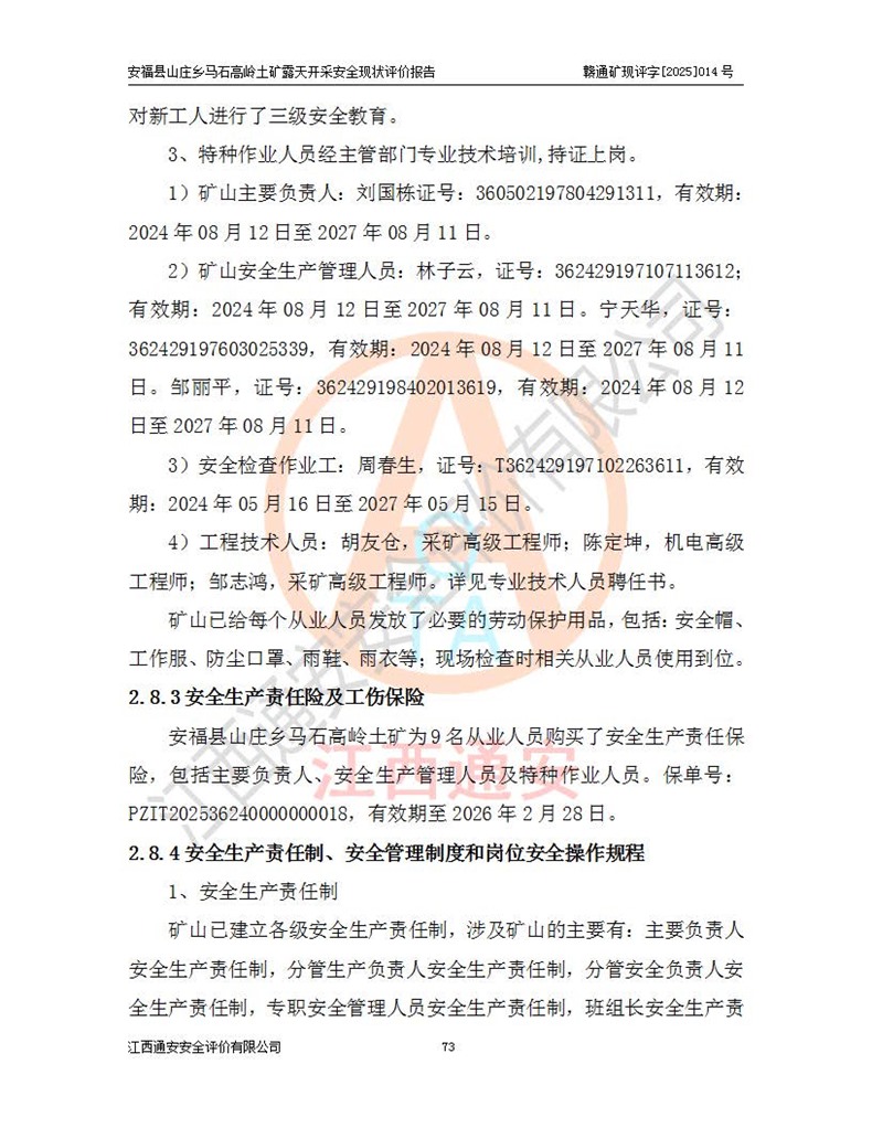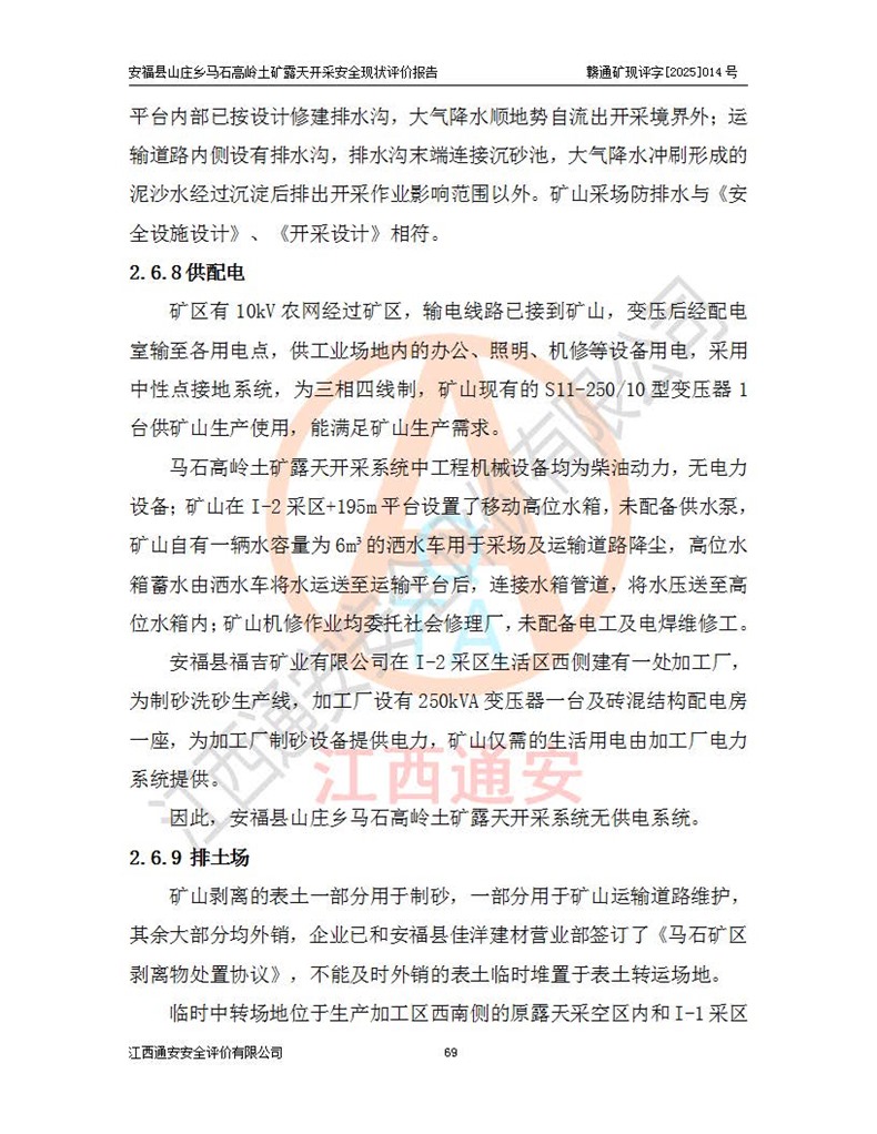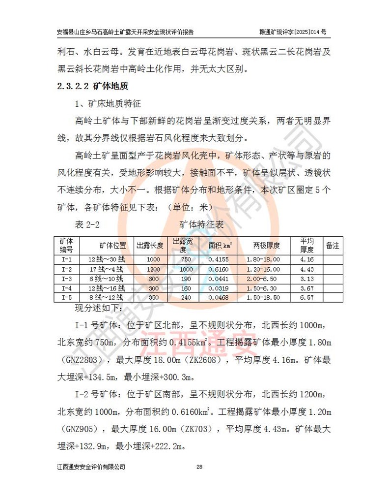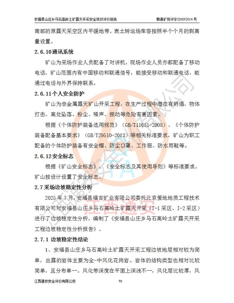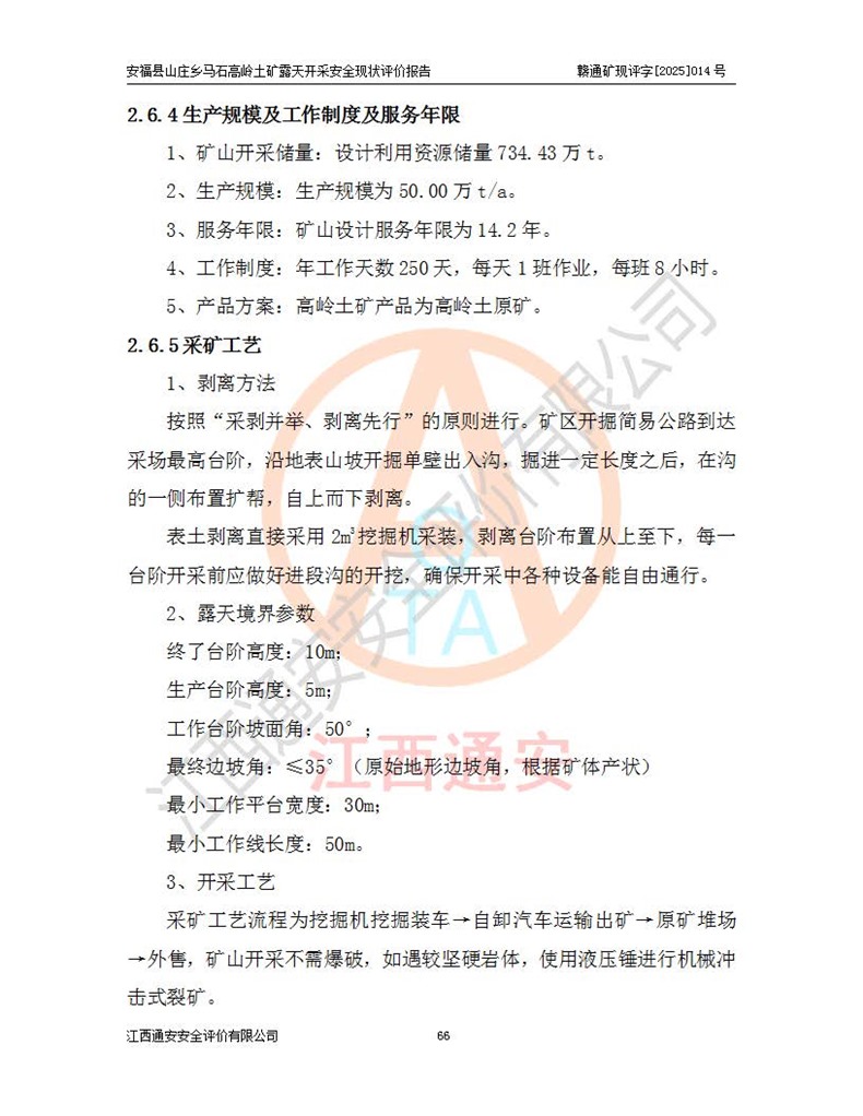 安福县福吉矿业有限公司成立于2008年7月8日,地址位于江西省吉安市安福县山庄乡东头村五组,注册资金:1288.66万元,营业执照统一社会信用代码:9136082969683448X,营业期限:2008年7月8日至长期,企业类型为有限责任公司(自然人独资),法定**人为刘国栋,经营范围:高岭土开采、销售;矿产品(铁矿除外)加工、销售。 安福县山庄乡马石高岭土矿为安福县福吉矿业有限公司下属露天矿山,矿区位于安福县城北北东,直距县城12°方位约15km,行政区划属安福县山庄乡管辖,矿区地理坐标(2000坐标系):东经114°37′12″~114°38′32″,北纬27°30′37″~27°32′05″。矿区中心地理坐标:东经114°37′52″,北纬 27°31′14″。矿区有3km水泥公路通往山庄乡,并与安福-分宜公路相连,距安福县城18km。 马石高岭土矿成立于2008年,生产规模为2万吨/年,矿区面积2.3642平方**,开采深度280m至155m,矿区资源于2018年重新进行了核实,2019年6月由吉安市自然资源局重新核发了采矿许可证,矿区面积由原2.3642平方**调整至1.2016平方**,开采深度由330.3m至155m,生产规模由2万吨/年变更为50万吨/年。 因矿山生产规模扩大,根据《建设项目安全设施“三同时”监督管理办法》安监总局令第36号(77号令修改)的要求,矿山应履行安全设施扩建“三同时”手续,安福县福吉矿业有限公司分别委托内蒙古吉安劳动安全评价有限责任公司和山东乾舜矿冶科技股份有限公司对马石高岭土矿扩建工程进行了安全预评价及安全设施设计。 2021年10月16日安全设施设计通过了安福县应急管理局组织的专家评审,2021年11月18日,安福县应急管理局下发了《关于安福县福吉矿业有限公司安福县山庄乡马石高岭土矿露天开采扩建工程安全设施设计审查意见》安应急字[2021]59号)。 马石高岭土矿于2021年12月开始了基建工程,期间因征地原因,设计开采范围发生了变化,2022年4月,安福县福吉矿业有限公司委托山东乾舜矿冶科技股份有限公司编制了《安福县福吉矿业有限公司安福县山庄乡马石高岭土矿露天开采扩建工程变更设计》,2022年4月24日变更设计通过了安福县应急管理局组织的专家评审,2022年5月18日,安福县应急管理局下发了《关于安福县福吉矿业有限公司安福县山庄乡马石高岭土矿露天开采扩建工程安全设施设计变更审查意见》安应急字[2022]30号)。 2022年8月,安福县山庄乡马石高岭土矿露天开采扩建工程通过验收,2022年9月9日,矿山取得了安福县应急管理局颁发的安全生产许可证,编号:(赣)FM安许证字[2022]DAF02号。**期:2022年9月9日至2025年9月8日。 2024年10月25日,安福县应急管理局现场检查时,发现安福县山庄乡马石高岭土矿存在2条违法违规行为和事故隐患,并存在5条其他问题,安福县应急管理局开具了《安全生产行政执法文书现场处理措施决定书》(安福)应急现决(2024)非煤007号,《安全生产行政执法文书责令限期整改指令书》(安福)应急责改(2024)058号;2024年11月15日,安福县应急管理局开具了《安全生产行政执法文书行政处罚决定书》(安福)应急罚(2024)非煤-4号;并处人民币贰万伍仟元罚款的行政处罚。 随着正常的生产,矿山企业发现矿区Ⅰ-2矿体西部及Ⅰ-2矿体东部的矿体难以达到工业品味的需求,经矿山企业商讨后决定:放弃对Ⅰ-2矿体西部及Ⅰ-2矿体东部的开采,仅开采Ⅰ-2矿体南部,并于2025年3月委托山东乾舜矿冶科技股份有限公司编制了《安福县福吉矿业有限公司安福县山庄乡马石高岭土矿露天开采Ⅰ-2矿体开采设计》。 依照《非煤矿矿山企业安全生产许可证延期换证工作》的通知,根据***《安全生产许可证条例》、《江西省安全生产条例》、《非煤矿山安全生产许可证实施办法》、《江西省非煤矿矿山企业安全生产许可证办法》规定及非煤矿山安全评价导则的要求,受安福县福吉矿业有限公司的委托,我公司承担安福县山庄乡马石高岭土矿露天开采延期换证的安全现状评价工作。  |