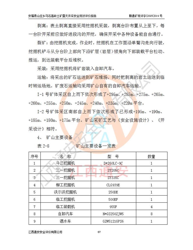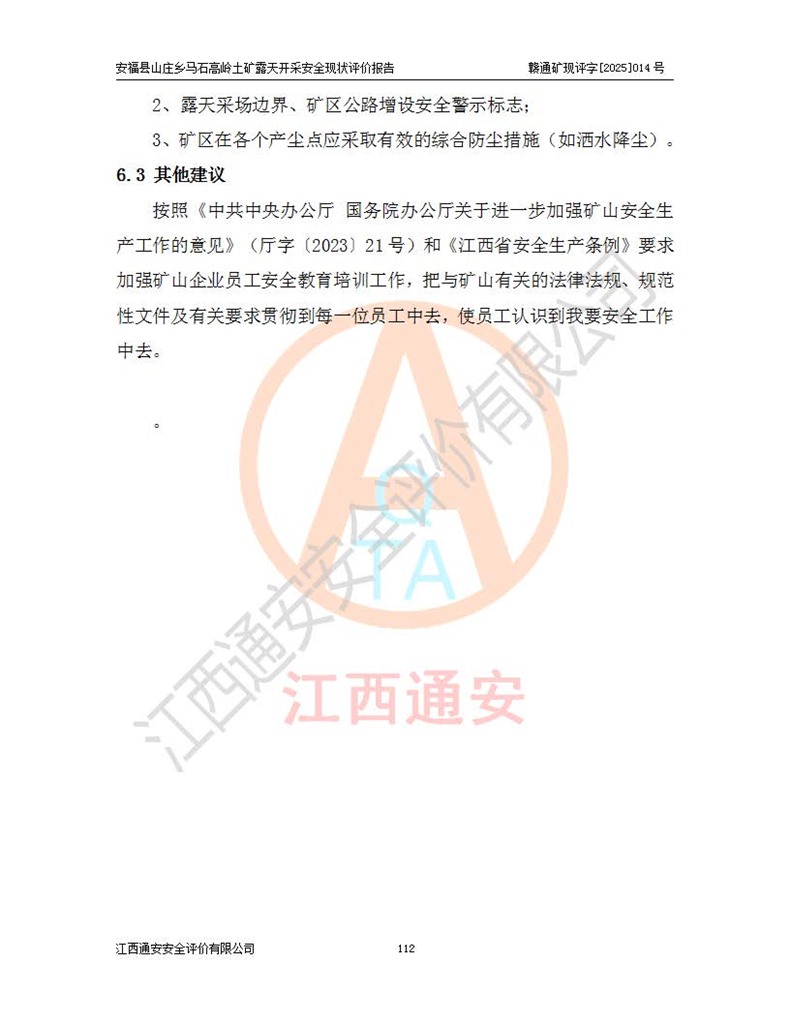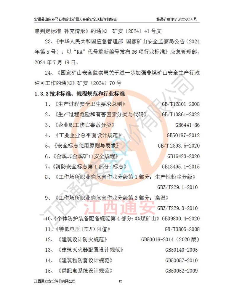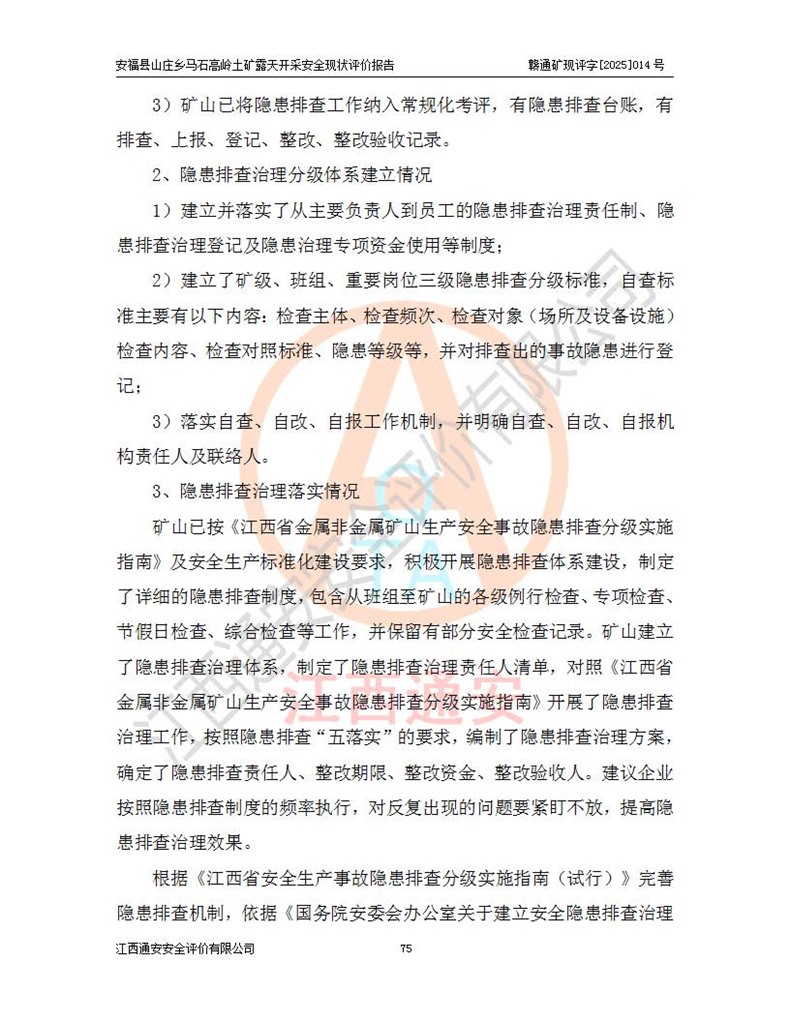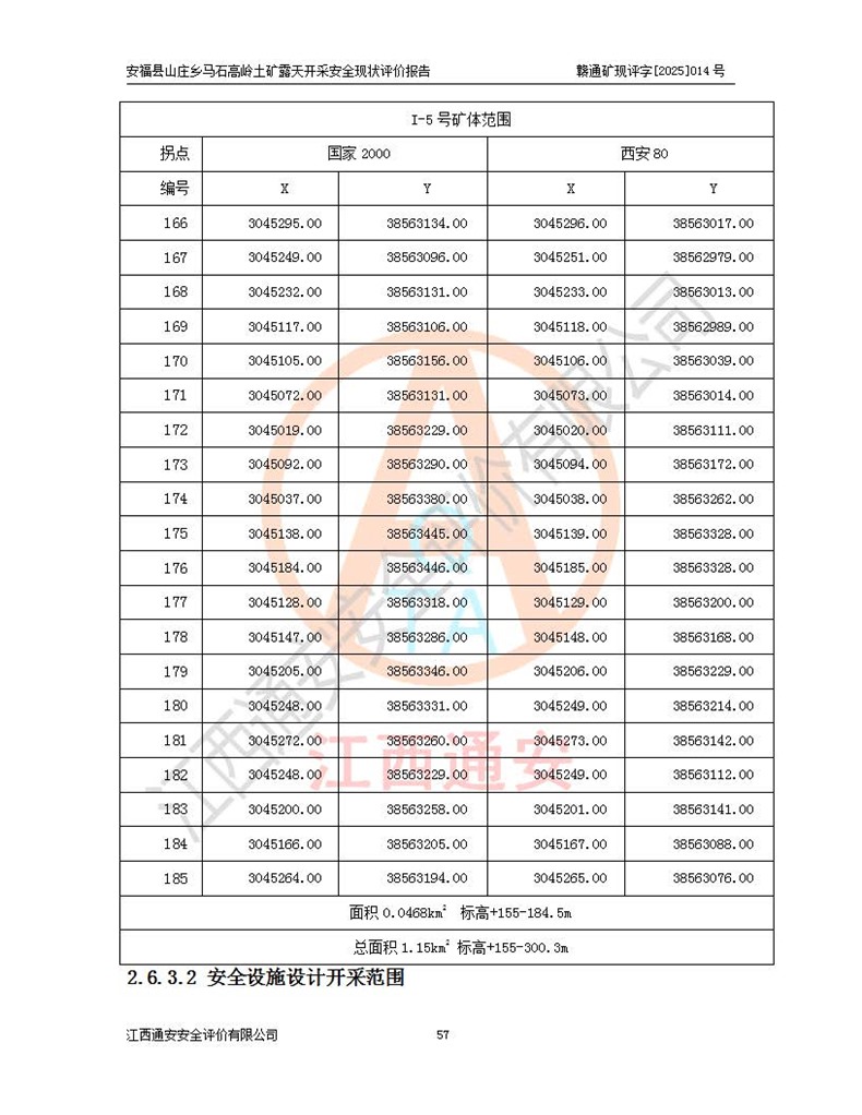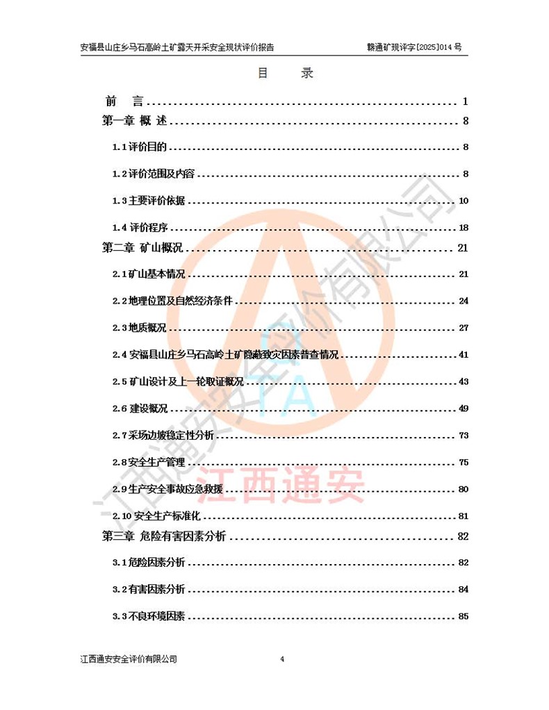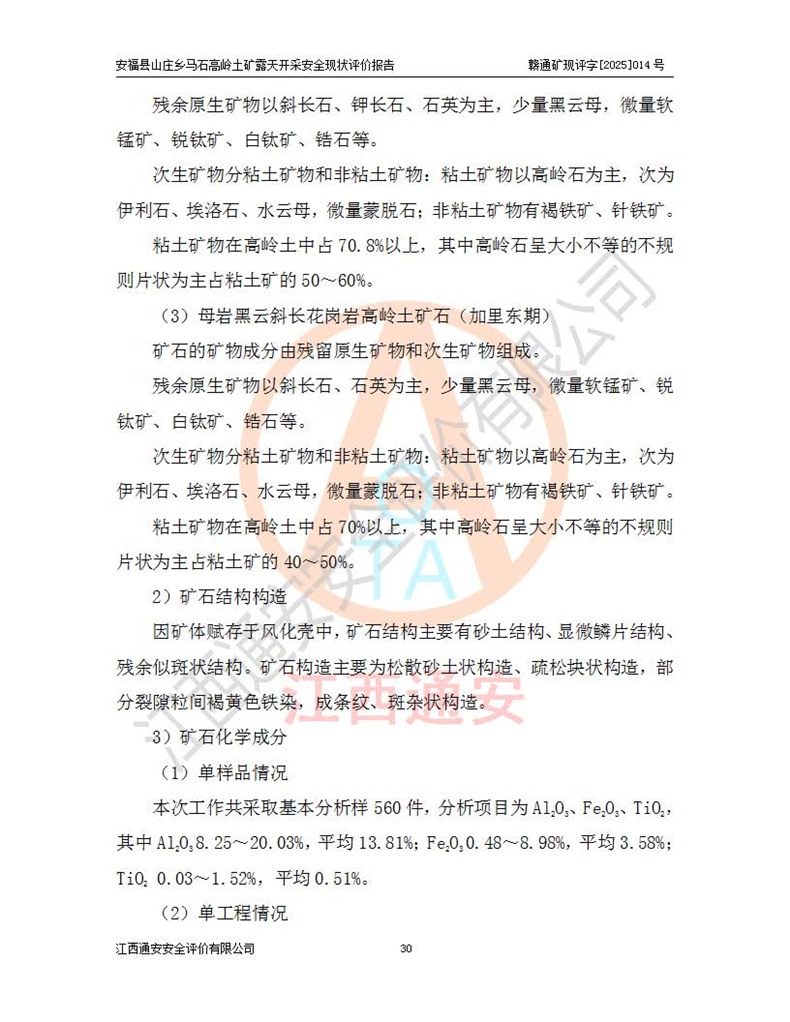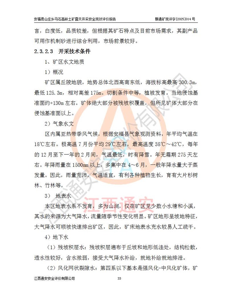 安福县福吉矿业有限公司成立于2008年7月8日,地址位于江西省吉安市安福县山庄乡东头村五组,注册资金:1288.66万元,营业执照统一社会信用代码:9136082969683448X,营业期限:2008年7月8日至长期,企业类型为有限责任公司(自然人独资),法定**人为刘国栋,经营范围:高岭土开采、销售;矿产品(铁矿除外)加工、销售。 安福县山庄乡马石高岭土矿为安福县福吉矿业有限公司下属露天矿山,矿区位于安福县城北北东,直距县城12°方位约15km,行政区划属安福县山庄乡管辖,矿区地理坐标(2000坐标系):东经114°37′12″~114°38′32″,北纬27°30′37″~27°32′05″。矿区中心地理坐标:东经114°37′52″,北纬 27°31′14″。矿区有3km水泥公路通往山庄乡,并与安福-分宜公路相连,距安福县城18km。 马石高岭土矿成立于2008年,生产规模为2万吨/年,矿区面积2.3642平方**,开采深度280m至155m,矿区资源于2018年重新进行了核实,2019年6月由吉安市自然资源局重新核发了采矿许可证,矿区面积由原2.3642平方**调整至1.2016平方**,开采深度由330.3m至155m,生产规模由2万吨/年变更为50万吨/年。 因矿山生产规模扩大,根据《建设项目安全设施“三同时”监督管理办法》安监总局令第36号(77号令修改)的要求,矿山应履行安全设施扩建“三同时”手续,安福县福吉矿业有限公司分别委托内蒙古吉安劳动安全评价有限责任公司和山东乾舜矿冶科技股份有限公司对马石高岭土矿扩建工程进行了安全预评价及安全设施设计。 2021年10月16日安全设施设计通过了安福县应急管理局组织的专家评审,2021年11月18日,安福县应急管理局下发了《关于安福县福吉矿业有限公司安福县山庄乡马石高岭土矿露天开采扩建工程安全设施设计审查意见》安应急字[2021]59号)。 马石高岭土矿于2021年12月开始了基建工程,期间因征地原因,设计开采范围发生了变化,2022年4月,安福县福吉矿业有限公司委托山东乾舜矿冶科技股份有限公司编制了《安福县福吉矿业有限公司安福县山庄乡马石高岭土矿露天开采扩建工程变更设计》,2022年4月24日变更设计通过了安福县应急管理局组织的专家评审,2022年5月18日,安福县应急管理局下发了《关于安福县福吉矿业有限公司安福县山庄乡马石高岭土矿露天开采扩建工程安全设施设计变更审查意见》安应急字[2022]30号)。 2022年8月,安福县山庄乡马石高岭土矿露天开采扩建工程通过验收,2022年9月9日,矿山取得了安福县应急管理局颁发的安全生产许可证,编号:(赣)FM安许证字[2022]DAF02号。**期:2022年9月9日至2025年9月8日。 2024年10月25日,安福县应急管理局现场检查时,发现安福县山庄乡马石高岭土矿存在2条违法违规行为和事故隐患,并存在5条其他问题,安福县应急管理局开具了《安全生产行政执法文书现场处理措施决定书》(安福)应急现决(2024)非煤007号,《安全生产行政执法文书责令限期整改指令书》(安福)应急责改(2024)058号;2024年11月15日,安福县应急管理局开具了《安全生产行政执法文书行政处罚决定书》(安福)应急罚(2024)非煤-4号;并处人民币贰万伍仟元罚款的行政处罚。 随着正常的生产,矿山企业发现矿区Ⅰ-2矿体西部及Ⅰ-2矿体东部的矿体难以达到工业品味的需求,经矿山企业商讨后决定:放弃对Ⅰ-2矿体西部及Ⅰ-2矿体东部的开采,仅开采Ⅰ-2矿体南部,并于2025年3月委托山东乾舜矿冶科技股份有限公司编制了《安福县福吉矿业有限公司安福县山庄乡马石高岭土矿露天开采Ⅰ-2矿体开采设计》。 依照《非煤矿矿山企业安全生产许可证延期换证工作》的通知,根据***《安全生产许可证条例》、《江西省安全生产条例》、《非煤矿山安全生产许可证实施办法》、《江西省非煤矿矿山企业安全生产许可证办法》规定及非煤矿山安全评价导则的要求,受安福县福吉矿业有限公司的委托,我公司承担安福县山庄乡马石高岭土矿露天开采延期换证的安全现状评价工作。  |