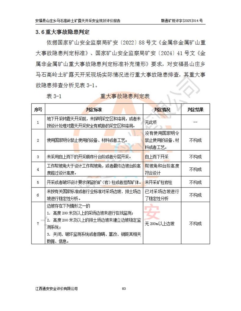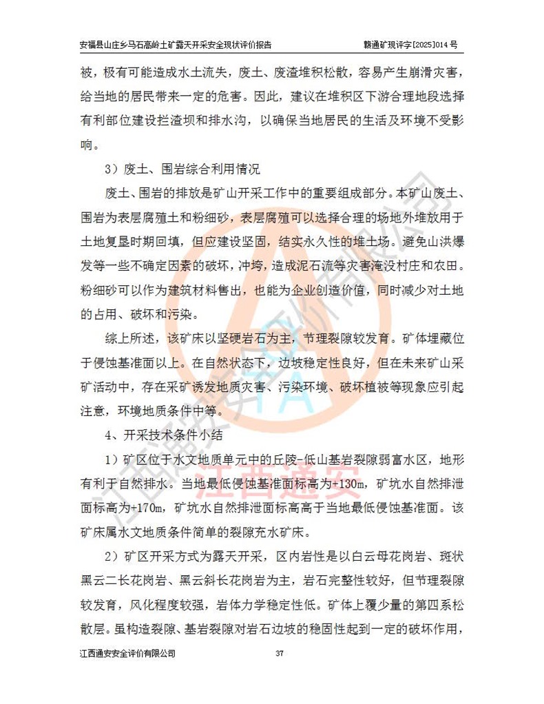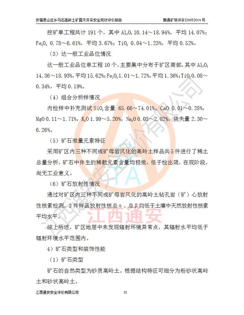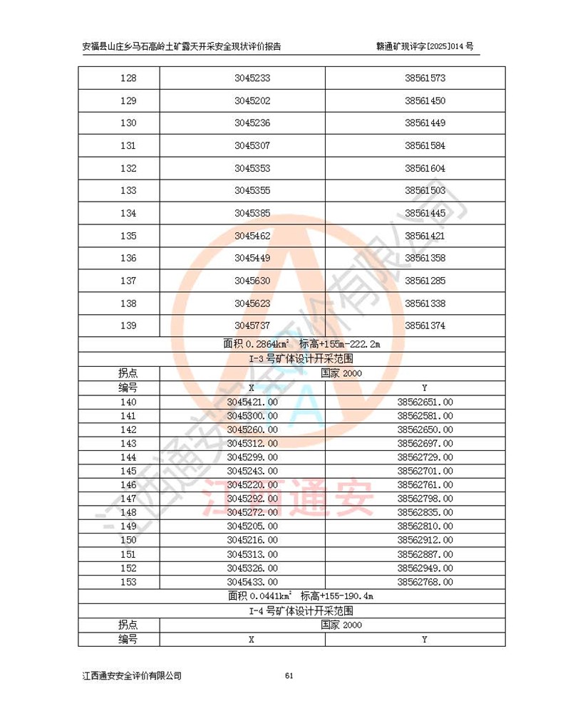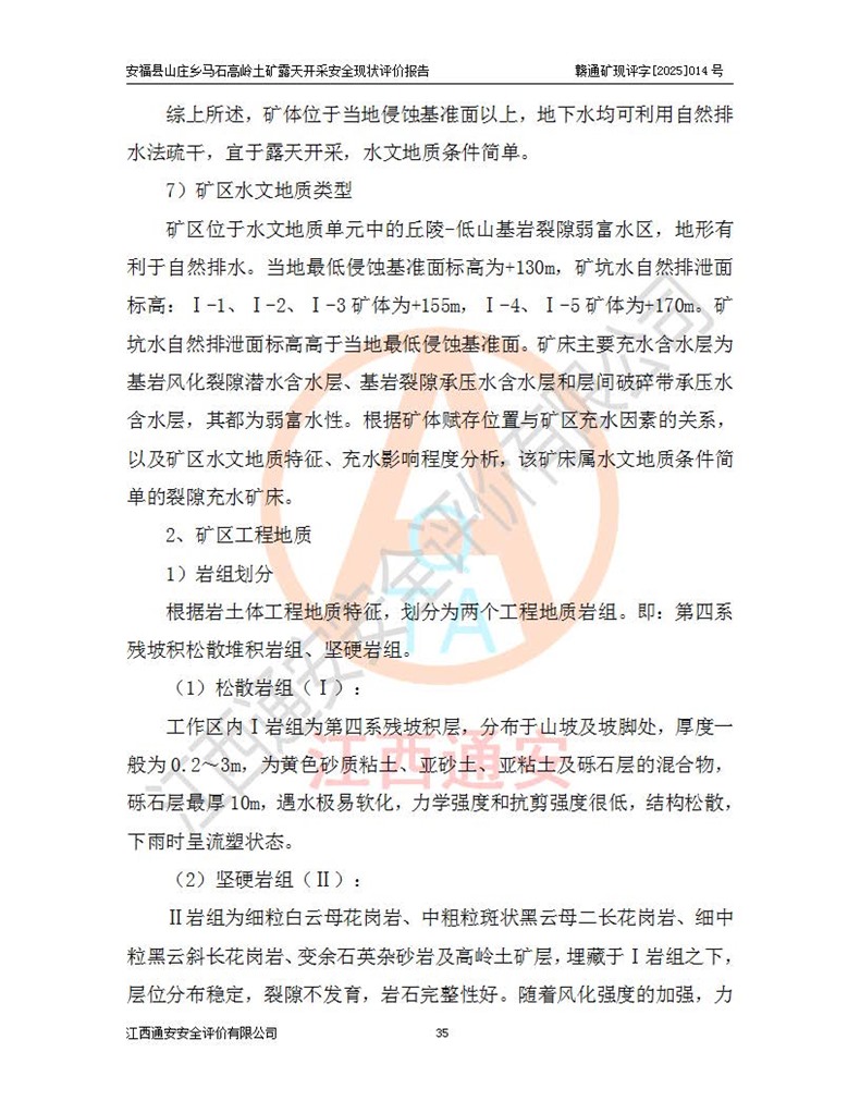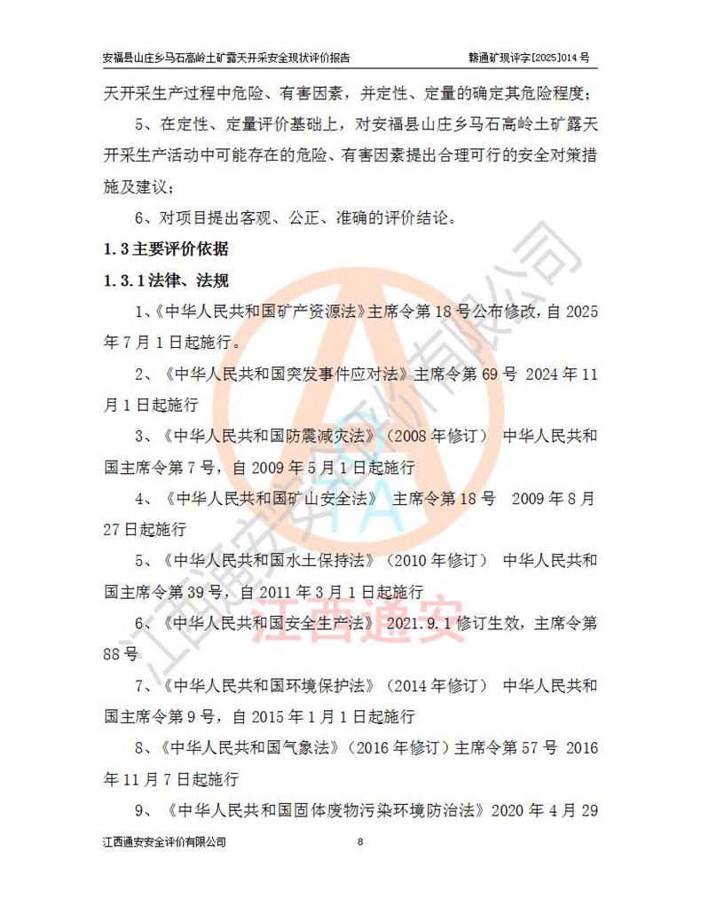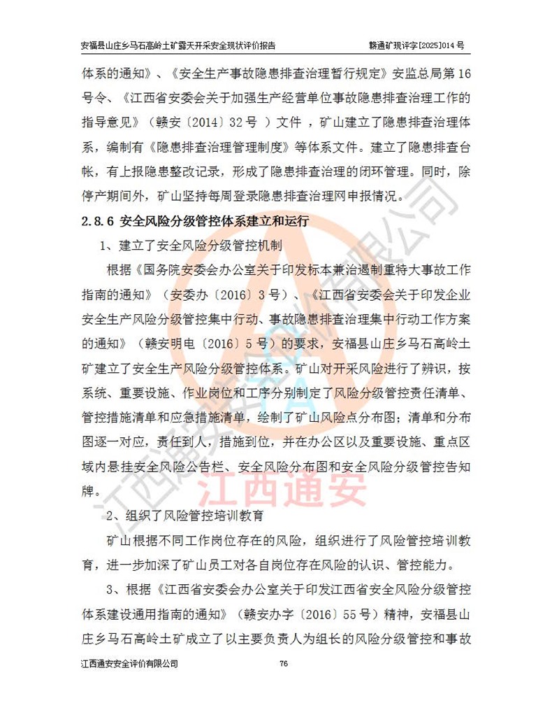 安福县福吉矿业有限公司成立于2008年7月8日,地址位于江西省吉安市安福县山庄乡东头村五组,注册资金:1288.66万元,营业执照统一社会信用代码:9136082969683448X,营业期限:2008年7月8日至长期,企业类型为有限责任公司(自然人独资),法定**人为刘国栋,经营范围:高岭土开采、销售;矿产品(铁矿除外)加工、销售。 安福县山庄乡马石高岭土矿为安福县福吉矿业有限公司下属露天矿山,矿区位于安福县城北北东,直距县城12°方位约15km,行政区划属安福县山庄乡管辖,矿区地理坐标(2000坐标系):东经114°37′12″~114°38′32″,北纬27°30′37″~27°32′05″。矿区中心地理坐标:东经114°37′52″,北纬 27°31′14″。矿区有3km水泥公路通往山庄乡,并与安福-分宜公路相连,距安福县城18km。 马石高岭土矿成立于2008年,生产规模为2万吨/年,矿区面积2.3642平方**,开采深度280m至155m,矿区资源于2018年重新进行了核实,2019年6月由吉安市自然资源局重新核发了采矿许可证,矿区面积由原2.3642平方**调整至1.2016平方**,开采深度由330.3m至155m,生产规模由2万吨/年变更为50万吨/年。 因矿山生产规模扩大,根据《建设项目安全设施“三同时”监督管理办法》安监总局令第36号(77号令修改)的要求,矿山应履行安全设施扩建“三同时”手续,安福县福吉矿业有限公司分别委托内蒙古吉安劳动安全评价有限责任公司和山东乾舜矿冶科技股份有限公司对马石高岭土矿扩建工程进行了安全预评价及安全设施设计。 2021年10月16日安全设施设计通过了安福县应急管理局组织的专家评审,2021年11月18日,安福县应急管理局下发了《关于安福县福吉矿业有限公司安福县山庄乡马石高岭土矿露天开采扩建工程安全设施设计审查意见》安应急字[2021]59号)。 马石高岭土矿于2021年12月开始了基建工程,期间因征地原因,设计开采范围发生了变化,2022年4月,安福县福吉矿业有限公司委托山东乾舜矿冶科技股份有限公司编制了《安福县福吉矿业有限公司安福县山庄乡马石高岭土矿露天开采扩建工程变更设计》,2022年4月24日变更设计通过了安福县应急管理局组织的专家评审,2022年5月18日,安福县应急管理局下发了《关于安福县福吉矿业有限公司安福县山庄乡马石高岭土矿露天开采扩建工程安全设施设计变更审查意见》安应急字[2022]30号)。 2022年8月,安福县山庄乡马石高岭土矿露天开采扩建工程通过验收,2022年9月9日,矿山取得了安福县应急管理局颁发的安全生产许可证,编号:(赣)FM安许证字[2022]DAF02号。**期:2022年9月9日至2025年9月8日。 2024年10月25日,安福县应急管理局现场检查时,发现安福县山庄乡马石高岭土矿存在2条违法违规行为和事故隐患,并存在5条其他问题,安福县应急管理局开具了《安全生产行政执法文书现场处理措施决定书》(安福)应急现决(2024)非煤007号,《安全生产行政执法文书责令限期整改指令书》(安福)应急责改(2024)058号;2024年11月15日,安福县应急管理局开具了《安全生产行政执法文书行政处罚决定书》(安福)应急罚(2024)非煤-4号;并处人民币贰万伍仟元罚款的行政处罚。 随着正常的生产,矿山企业发现矿区Ⅰ-2矿体西部及Ⅰ-2矿体东部的矿体难以达到工业品味的需求,经矿山企业商讨后决定:放弃对Ⅰ-2矿体西部及Ⅰ-2矿体东部的开采,仅开采Ⅰ-2矿体南部,并于2025年3月委托山东乾舜矿冶科技股份有限公司编制了《安福县福吉矿业有限公司安福县山庄乡马石高岭土矿露天开采Ⅰ-2矿体开采设计》。 依照《非煤矿矿山企业安全生产许可证延期换证工作》的通知,根据***《安全生产许可证条例》、《江西省安全生产条例》、《非煤矿山安全生产许可证实施办法》、《江西省非煤矿矿山企业安全生产许可证办法》规定及非煤矿山安全评价导则的要求,受安福县福吉矿业有限公司的委托,我公司承担安福县山庄乡马石高岭土矿露天开采延期换证的安全现状评价工作。  |