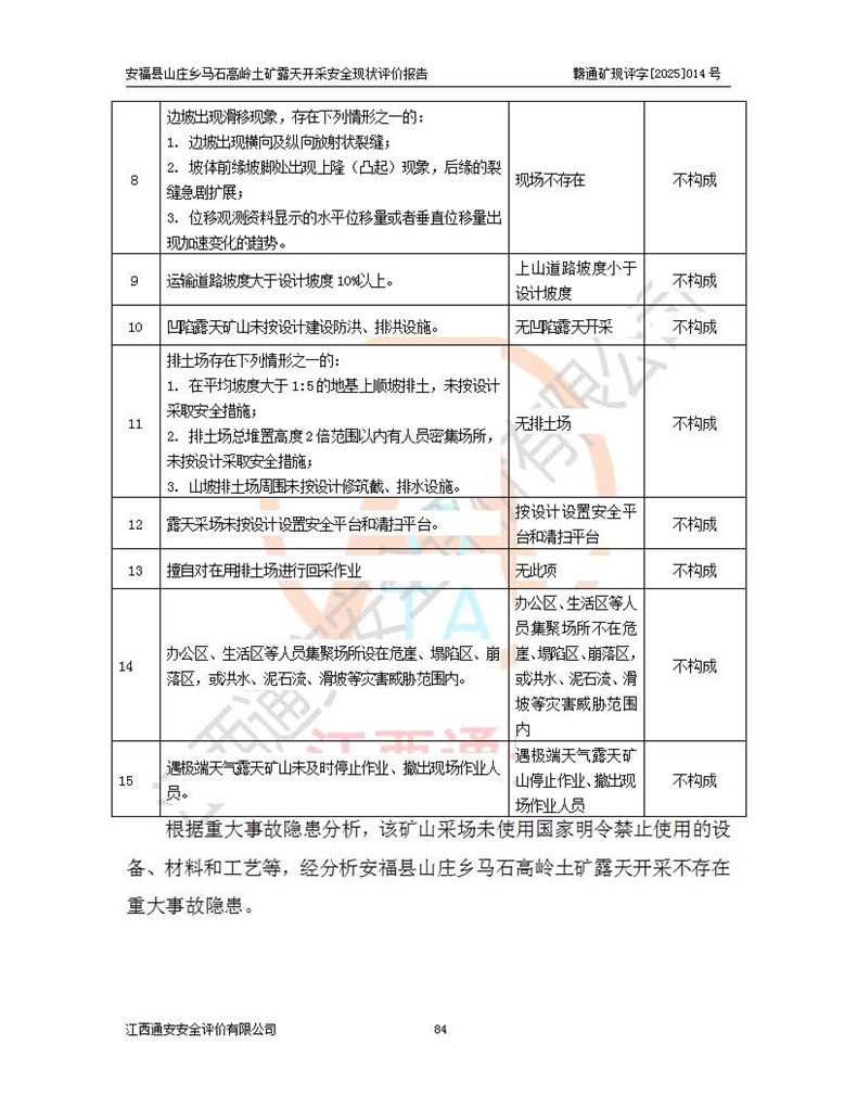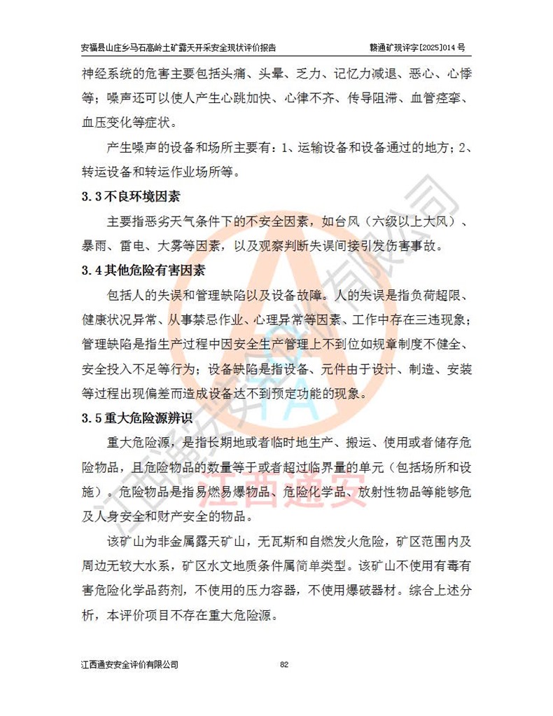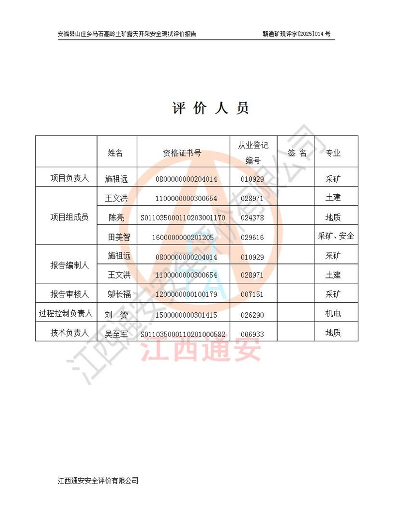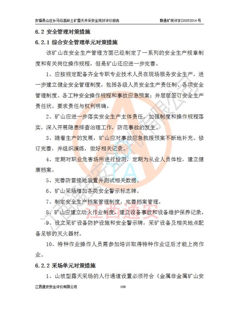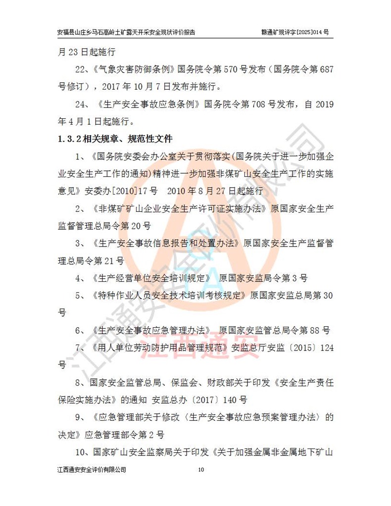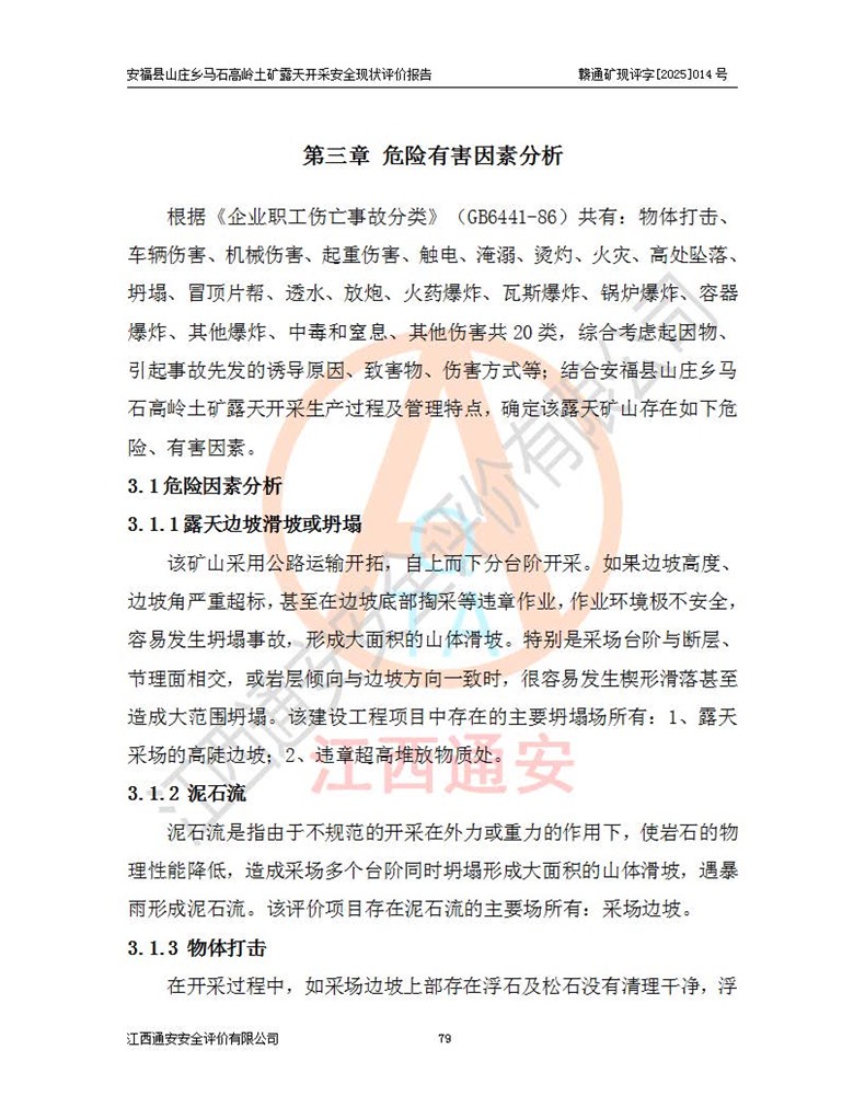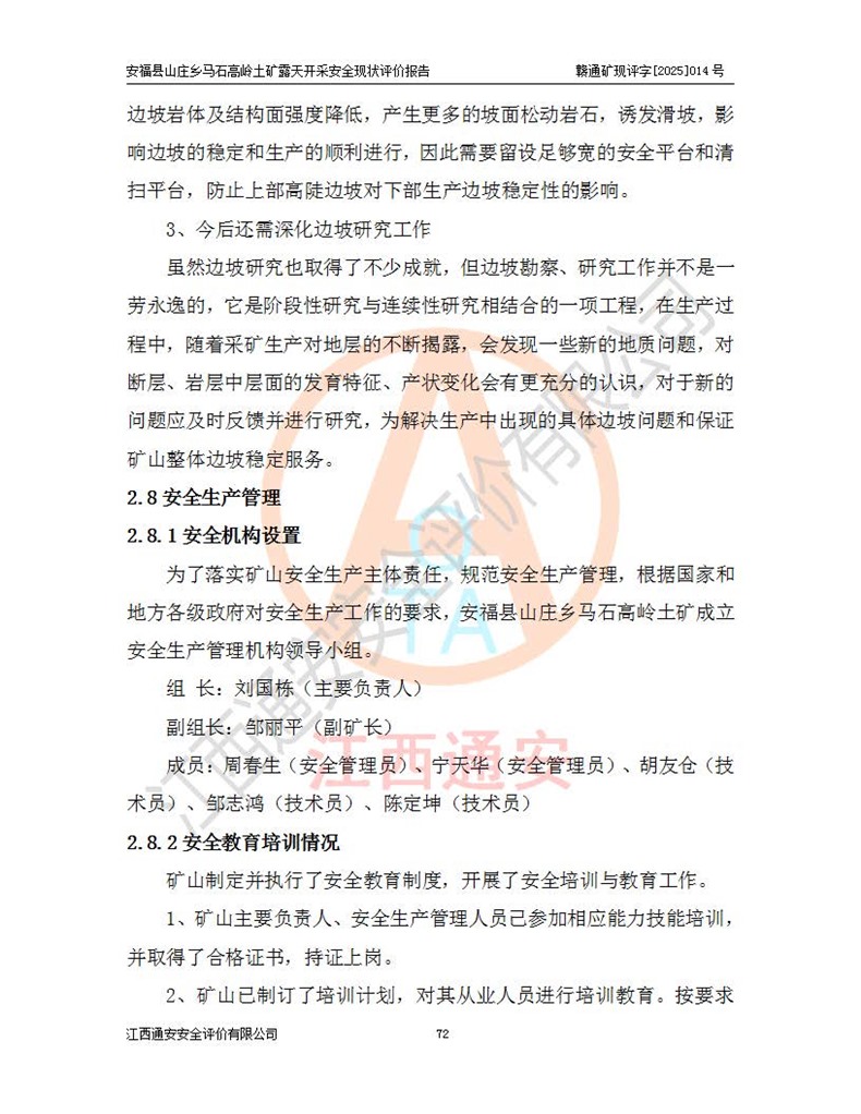 安福县福吉矿业有限公司成立于2008年7月8日,地址位于江西省吉安市安福县山庄乡东头村五组,注册资金:1288.66万元,营业执照统一社会信用代码:9136082969683448X,营业期限:2008年7月8日至长期,企业类型为有限责任公司(自然人独资),法定**人为刘国栋,经营范围:高岭土开采、销售;矿产品(铁矿除外)加工、销售。 安福县山庄乡马石高岭土矿为安福县福吉矿业有限公司下属露天矿山,矿区位于安福县城北北东,直距县城12°方位约15km,行政区划属安福县山庄乡管辖,矿区地理坐标(2000坐标系):东经114°37′12″~114°38′32″,北纬27°30′37″~27°32′05″。矿区中心地理坐标:东经114°37′52″,北纬 27°31′14″。矿区有3km水泥公路通往山庄乡,并与安福-分宜公路相连,距安福县城18km。 马石高岭土矿成立于2008年,生产规模为2万吨/年,矿区面积2.3642平方**,开采深度280m至155m,矿区资源于2018年重新进行了核实,2019年6月由吉安市自然资源局重新核发了采矿许可证,矿区面积由原2.3642平方**调整至1.2016平方**,开采深度由330.3m至155m,生产规模由2万吨/年变更为50万吨/年。 因矿山生产规模扩大,根据《建设项目安全设施“三同时”监督管理办法》安监总局令第36号(77号令修改)的要求,矿山应履行安全设施扩建“三同时”手续,安福县福吉矿业有限公司分别委托内蒙古吉安劳动安全评价有限责任公司和山东乾舜矿冶科技股份有限公司对马石高岭土矿扩建工程进行了安全预评价及安全设施设计。 2021年10月16日安全设施设计通过了安福县应急管理局组织的专家评审,2021年11月18日,安福县应急管理局下发了《关于安福县福吉矿业有限公司安福县山庄乡马石高岭土矿露天开采扩建工程安全设施设计审查意见》安应急字[2021]59号)。 马石高岭土矿于2021年12月开始了基建工程,期间因征地原因,设计开采范围发生了变化,2022年4月,安福县福吉矿业有限公司委托山东乾舜矿冶科技股份有限公司编制了《安福县福吉矿业有限公司安福县山庄乡马石高岭土矿露天开采扩建工程变更设计》,2022年4月24日变更设计通过了安福县应急管理局组织的专家评审,2022年5月18日,安福县应急管理局下发了《关于安福县福吉矿业有限公司安福县山庄乡马石高岭土矿露天开采扩建工程安全设施设计变更审查意见》安应急字[2022]30号)。 2022年8月,安福县山庄乡马石高岭土矿露天开采扩建工程通过验收,2022年9月9日,矿山取得了安福县应急管理局颁发的安全生产许可证,编号:(赣)FM安许证字[2022]DAF02号。**期:2022年9月9日至2025年9月8日。 2024年10月25日,安福县应急管理局现场检查时,发现安福县山庄乡马石高岭土矿存在2条违法违规行为和事故隐患,并存在5条其他问题,安福县应急管理局开具了《安全生产行政执法文书现场处理措施决定书》(安福)应急现决(2024)非煤007号,《安全生产行政执法文书责令限期整改指令书》(安福)应急责改(2024)058号;2024年11月15日,安福县应急管理局开具了《安全生产行政执法文书行政处罚决定书》(安福)应急罚(2024)非煤-4号;并处人民币贰万伍仟元罚款的行政处罚。 随着正常的生产,矿山企业发现矿区Ⅰ-2矿体西部及Ⅰ-2矿体东部的矿体难以达到工业品味的需求,经矿山企业商讨后决定:放弃对Ⅰ-2矿体西部及Ⅰ-2矿体东部的开采,仅开采Ⅰ-2矿体南部,并于2025年3月委托山东乾舜矿冶科技股份有限公司编制了《安福县福吉矿业有限公司安福县山庄乡马石高岭土矿露天开采Ⅰ-2矿体开采设计》。 依照《非煤矿矿山企业安全生产许可证延期换证工作》的通知,根据***《安全生产许可证条例》、《江西省安全生产条例》、《非煤矿山安全生产许可证实施办法》、《江西省非煤矿矿山企业安全生产许可证办法》规定及非煤矿山安全评价导则的要求,受安福县福吉矿业有限公司的委托,我公司承担安福县山庄乡马石高岭土矿露天开采延期换证的安全现状评价工作。  |