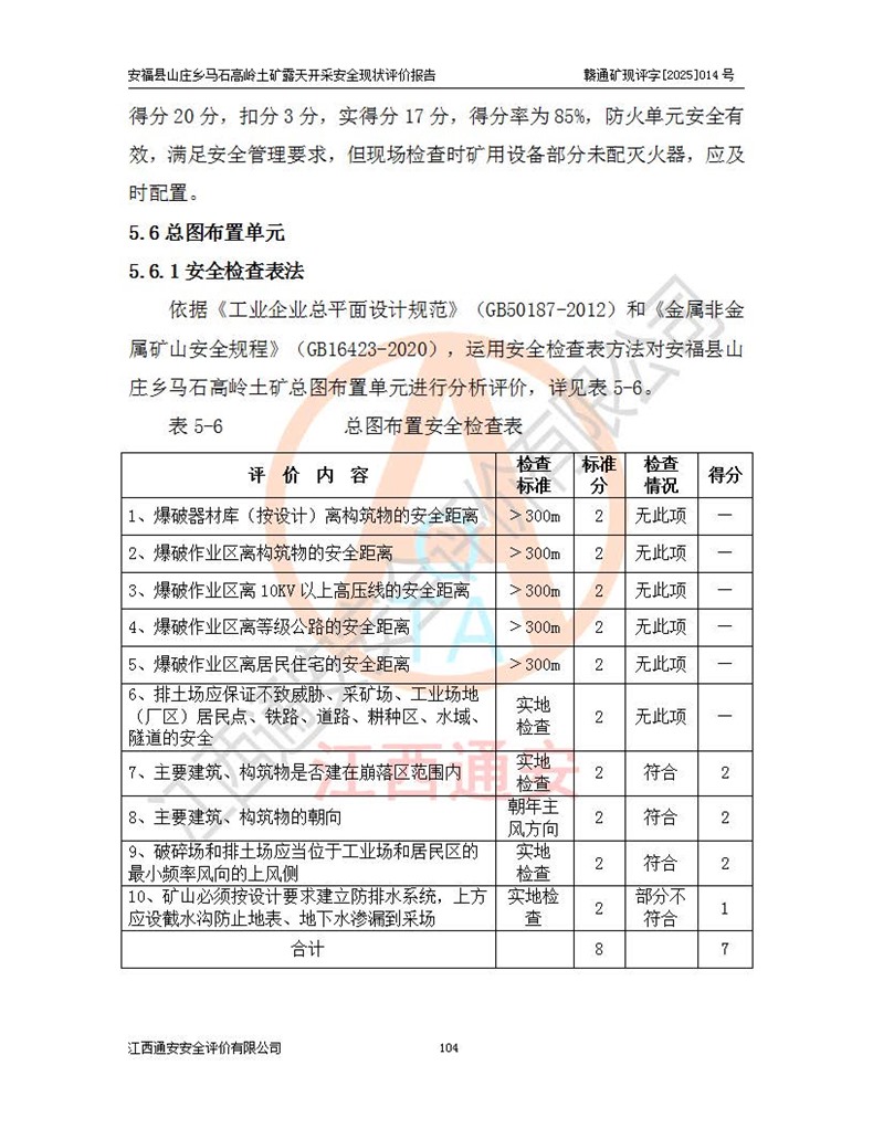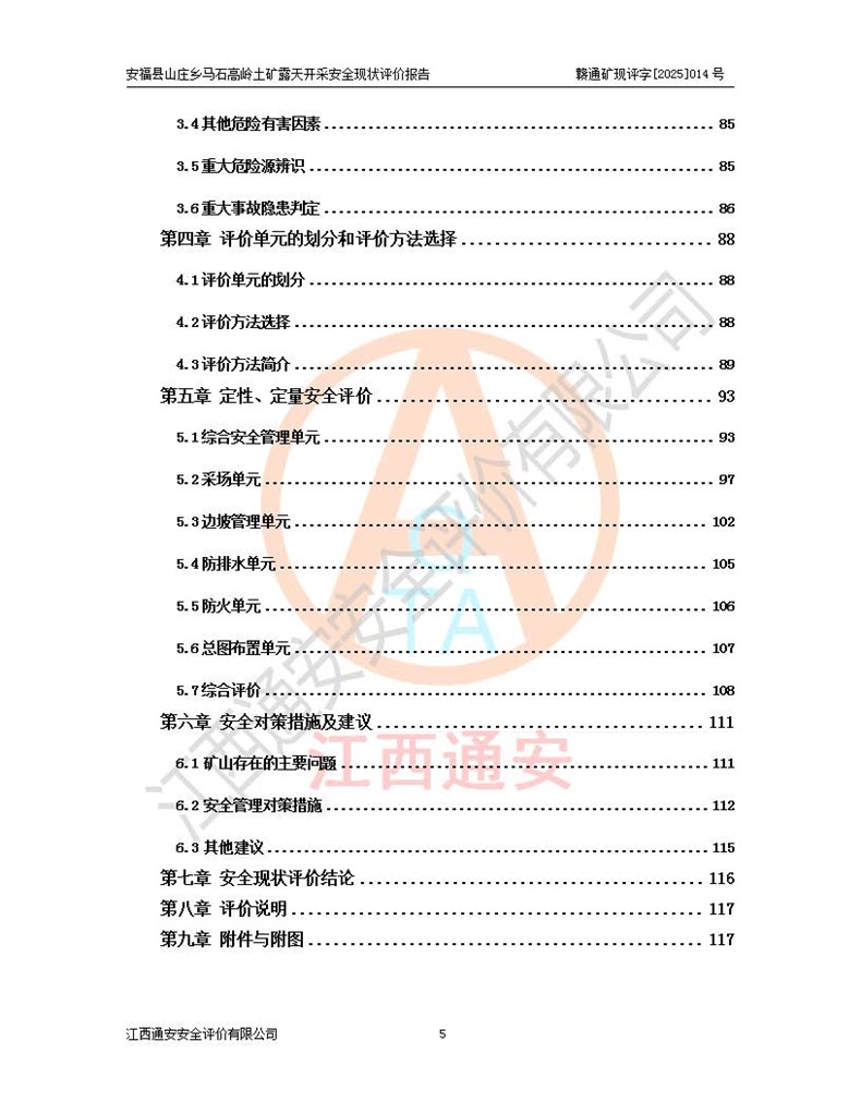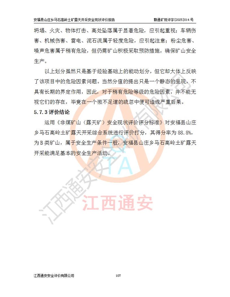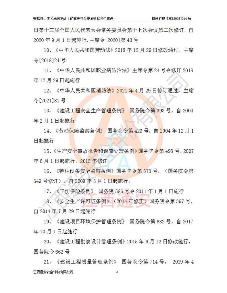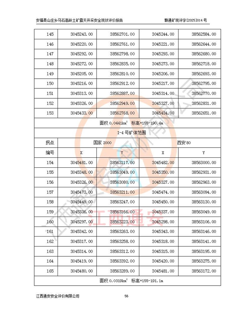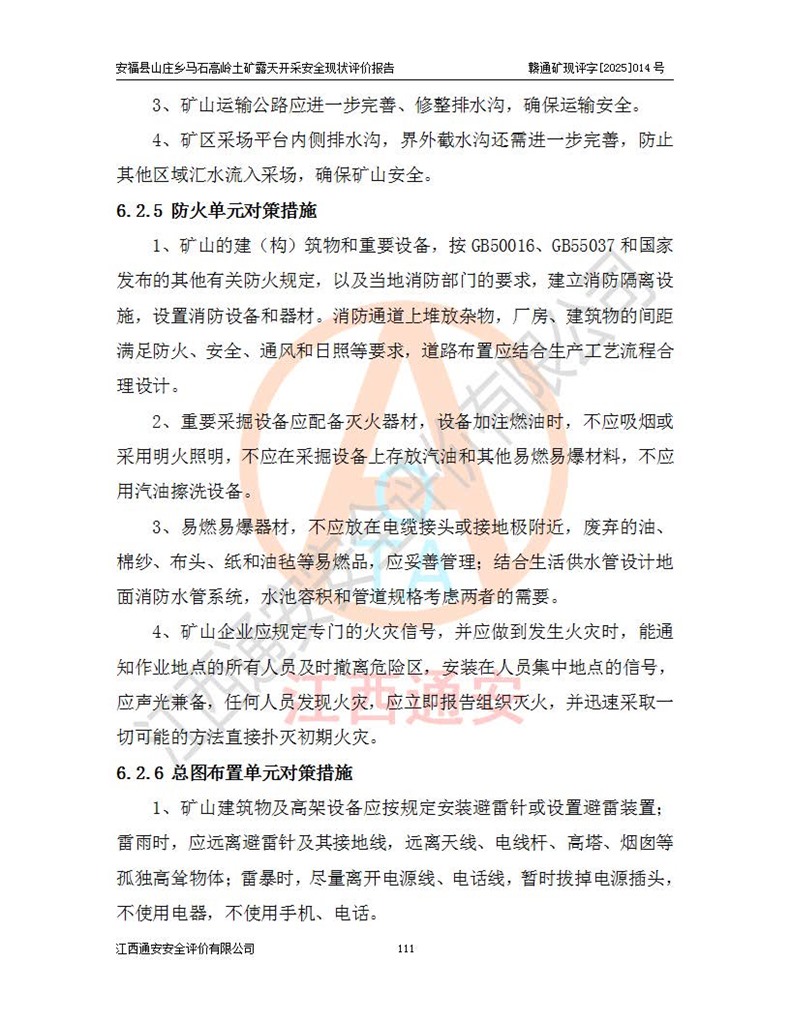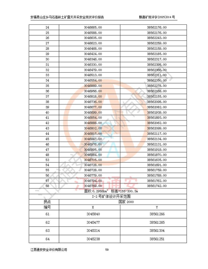 安福县福吉矿业有限公司成立于2008年7月8日,地址位于江西省吉安市安福县山庄乡东头村五组,注册资金:1288.66万元,营业执照统一社会信用代码:9136082969683448X,营业期限:2008年7月8日至长期,企业类型为有限责任公司(自然人独资),法定**人为刘国栋,经营范围:高岭土开采、销售;矿产品(铁矿除外)加工、销售。 安福县山庄乡马石高岭土矿为安福县福吉矿业有限公司下属露天矿山,矿区位于安福县城北北东,直距县城12°方位约15km,行政区划属安福县山庄乡管辖,矿区地理坐标(2000坐标系):东经114°37′12″~114°38′32″,北纬27°30′37″~27°32′05″。矿区中心地理坐标:东经114°37′52″,北纬 27°31′14″。矿区有3km水泥公路通往山庄乡,并与安福-分宜公路相连,距安福县城18km。 马石高岭土矿成立于2008年,生产规模为2万吨/年,矿区面积2.3642平方**,开采深度280m至155m,矿区资源于2018年重新进行了核实,2019年6月由吉安市自然资源局重新核发了采矿许可证,矿区面积由原2.3642平方**调整至1.2016平方**,开采深度由330.3m至155m,生产规模由2万吨/年变更为50万吨/年。 因矿山生产规模扩大,根据《建设项目安全设施“三同时”监督管理办法》安监总局令第36号(77号令修改)的要求,矿山应履行安全设施扩建“三同时”手续,安福县福吉矿业有限公司分别委托内蒙古吉安劳动安全评价有限责任公司和山东乾舜矿冶科技股份有限公司对马石高岭土矿扩建工程进行了安全预评价及安全设施设计。 2021年10月16日安全设施设计通过了安福县应急管理局组织的专家评审,2021年11月18日,安福县应急管理局下发了《关于安福县福吉矿业有限公司安福县山庄乡马石高岭土矿露天开采扩建工程安全设施设计审查意见》安应急字[2021]59号)。 马石高岭土矿于2021年12月开始了基建工程,期间因征地原因,设计开采范围发生了变化,2022年4月,安福县福吉矿业有限公司委托山东乾舜矿冶科技股份有限公司编制了《安福县福吉矿业有限公司安福县山庄乡马石高岭土矿露天开采扩建工程变更设计》,2022年4月24日变更设计通过了安福县应急管理局组织的专家评审,2022年5月18日,安福县应急管理局下发了《关于安福县福吉矿业有限公司安福县山庄乡马石高岭土矿露天开采扩建工程安全设施设计变更审查意见》安应急字[2022]30号)。 2022年8月,安福县山庄乡马石高岭土矿露天开采扩建工程通过验收,2022年9月9日,矿山取得了安福县应急管理局颁发的安全生产许可证,编号:(赣)FM安许证字[2022]DAF02号。**期:2022年9月9日至2025年9月8日。 2024年10月25日,安福县应急管理局现场检查时,发现安福县山庄乡马石高岭土矿存在2条违法违规行为和事故隐患,并存在5条其他问题,安福县应急管理局开具了《安全生产行政执法文书现场处理措施决定书》(安福)应急现决(2024)非煤007号,《安全生产行政执法文书责令限期整改指令书》(安福)应急责改(2024)058号;2024年11月15日,安福县应急管理局开具了《安全生产行政执法文书行政处罚决定书》(安福)应急罚(2024)非煤-4号;并处人民币贰万伍仟元罚款的行政处罚。 随着正常的生产,矿山企业发现矿区Ⅰ-2矿体西部及Ⅰ-2矿体东部的矿体难以达到工业品味的需求,经矿山企业商讨后决定:放弃对Ⅰ-2矿体西部及Ⅰ-2矿体东部的开采,仅开采Ⅰ-2矿体南部,并于2025年3月委托山东乾舜矿冶科技股份有限公司编制了《安福县福吉矿业有限公司安福县山庄乡马石高岭土矿露天开采Ⅰ-2矿体开采设计》。 依照《非煤矿矿山企业安全生产许可证延期换证工作》的通知,根据***《安全生产许可证条例》、《江西省安全生产条例》、《非煤矿山安全生产许可证实施办法》、《江西省非煤矿矿山企业安全生产许可证办法》规定及非煤矿山安全评价导则的要求,受安福县福吉矿业有限公司的委托,我公司承担安福县山庄乡马石高岭土矿露天开采延期换证的安全现状评价工作。  |