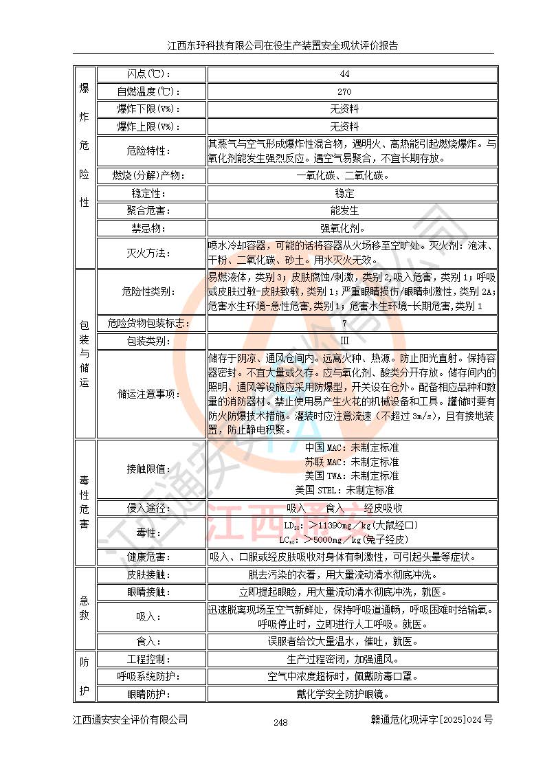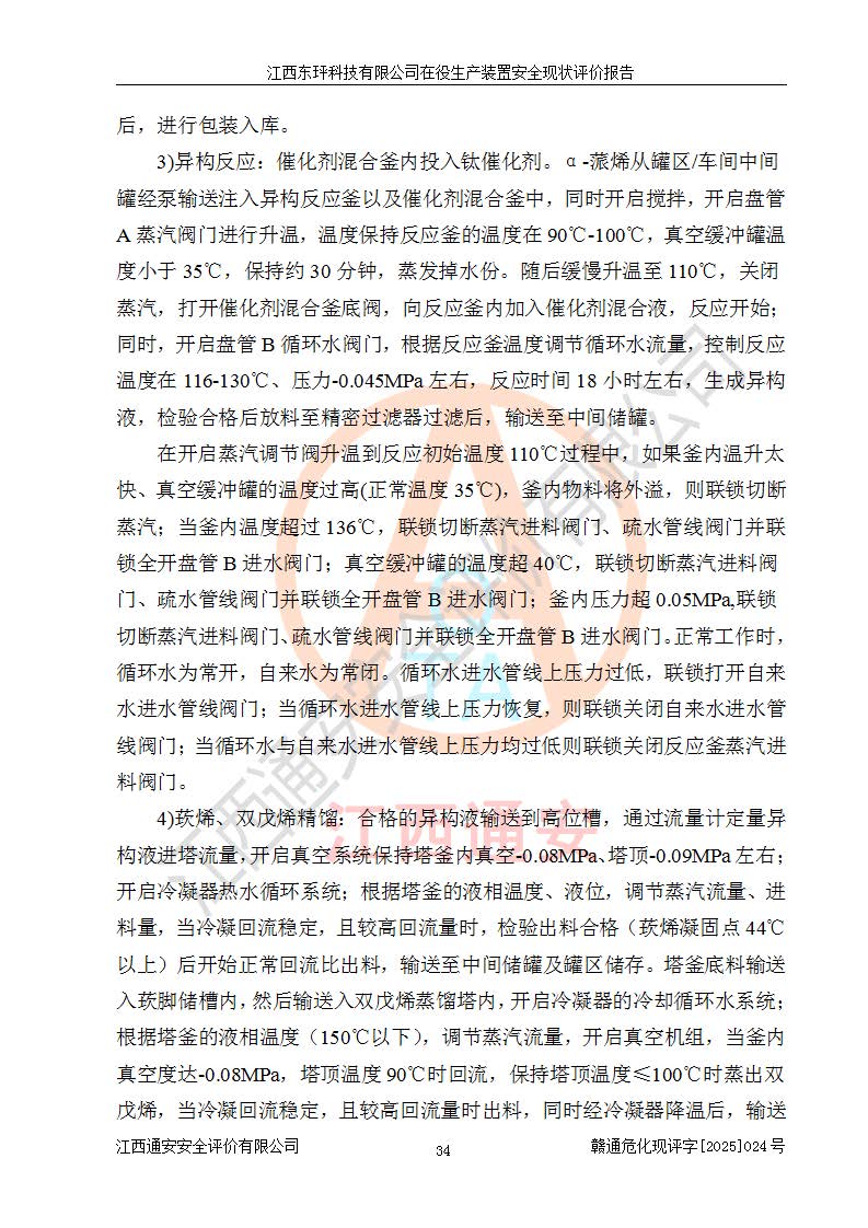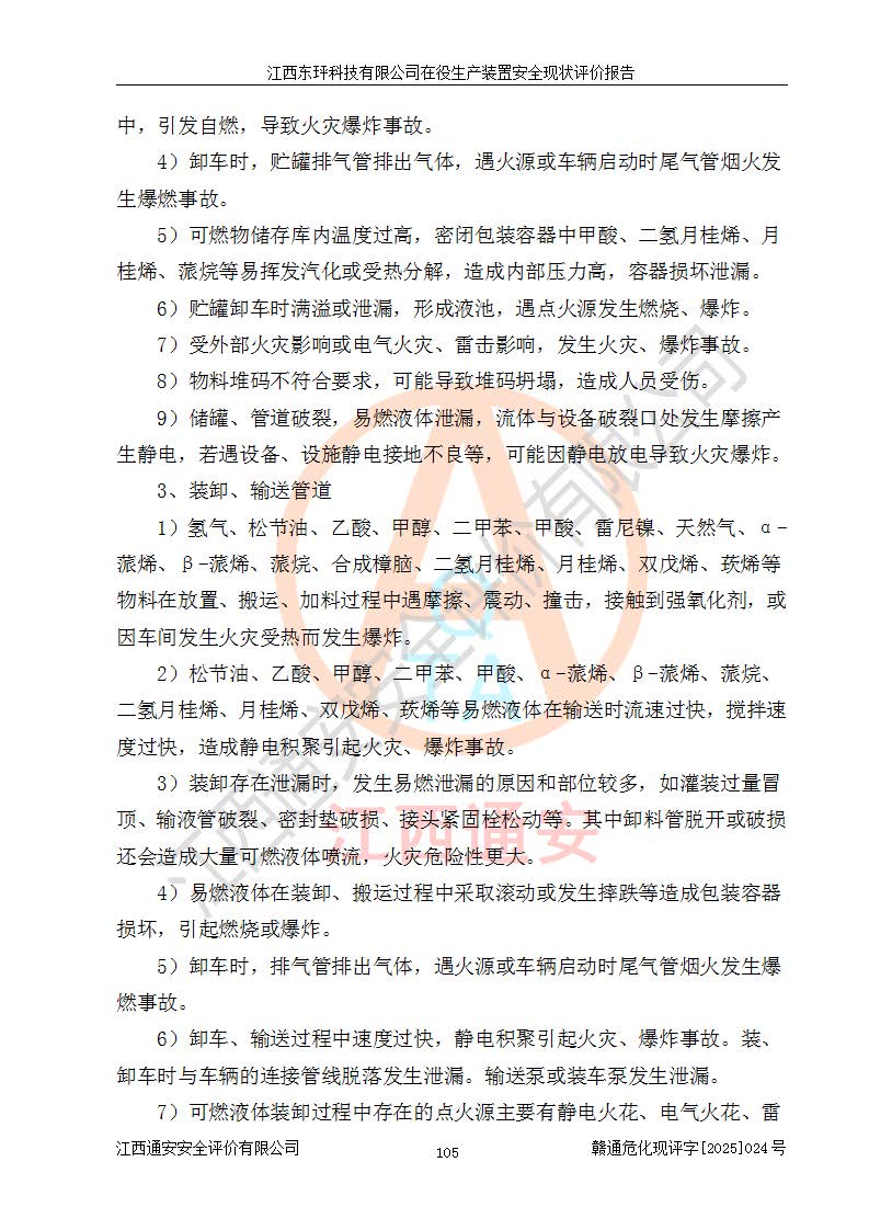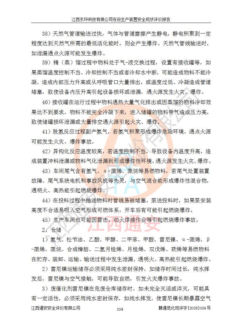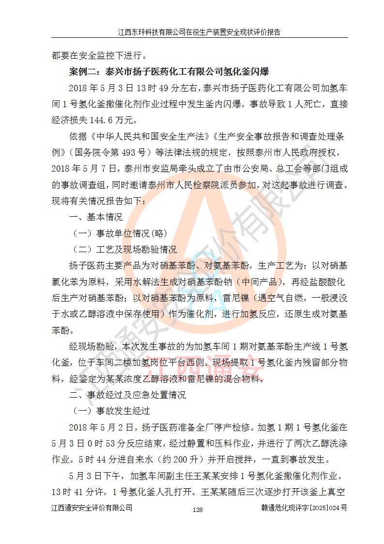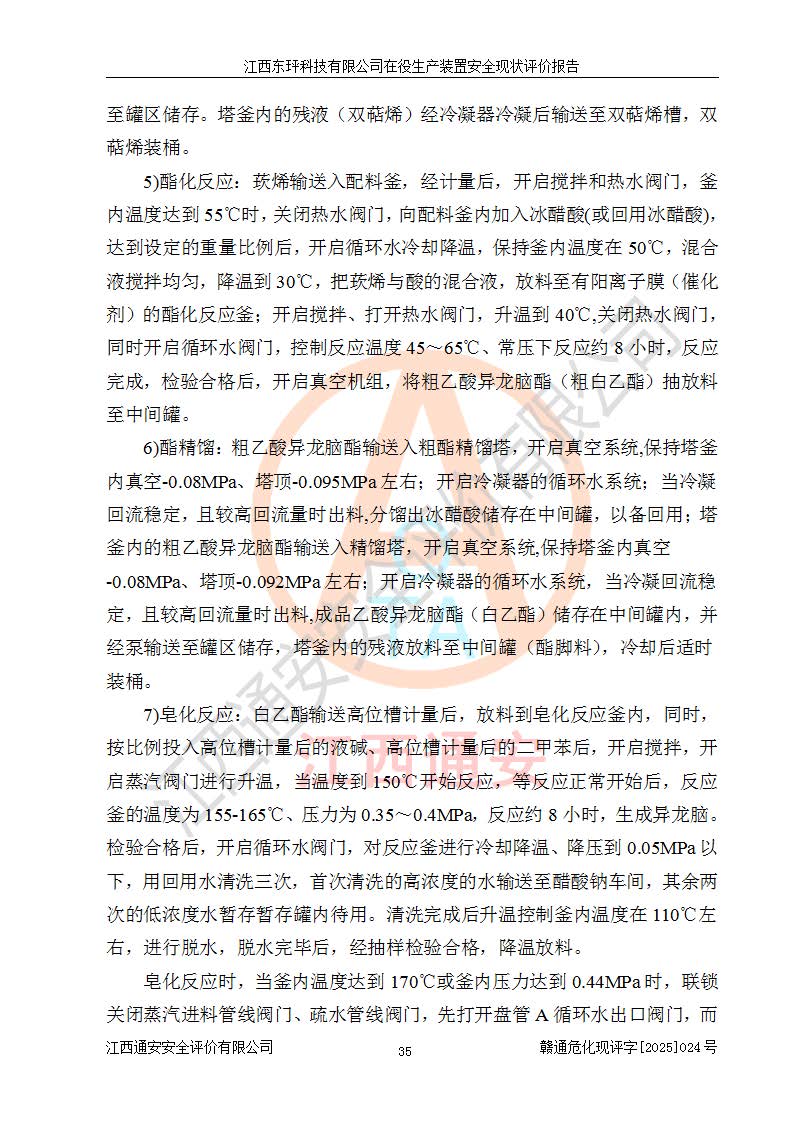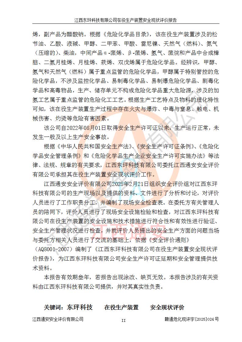 江西东玶科技有限公司位于江西省吉安市吉水县城西工业园区,法定**人为徐东,成立于2018年04月08日,注册资本叁仟贰佰叁拾万元整,经营范围为合成樟脑、α-蒎烯、β-蒎烯、二氢月桂烯(含月桂烯)、莰烯、双戊烯、氢气(中间产品)的制造加工(凭**批准证书经营);白乙酯、双萜烯等合成香料的制造加工等。 江西东玶科技有限公司2022年08月01日取得了《安全生产许可证》,许可证编号:(赣)WH安许证字[2022]1160号,许可范围为合成樟脑(2000t/a)、二氢月桂烯(1000t/a)、月桂烯(3200t/a)、莰烯(1000t/a)、双戊烯(810t/a)、双萜烯(1070t/a)、α-蒎烯(7500t/a)、β-蒎烯(3200t/a)、白乙酯(500t/a),**期为2022年08月01日至2025年07月31日。该公司2023年5月29日取得了三级安全生产标准化证书,证书编号:赣AQBWHⅢ202300036,**期至2026年5月。该公司现有员工53人,其中专职安全生产管理人员2人。 因生产经营需要,江西东玶科技有限公司实施了年产12000吨松节油深加工系列产品项目(二期),并将二氢月桂烯的设计生产规模2000t/a变更为1500t/a,减少中间产品蒎烷的消耗量,剩余的蒎烷(720t/a)作为产品销售。江西东玶科技有限公司委托深圳天阳工程设计有限公司进行了设计变更,按程序要求进行了试生产,委托评价公司编制了安全验收评价报告,并于2025年1月16日组织专家组和相关单位进行了验收。验收完成后,江西东玶科技有限公司2025年06月04日对《安全生产许可证》进行了变更,许可范围变更为合成樟脑(2000t/a)、二氢月桂烯(1500t/a)、月桂烯(3200t/a)、莰烯(1000t/a)、双戊烯(902.5t/a)、双萜烯(1200.7t/a)、α-蒎烯(7500t/a)、β-蒎烯(3200t/a)、白乙酯(500t/a)、蒎烷(中间产品,720t/a)。 江西东玶科技有限公司在役生产装置生产过程中涉及的主要原辅材料为松节油、乙酸、液碱、甲醇、碳酸钠、二甲苯、偏钛酸、甲酸、硫酸铜、雷尼镍、离子膜、天然气、氮气,中间产品为氢气、α-蒎烯、β-蒎烯、蒎烷,产品为合成樟脑、二氢月桂烯、月桂烯、莰烯、双戊烯、白乙酯、双萜烯,副产品为醋酸钠。根据《危险化学品目录》,该在役生产装置涉及的松节油、乙酸、液碱、甲醇、二甲苯、甲酸、雷尼镍、天然气(燃料)、氮气(压缩的)、柴油,中间产品α-蒎烯、β-蒎烯、氢气、蒎烷和产品中合成樟脑、二氢月桂烯、月桂烯、莰烯、双戊烯属于危险化学品。经辨识,甲醇、氢气和天然气(燃料)属于重点监管的危险化学品,甲醇属于特别管控的危险化学品,不涉及监控化学品、易制毒化学品、易制爆危险化学品、剧毒化学品和高毒物品,生产、储存单元不构成危险化学品重大危险源,涉及的加氢工艺属于重点监管的危险化工工艺。根据生产工艺特点及物料的理化特性可知,该在役生产装置生产过程中存在火灾与爆炸、中毒与窒息、触电、机械伤害、灼烫等危险有害因素。 该公司自2022年08月01日取得安全生产许可证以来,生产运行正常,未发生一般及以上生产安全事故。 |