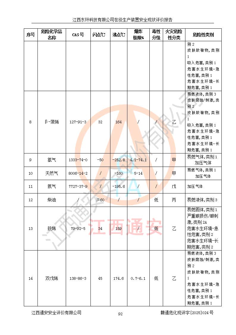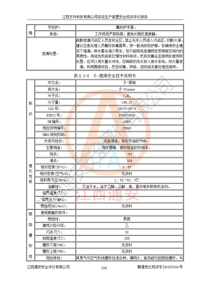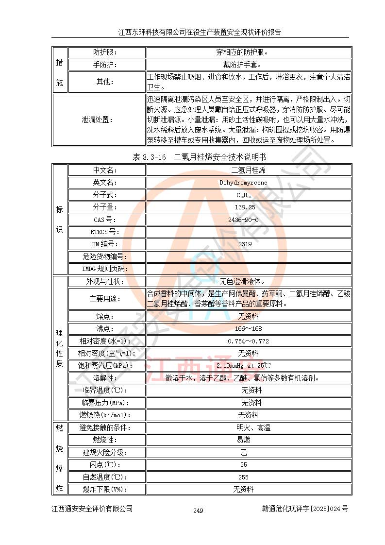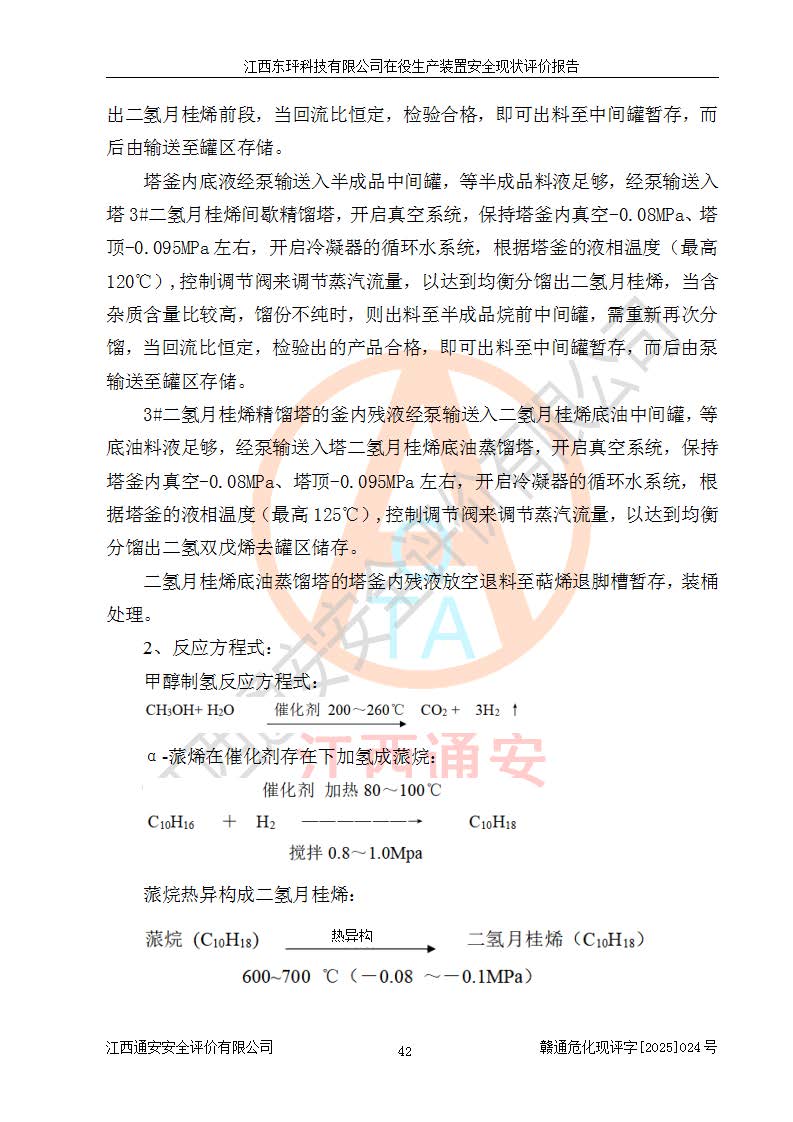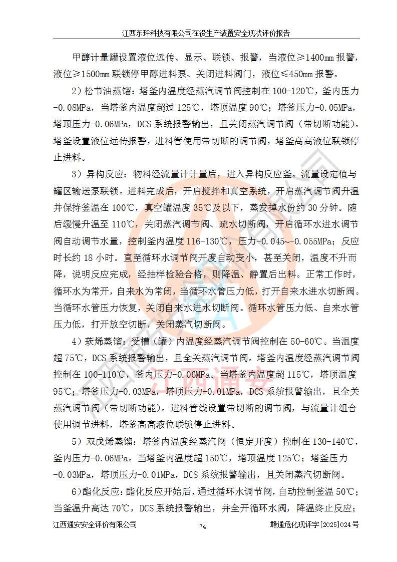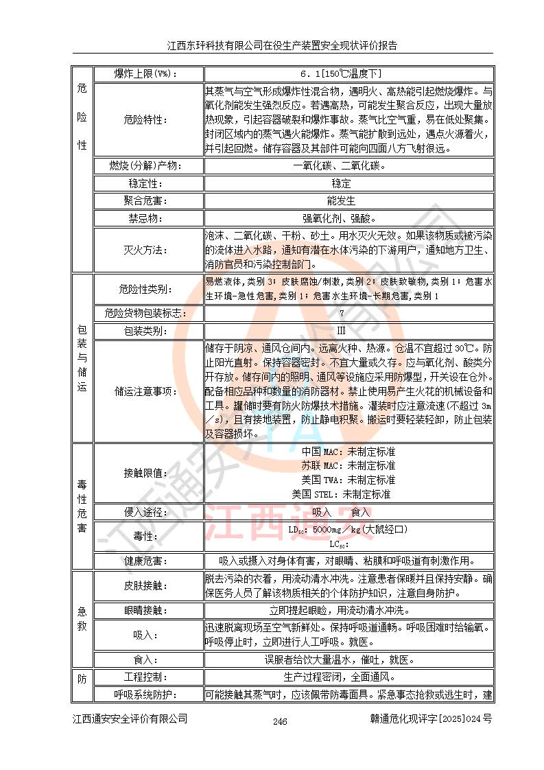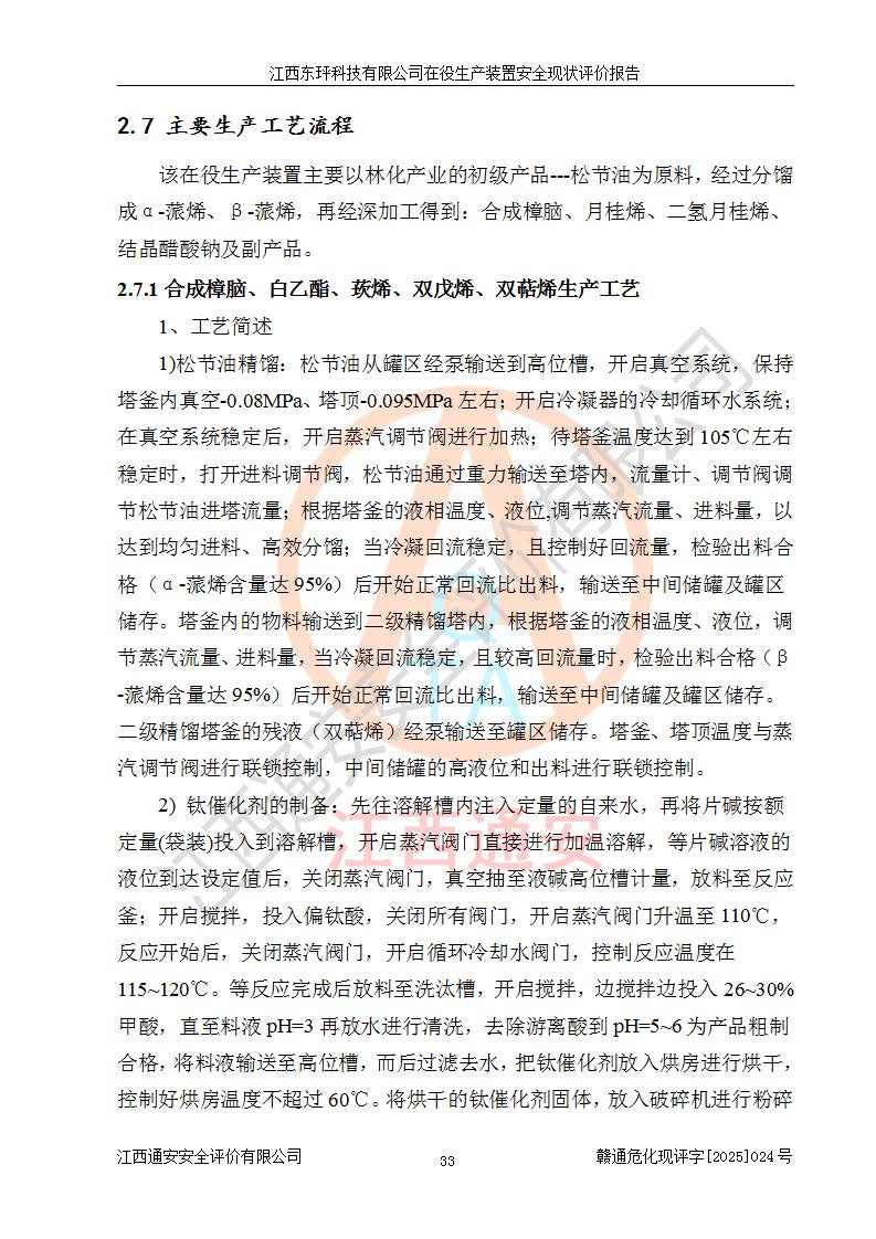 江西东玶科技有限公司位于江西省吉安市吉水县城西工业园区,法定**人为徐东,成立于2018年04月08日,注册资本叁仟贰佰叁拾万元整,经营范围为合成樟脑、α-蒎烯、β-蒎烯、二氢月桂烯(含月桂烯)、莰烯、双戊烯、氢气(中间产品)的制造加工(凭**批准证书经营);白乙酯、双萜烯等合成香料的制造加工等。 江西东玶科技有限公司2022年08月01日取得了《安全生产许可证》,许可证编号:(赣)WH安许证字[2022]1160号,许可范围为合成樟脑(2000t/a)、二氢月桂烯(1000t/a)、月桂烯(3200t/a)、莰烯(1000t/a)、双戊烯(810t/a)、双萜烯(1070t/a)、α-蒎烯(7500t/a)、β-蒎烯(3200t/a)、白乙酯(500t/a),**期为2022年08月01日至2025年07月31日。该公司2023年5月29日取得了三级安全生产标准化证书,证书编号:赣AQBWHⅢ202300036,**期至2026年5月。该公司现有员工53人,其中专职安全生产管理人员2人。 因生产经营需要,江西东玶科技有限公司实施了年产12000吨松节油深加工系列产品项目(二期),并将二氢月桂烯的设计生产规模2000t/a变更为1500t/a,减少中间产品蒎烷的消耗量,剩余的蒎烷(720t/a)作为产品销售。江西东玶科技有限公司委托深圳天阳工程设计有限公司进行了设计变更,按程序要求进行了试生产,委托评价公司编制了安全验收评价报告,并于2025年1月16日组织专家组和相关单位进行了验收。验收完成后,江西东玶科技有限公司2025年06月04日对《安全生产许可证》进行了变更,许可范围变更为合成樟脑(2000t/a)、二氢月桂烯(1500t/a)、月桂烯(3200t/a)、莰烯(1000t/a)、双戊烯(902.5t/a)、双萜烯(1200.7t/a)、α-蒎烯(7500t/a)、β-蒎烯(3200t/a)、白乙酯(500t/a)、蒎烷(中间产品,720t/a)。 江西东玶科技有限公司在役生产装置生产过程中涉及的主要原辅材料为松节油、乙酸、液碱、甲醇、碳酸钠、二甲苯、偏钛酸、甲酸、硫酸铜、雷尼镍、离子膜、天然气、氮气,中间产品为氢气、α-蒎烯、β-蒎烯、蒎烷,产品为合成樟脑、二氢月桂烯、月桂烯、莰烯、双戊烯、白乙酯、双萜烯,副产品为醋酸钠。根据《危险化学品目录》,该在役生产装置涉及的松节油、乙酸、液碱、甲醇、二甲苯、甲酸、雷尼镍、天然气(燃料)、氮气(压缩的)、柴油,中间产品α-蒎烯、β-蒎烯、氢气、蒎烷和产品中合成樟脑、二氢月桂烯、月桂烯、莰烯、双戊烯属于危险化学品。经辨识,甲醇、氢气和天然气(燃料)属于重点监管的危险化学品,甲醇属于特别管控的危险化学品,不涉及监控化学品、易制毒化学品、易制爆危险化学品、剧毒化学品和高毒物品,生产、储存单元不构成危险化学品重大危险源,涉及的加氢工艺属于重点监管的危险化工工艺。根据生产工艺特点及物料的理化特性可知,该在役生产装置生产过程中存在火灾与爆炸、中毒与窒息、触电、机械伤害、灼烫等危险有害因素。 该公司自2022年08月01日取得安全生产许可证以来,生产运行正常,未发生一般及以上生产安全事故。 |