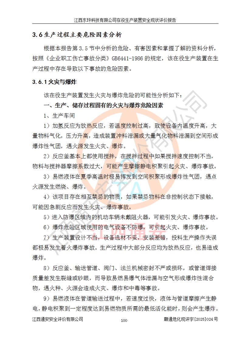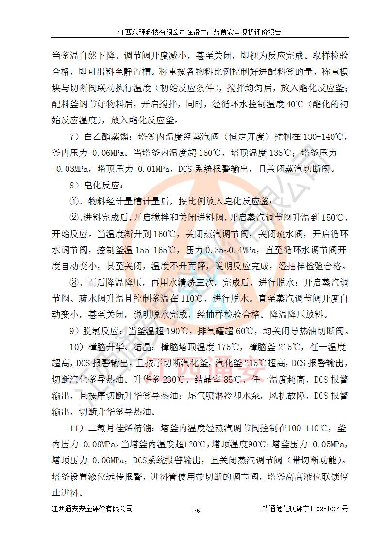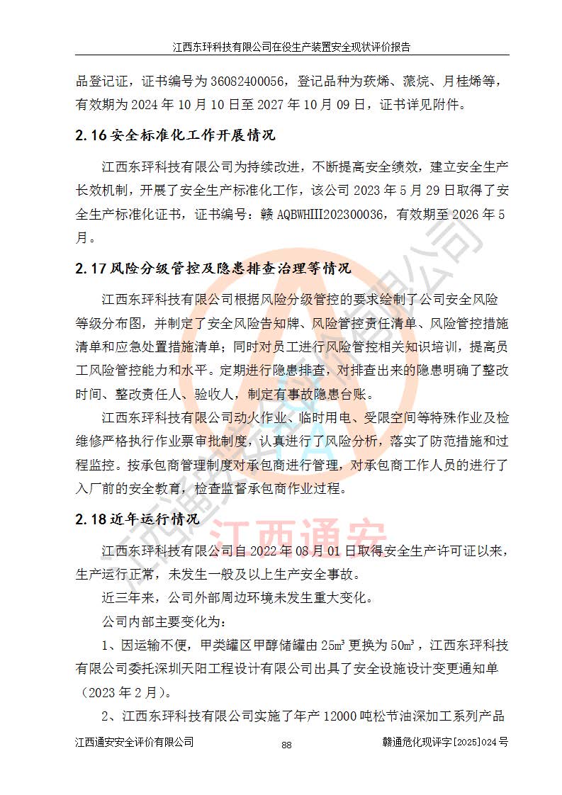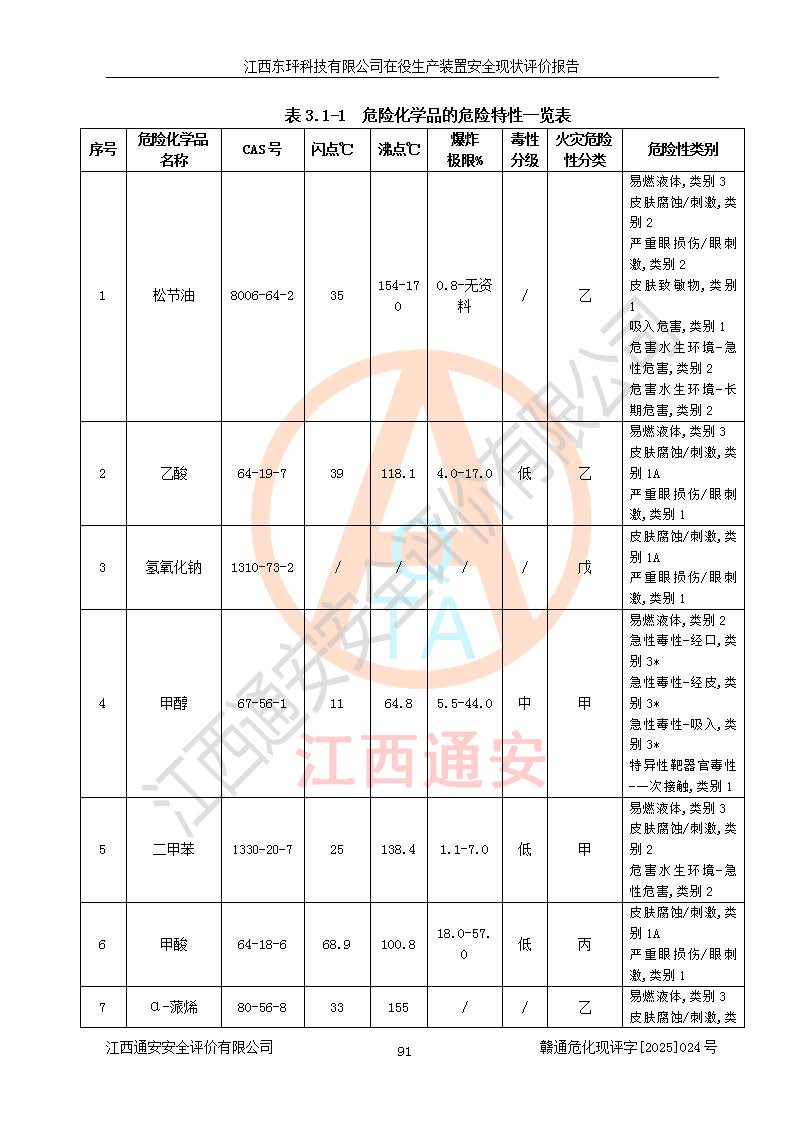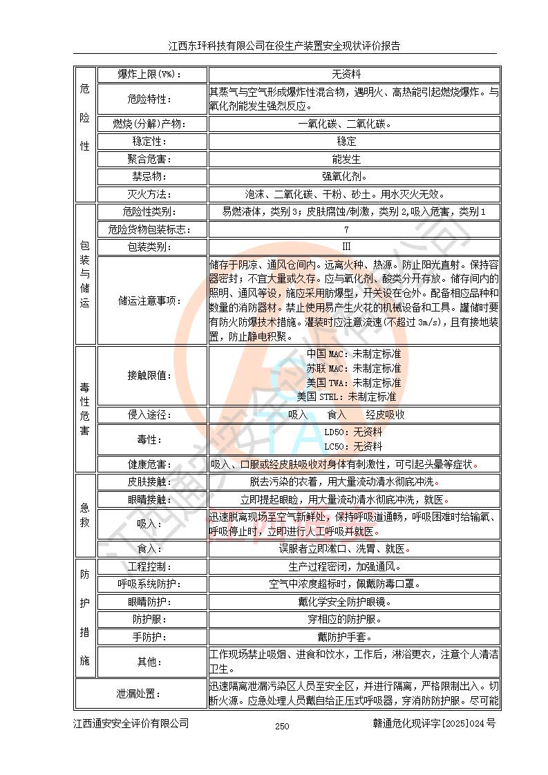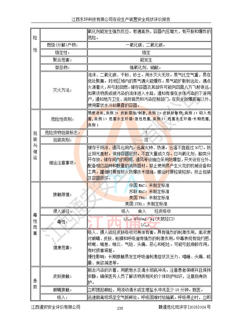 江西东玶科技有限公司位于江西省吉安市吉水县城西工业园区,法定**人为徐东,成立于2018年04月08日,注册资本叁仟贰佰叁拾万元整,经营范围为合成樟脑、α-蒎烯、β-蒎烯、二氢月桂烯(含月桂烯)、莰烯、双戊烯、氢气(中间产品)的制造加工(凭**批准证书经营);白乙酯、双萜烯等合成香料的制造加工等。 江西东玶科技有限公司2022年08月01日取得了《安全生产许可证》,许可证编号:(赣)WH安许证字[2022]1160号,许可范围为合成樟脑(2000t/a)、二氢月桂烯(1000t/a)、月桂烯(3200t/a)、莰烯(1000t/a)、双戊烯(810t/a)、双萜烯(1070t/a)、α-蒎烯(7500t/a)、β-蒎烯(3200t/a)、白乙酯(500t/a),**期为2022年08月01日至2025年07月31日。该公司2023年5月29日取得了三级安全生产标准化证书,证书编号:赣AQBWHⅢ202300036,**期至2026年5月。该公司现有员工53人,其中专职安全生产管理人员2人。 因生产经营需要,江西东玶科技有限公司实施了年产12000吨松节油深加工系列产品项目(二期),并将二氢月桂烯的设计生产规模2000t/a变更为1500t/a,减少中间产品蒎烷的消耗量,剩余的蒎烷(720t/a)作为产品销售。江西东玶科技有限公司委托深圳天阳工程设计有限公司进行了设计变更,按程序要求进行了试生产,委托评价公司编制了安全验收评价报告,并于2025年1月16日组织专家组和相关单位进行了验收。验收完成后,江西东玶科技有限公司2025年06月04日对《安全生产许可证》进行了变更,许可范围变更为合成樟脑(2000t/a)、二氢月桂烯(1500t/a)、月桂烯(3200t/a)、莰烯(1000t/a)、双戊烯(902.5t/a)、双萜烯(1200.7t/a)、α-蒎烯(7500t/a)、β-蒎烯(3200t/a)、白乙酯(500t/a)、蒎烷(中间产品,720t/a)。 江西东玶科技有限公司在役生产装置生产过程中涉及的主要原辅材料为松节油、乙酸、液碱、甲醇、碳酸钠、二甲苯、偏钛酸、甲酸、硫酸铜、雷尼镍、离子膜、天然气、氮气,中间产品为氢气、α-蒎烯、β-蒎烯、蒎烷,产品为合成樟脑、二氢月桂烯、月桂烯、莰烯、双戊烯、白乙酯、双萜烯,副产品为醋酸钠。根据《危险化学品目录》,该在役生产装置涉及的松节油、乙酸、液碱、甲醇、二甲苯、甲酸、雷尼镍、天然气(燃料)、氮气(压缩的)、柴油,中间产品α-蒎烯、β-蒎烯、氢气、蒎烷和产品中合成樟脑、二氢月桂烯、月桂烯、莰烯、双戊烯属于危险化学品。经辨识,甲醇、氢气和天然气(燃料)属于重点监管的危险化学品,甲醇属于特别管控的危险化学品,不涉及监控化学品、易制毒化学品、易制爆危险化学品、剧毒化学品和高毒物品,生产、储存单元不构成危险化学品重大危险源,涉及的加氢工艺属于重点监管的危险化工工艺。根据生产工艺特点及物料的理化特性可知,该在役生产装置生产过程中存在火灾与爆炸、中毒与窒息、触电、机械伤害、灼烫等危险有害因素。 该公司自2022年08月01日取得安全生产许可证以来,生产运行正常,未发生一般及以上生产安全事故。 |